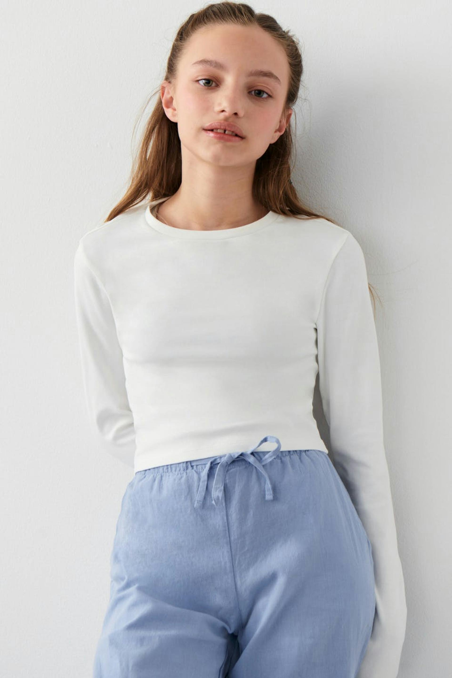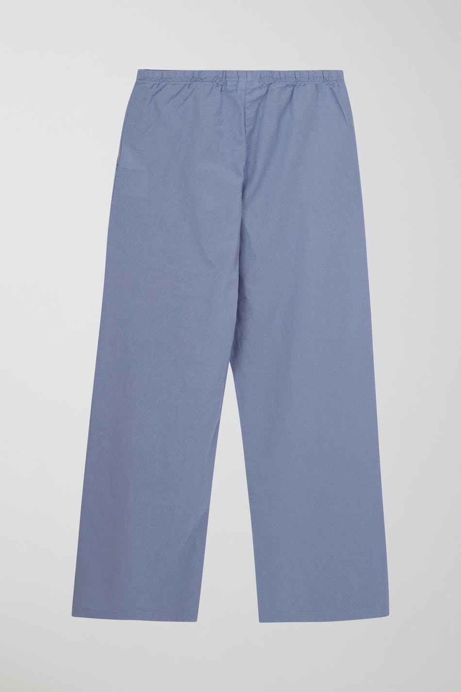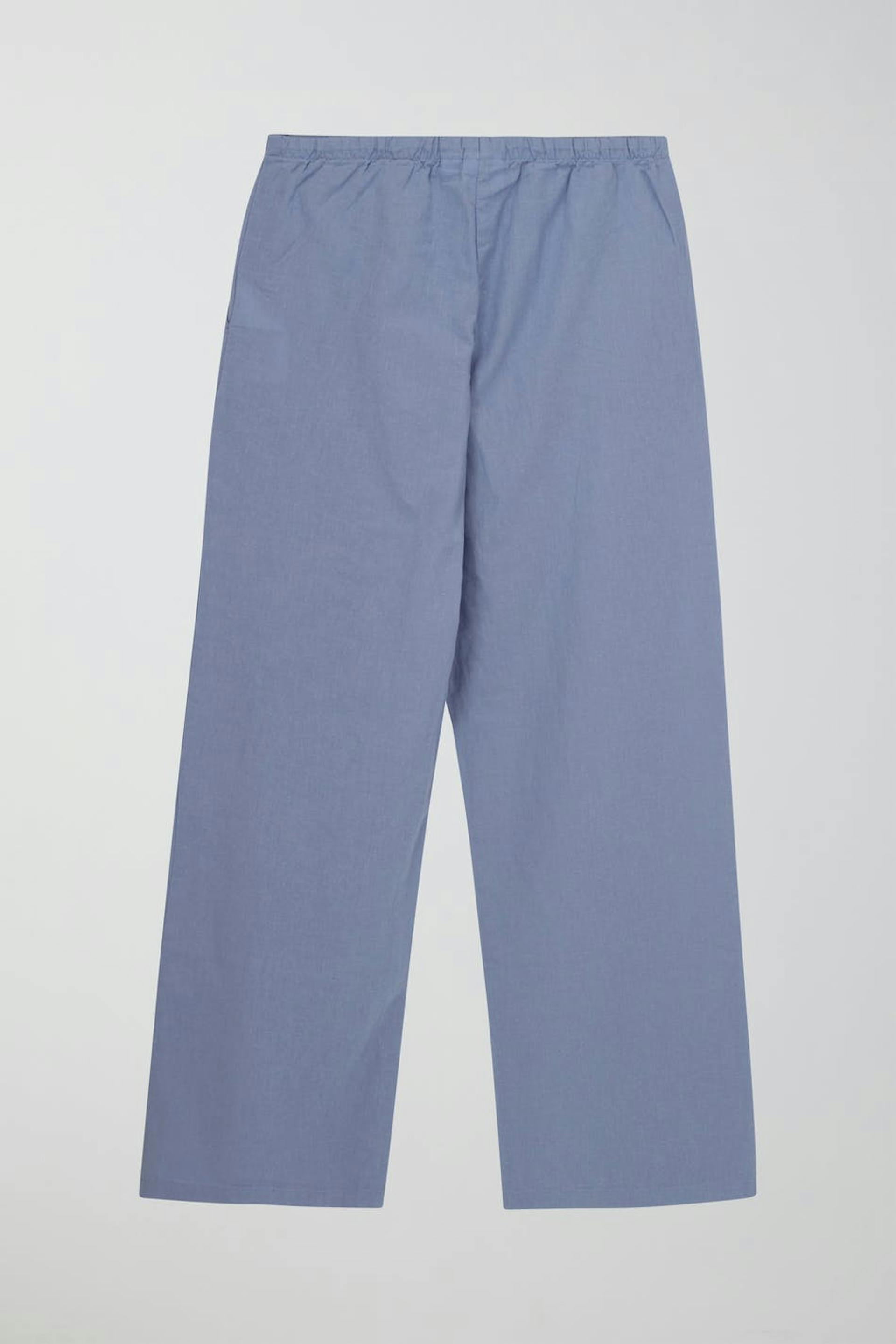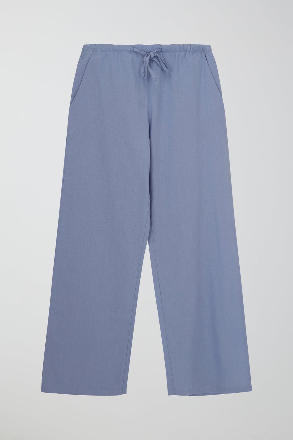 Leinenhosen von Gina Tricot Young mit lockerer Passform. Die Leinenhosen sind blau und haben eine weiche, gewebte Qualität. Sie haben breite Beine, Seitentaschen und Gummiband in der Taille mit Selbstbindung vorne.