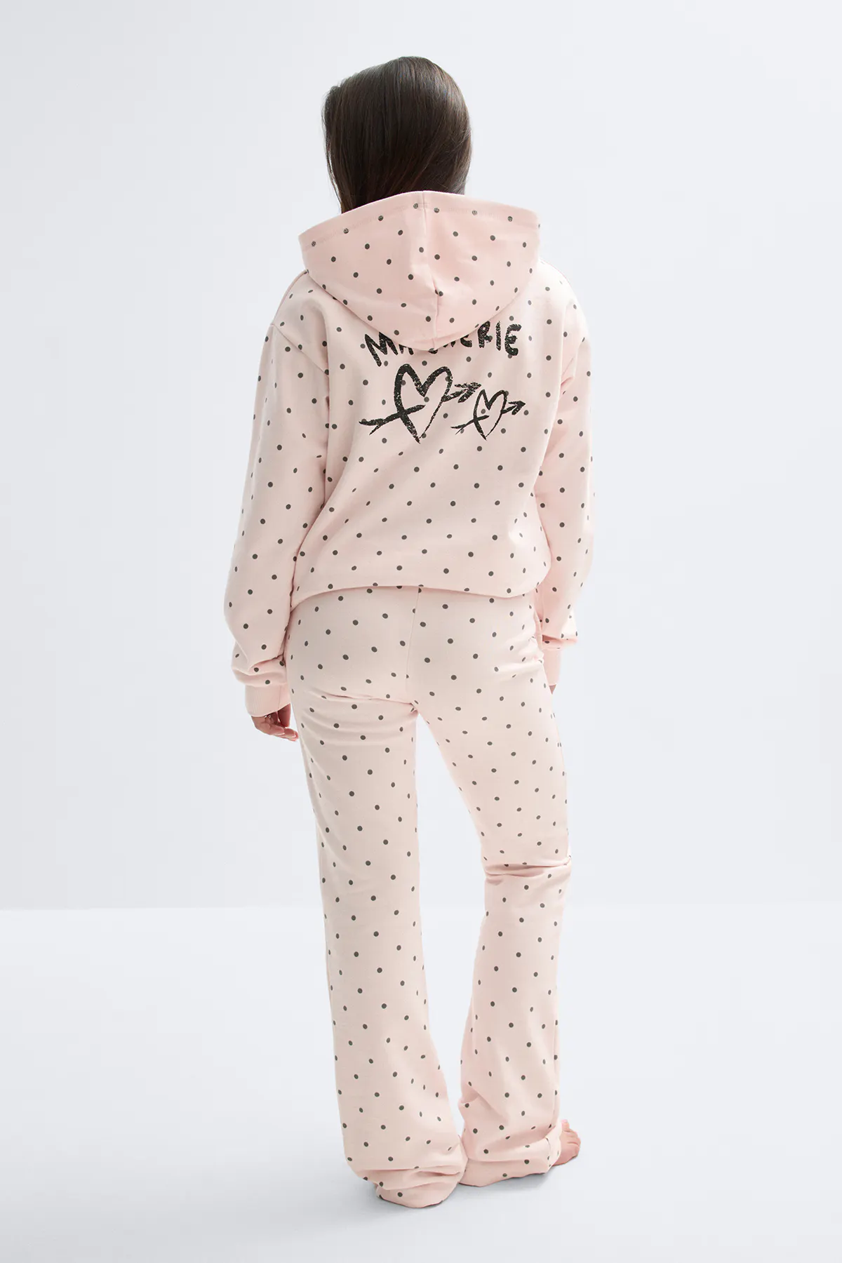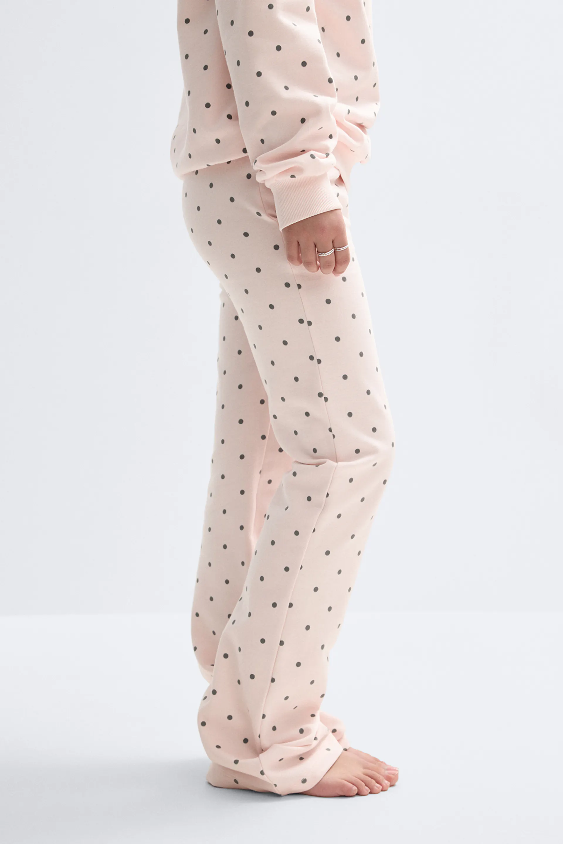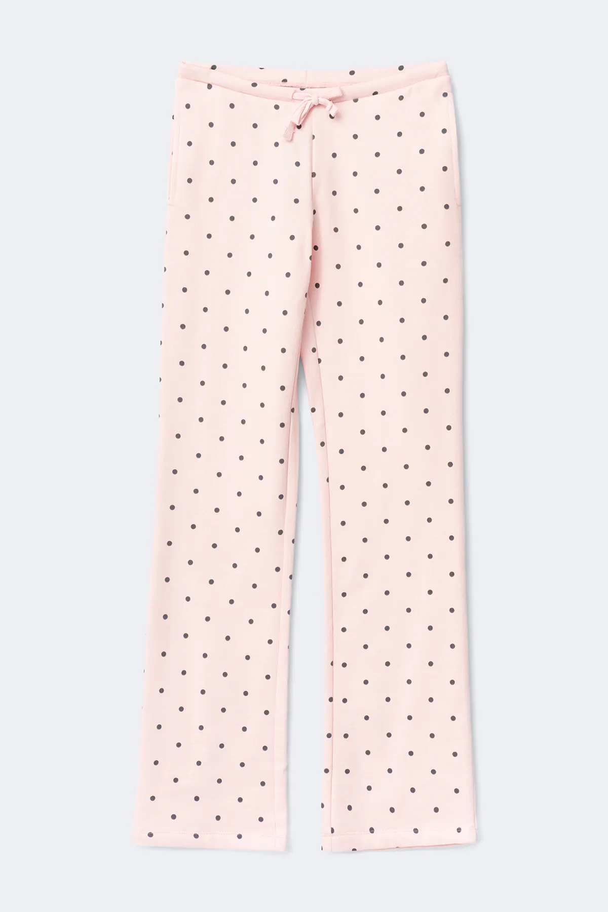 Gepunktete Sweathosen mit breiten Beinen. Die Sweathosen sind rosa und haben normale Länge. Sie haben elastische tiefe Taille mit Kordel, Taschen in den Seiten und normale Passform.