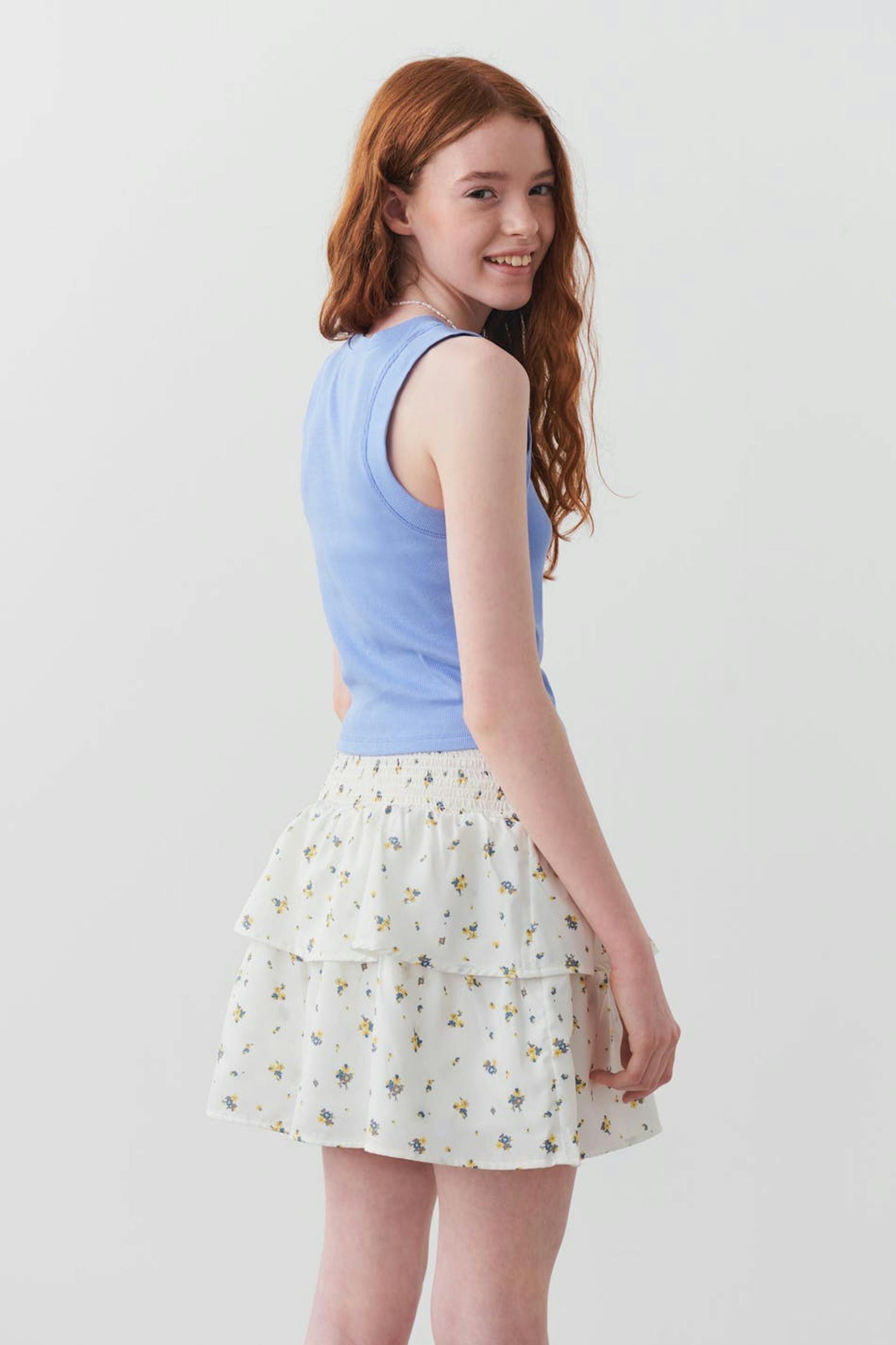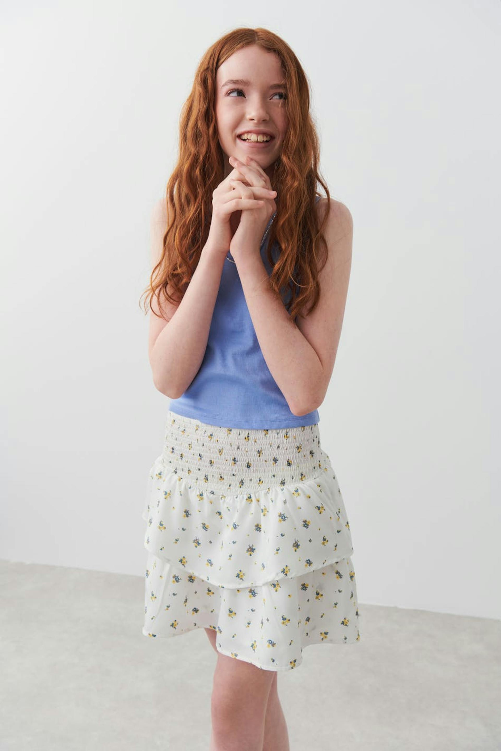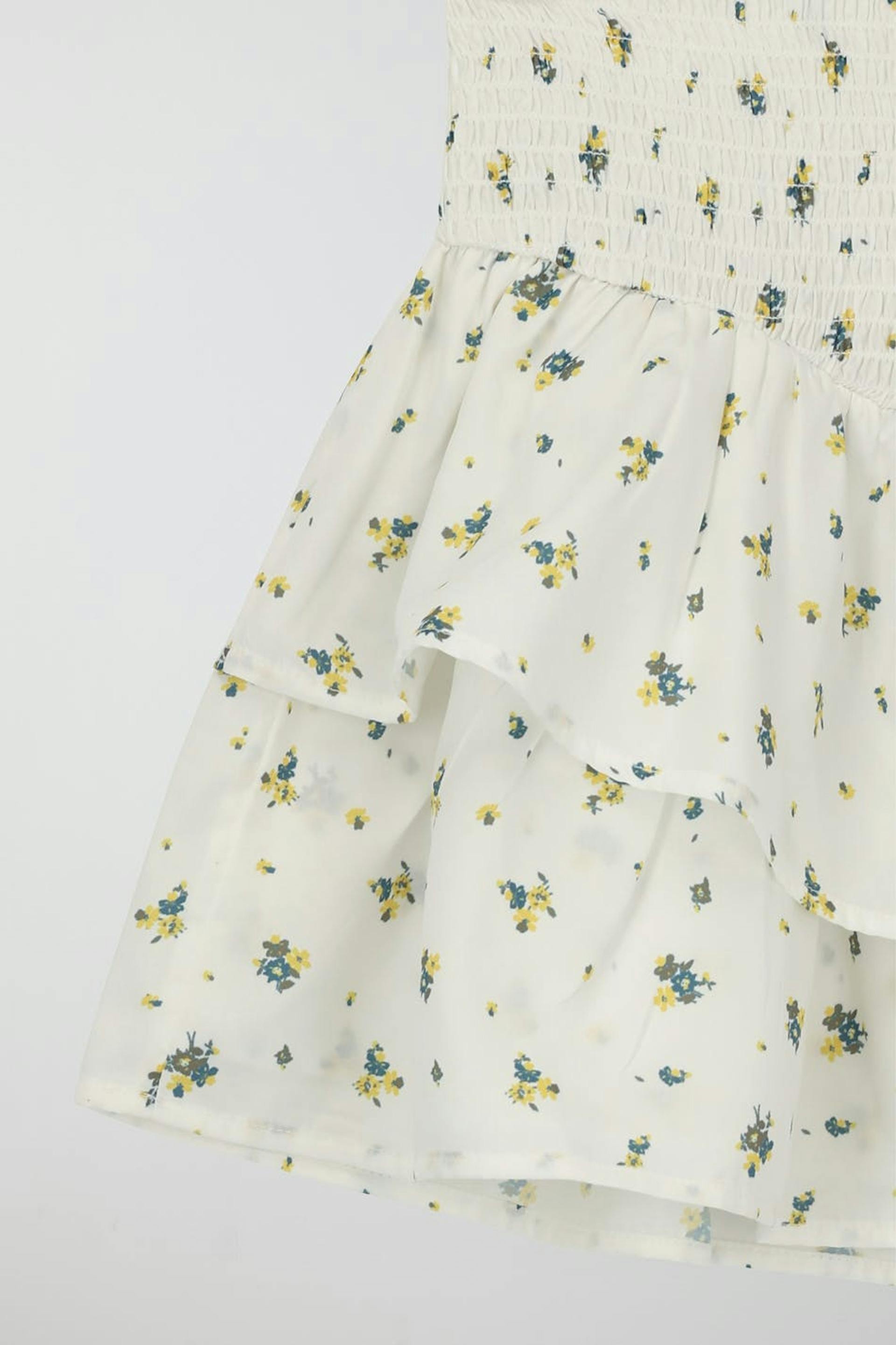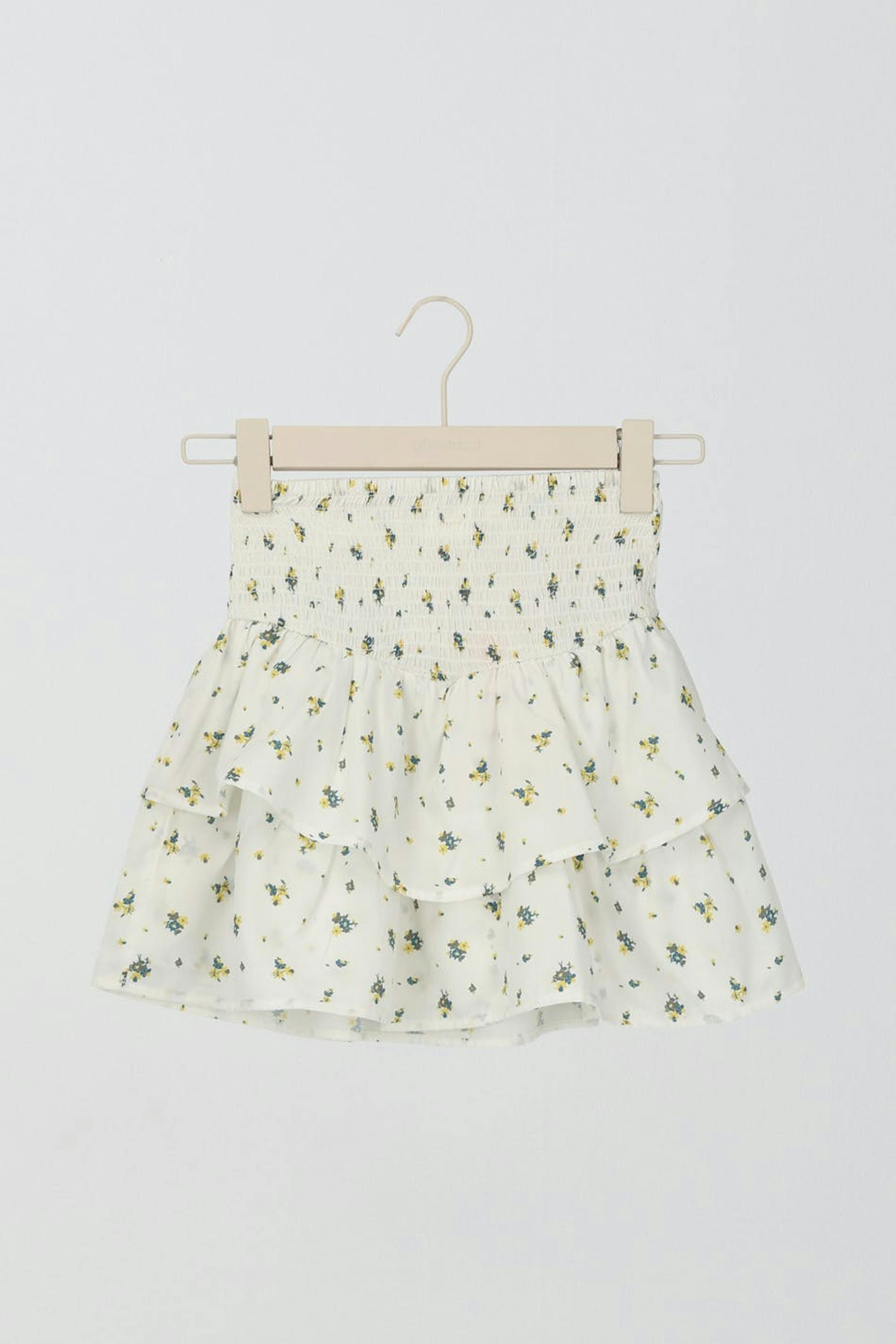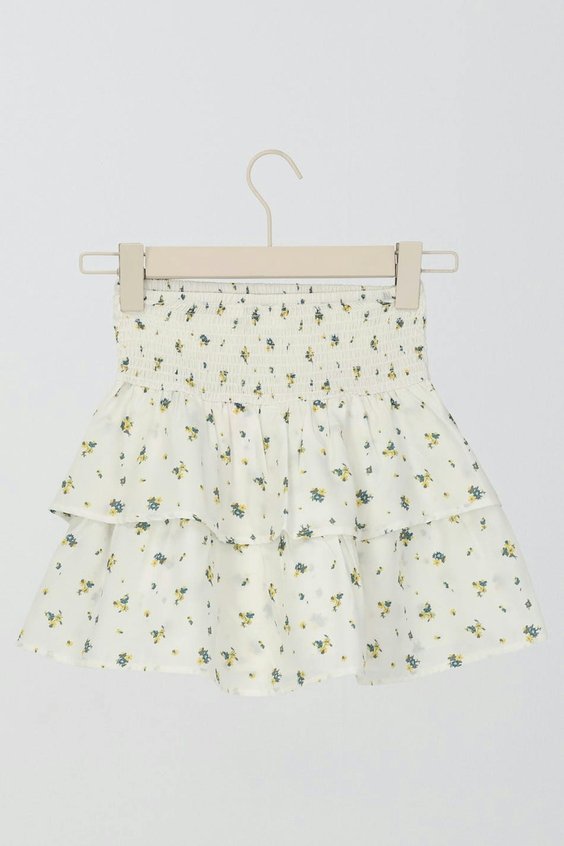 Blumiger Rüschenrock von aus unserem Young-Sortiment mit Smoking in der Taille. Der Rock ist gelb und kurz und hat eine gewebte Qualität.