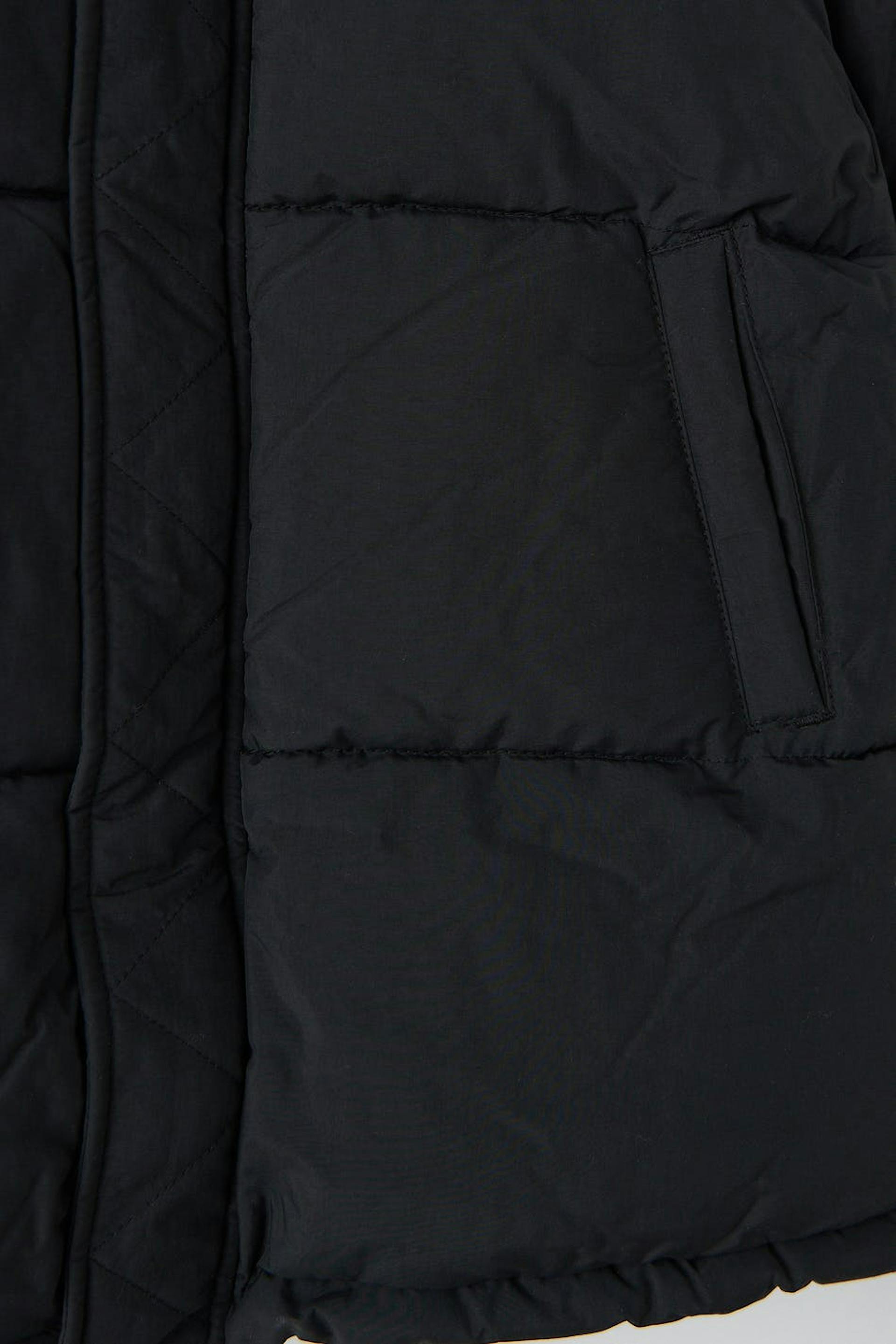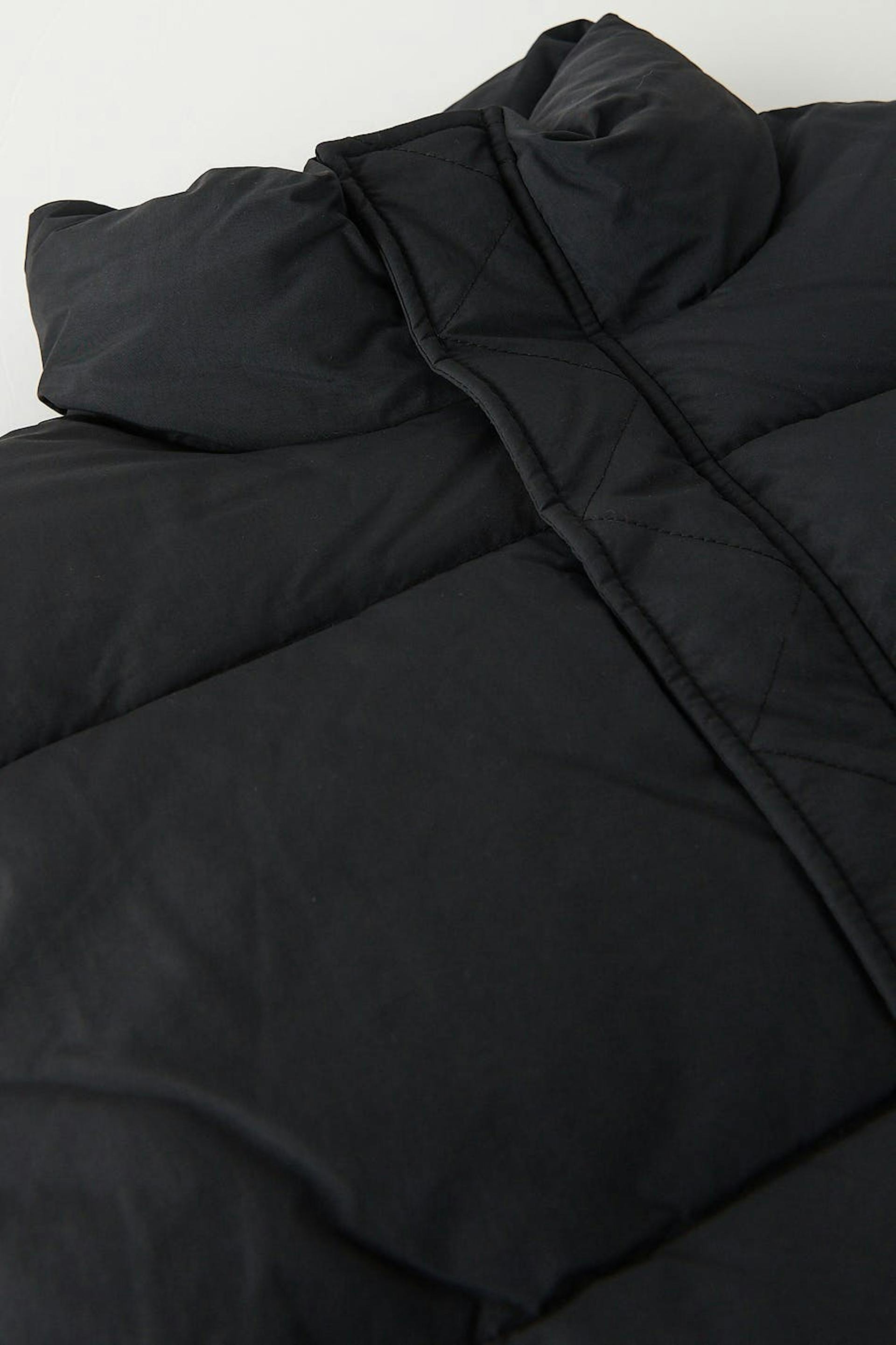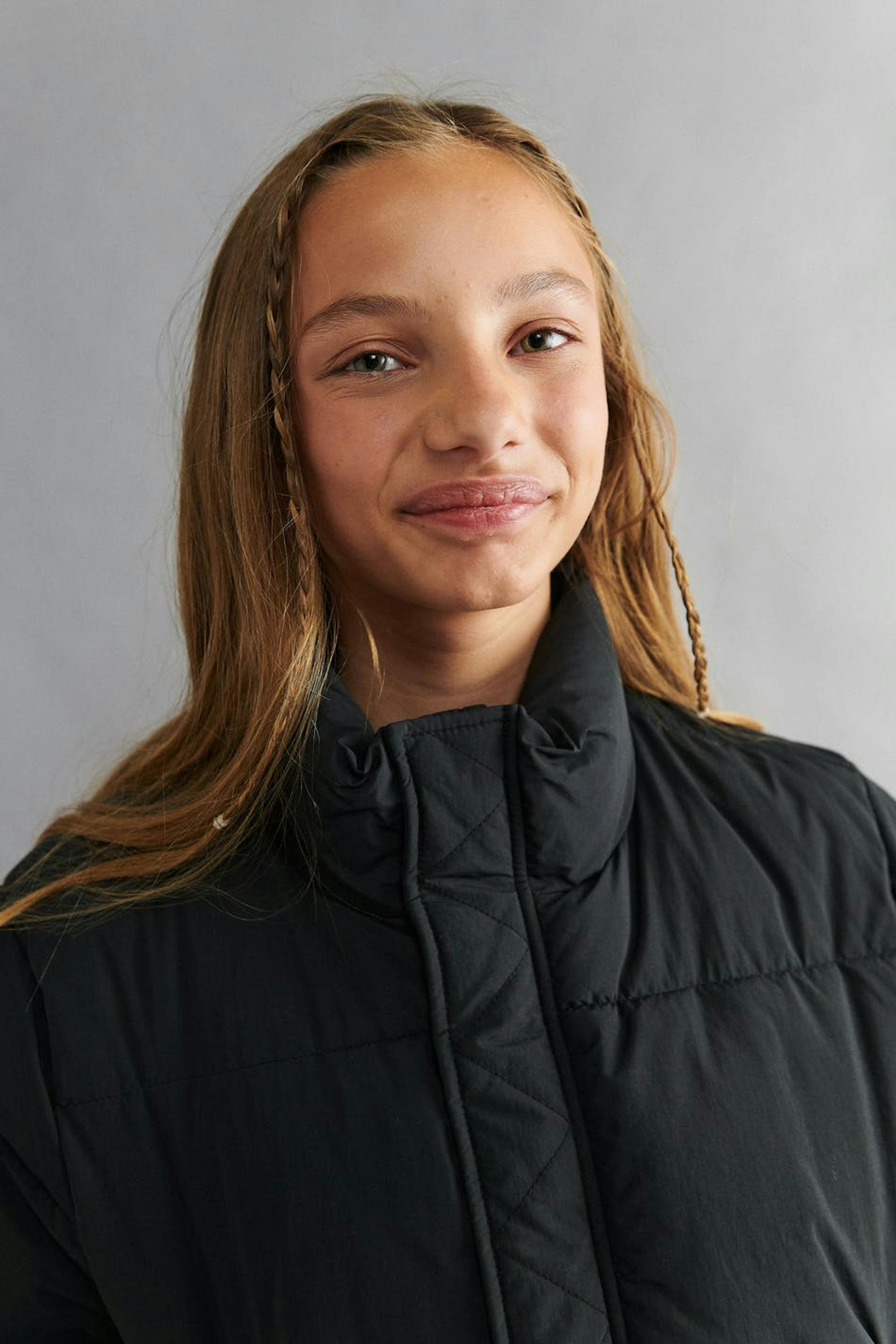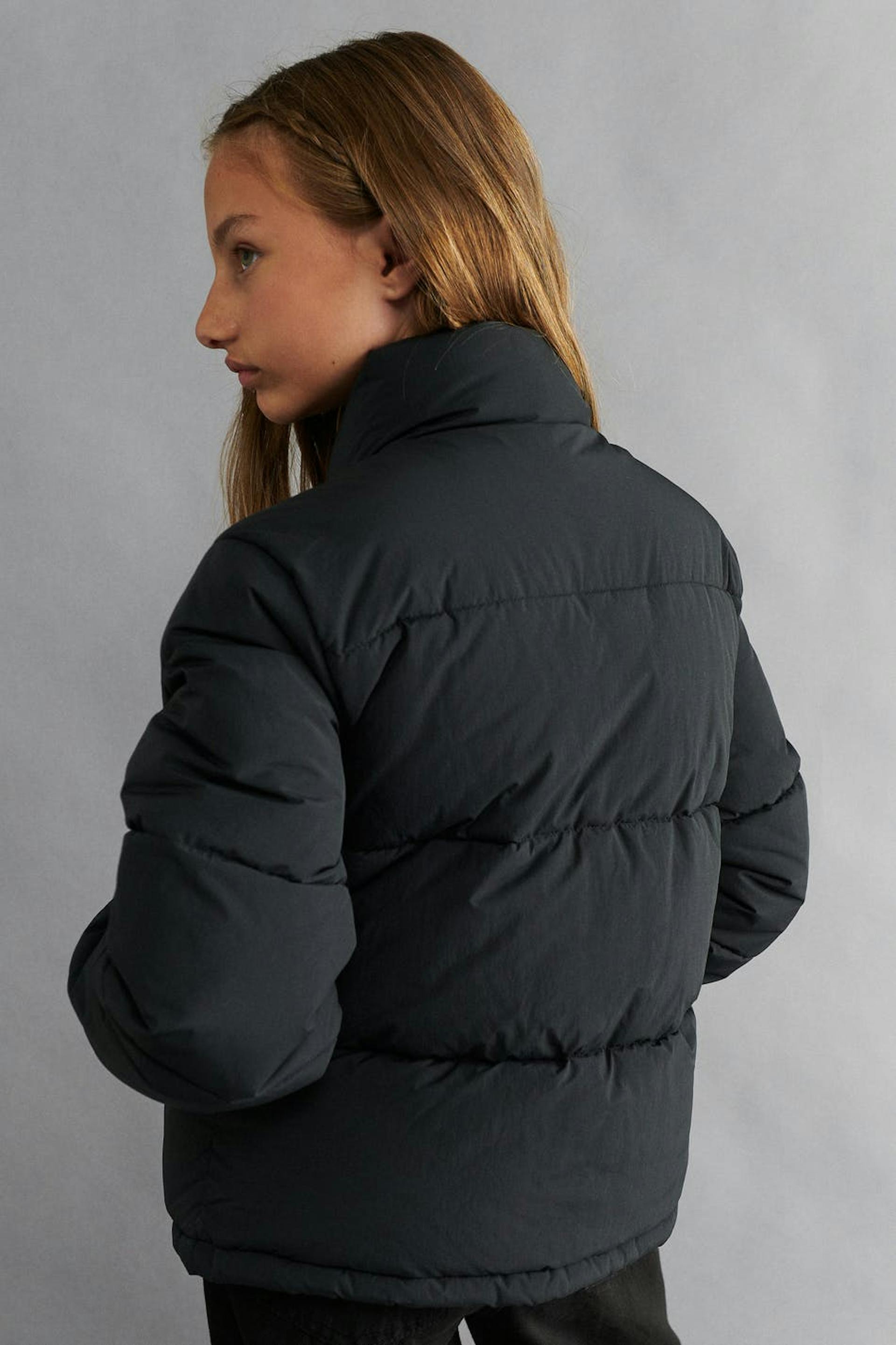 Abgeschnittene Pufferjacke von aus unserem Young-Sortiment mit einer Oversize-Passform. Die Jacke ist schwarz und hat Rollkragen. Sie hat Taschen in den Seiten, Reißverschluss vorne und elastische Manschetten.