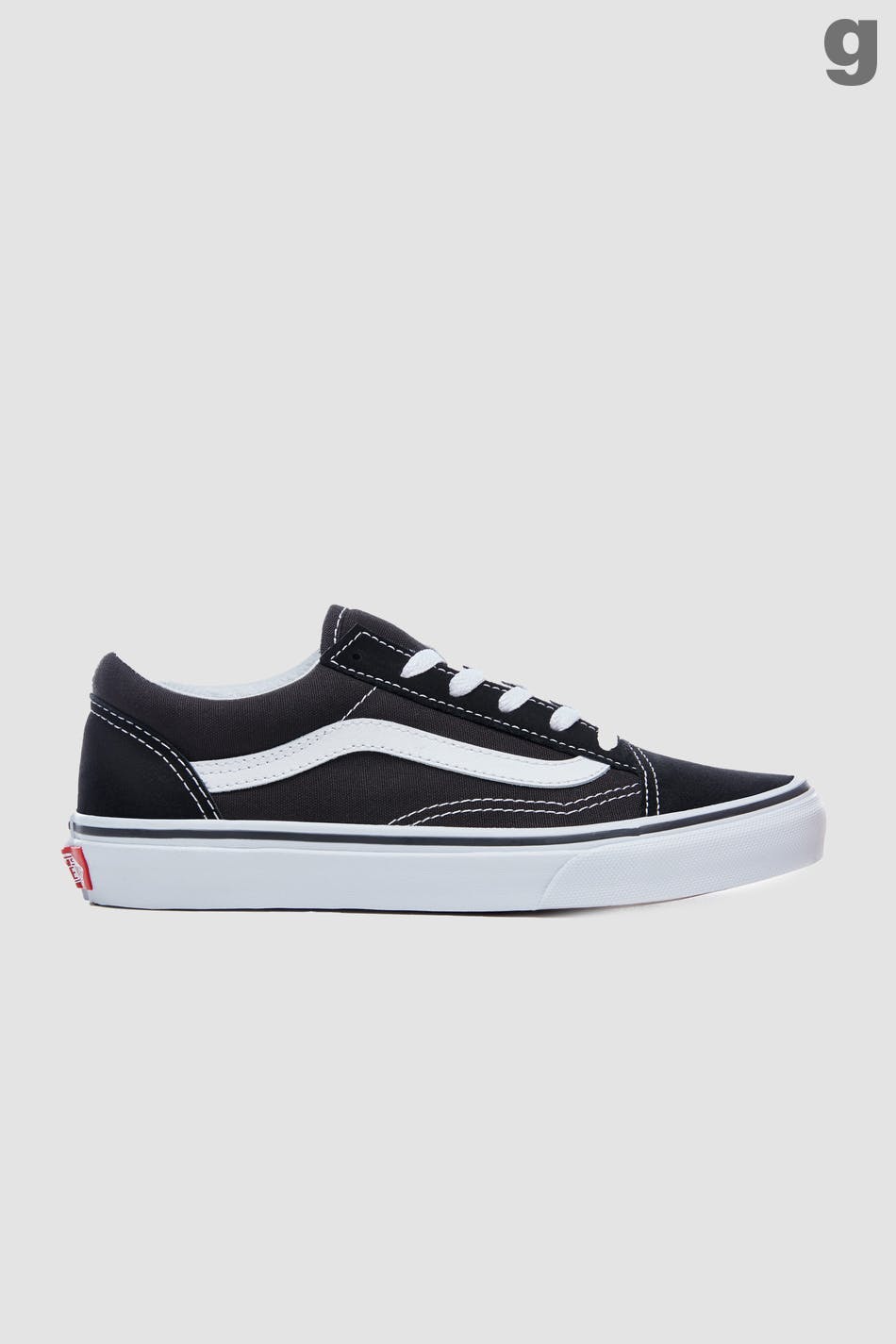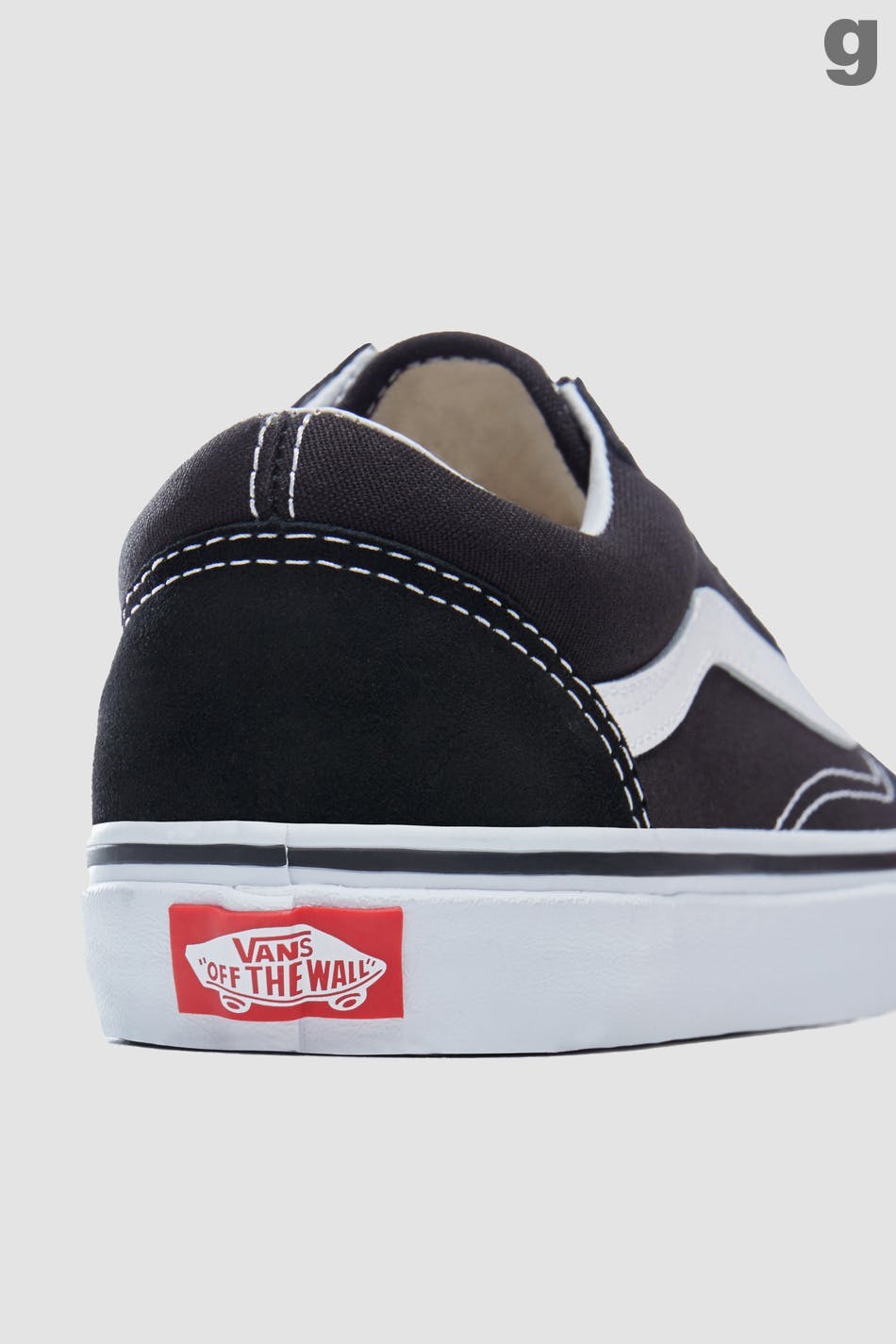 Tiefe Turnschuhe von Vans mit einer Schnürung vorne. Die Schuhe sind schwarz und haben dekorative Naht-Details auf den Seiten. Sie haben eine Sohle im Waffelmuster.