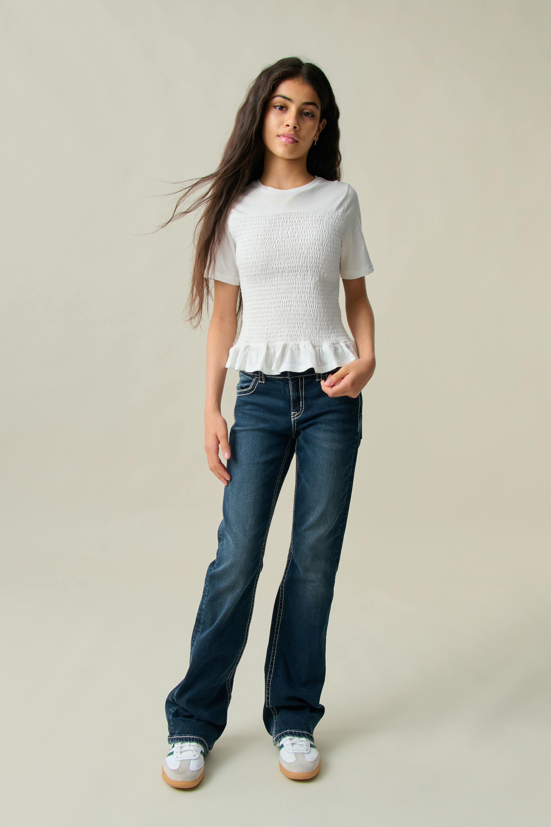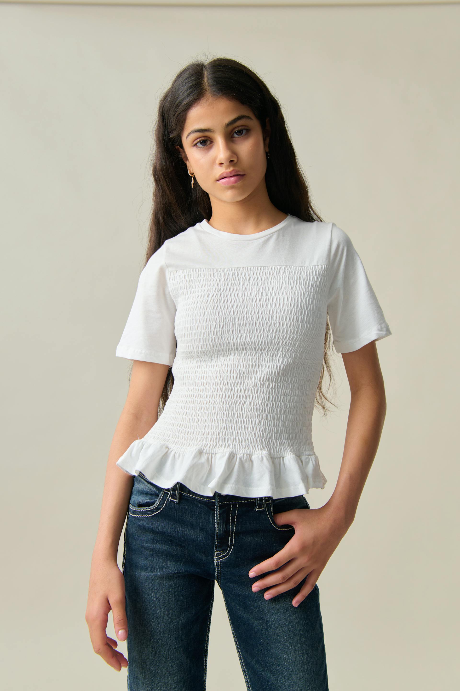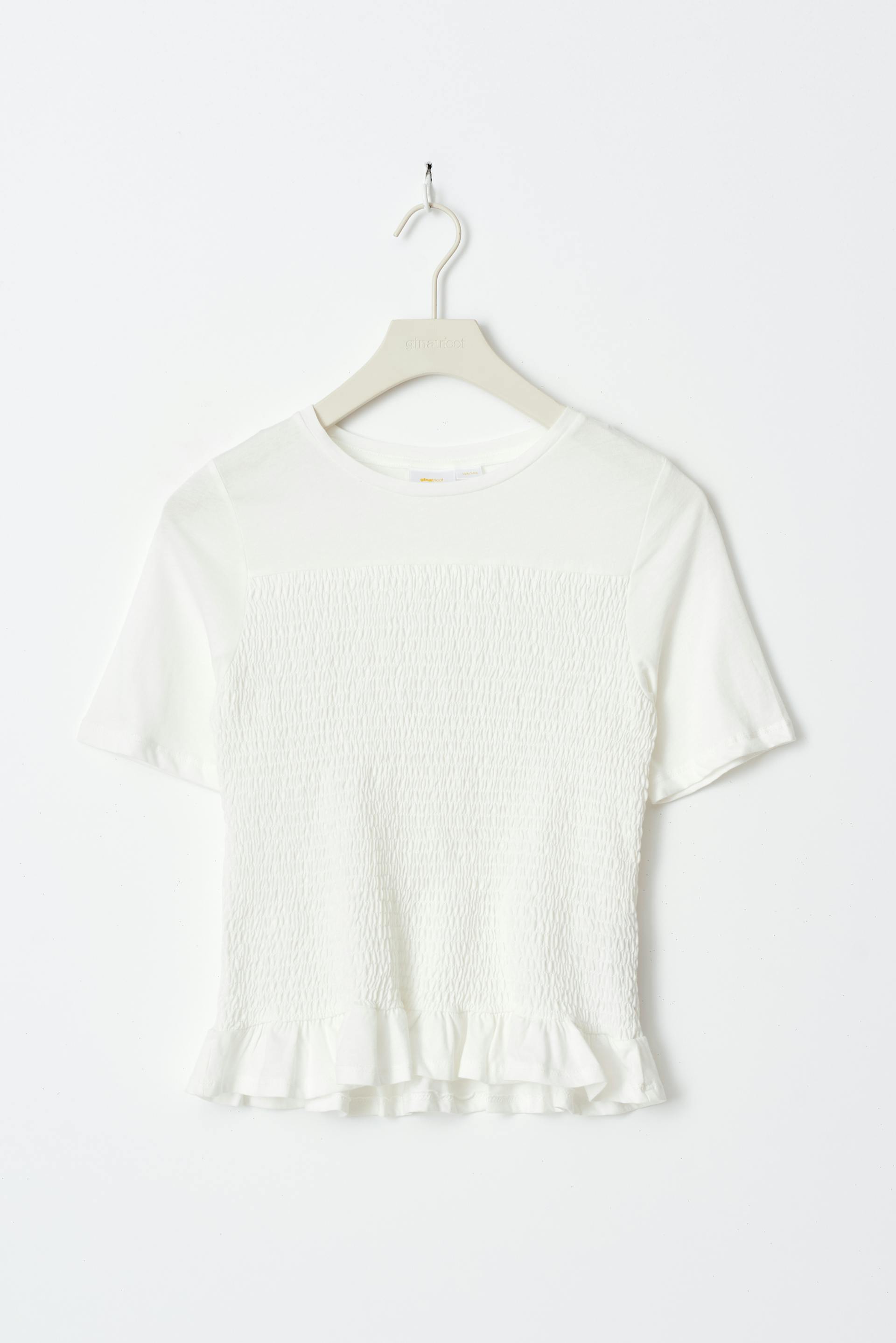 Gesmoktes Oberteil von Gina Tricot Young mit kurzem Ärmel. Das Oberteil ist weiβ und hat Rüschenrock an der Unterkante. Es hat normale Passform und Rundhalsausschnitt.