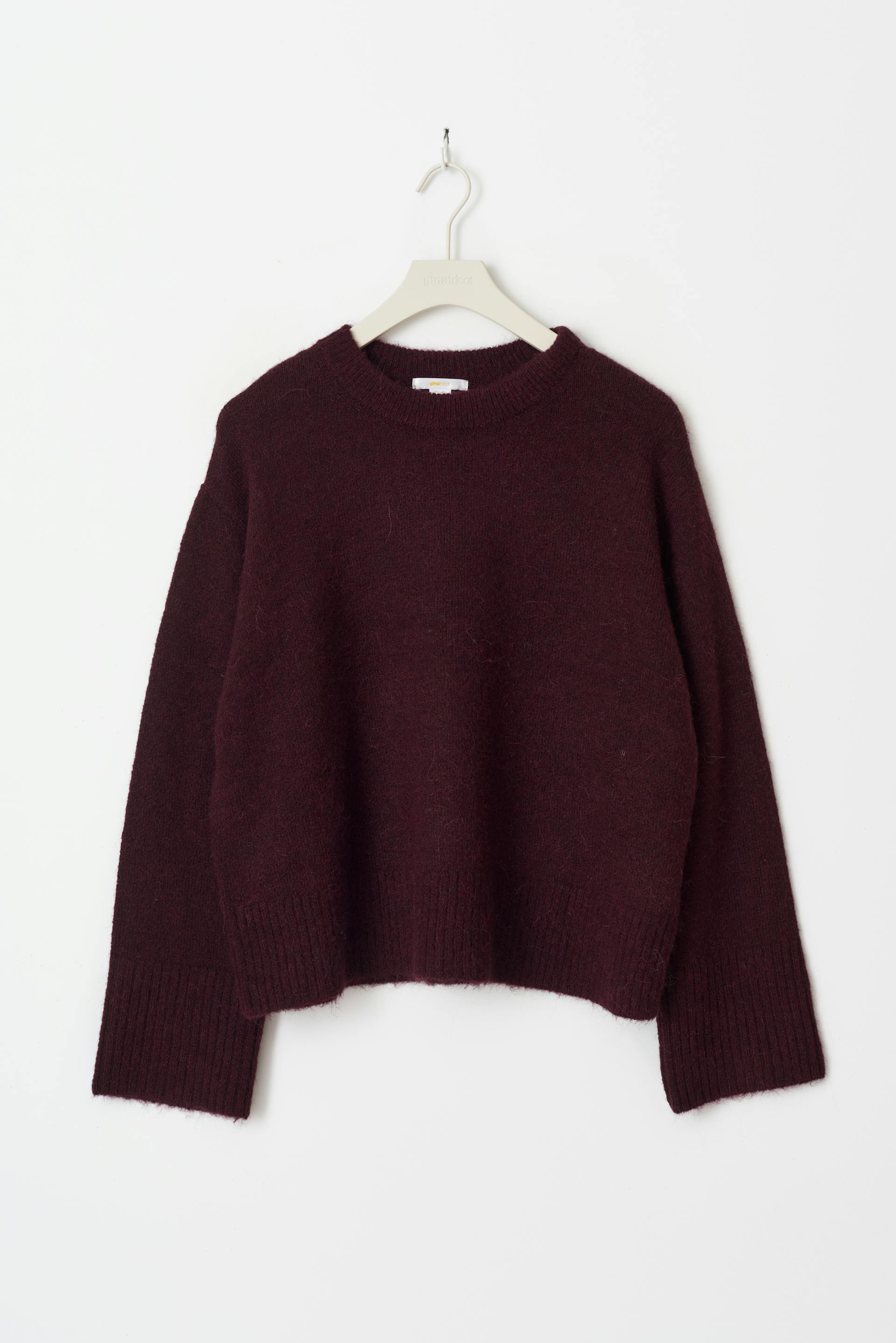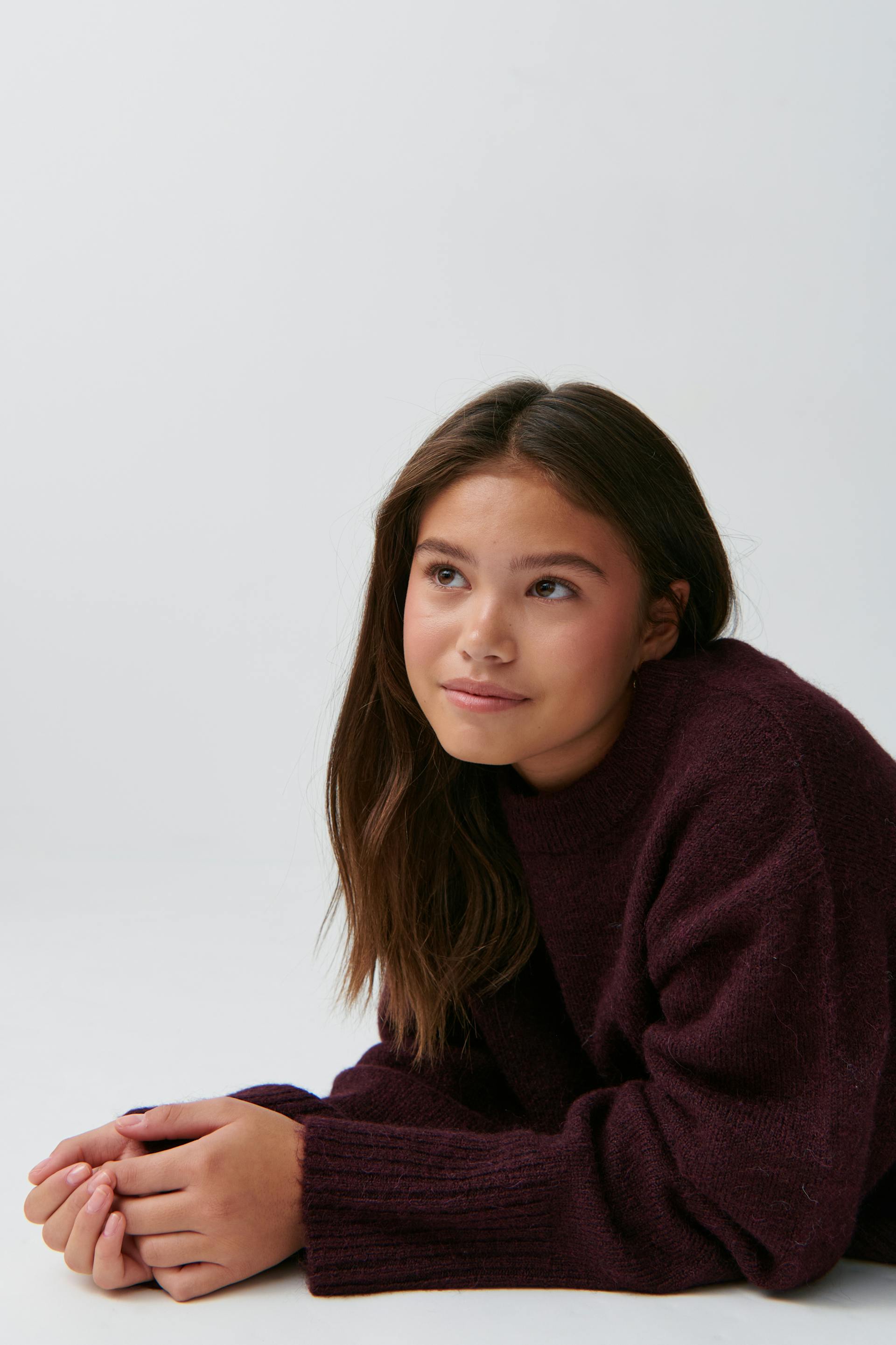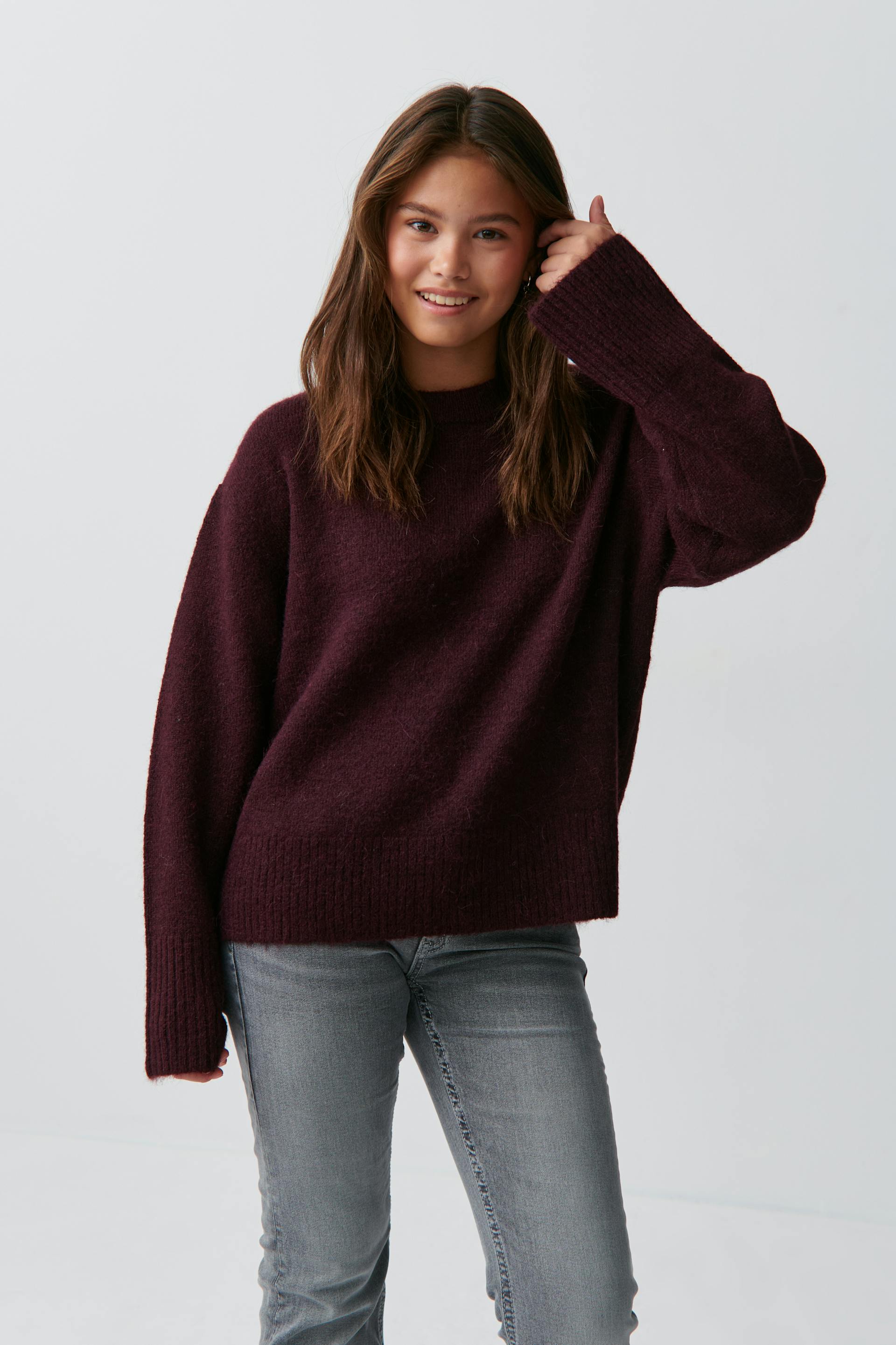 Strickpullover mit Oversize-Passform. Der Pullover ist weinrot und hat Rundhalsausschnitt. Er hat langen Ärmel und breite Rippe an den Ärmelenden und an der Unterkante.