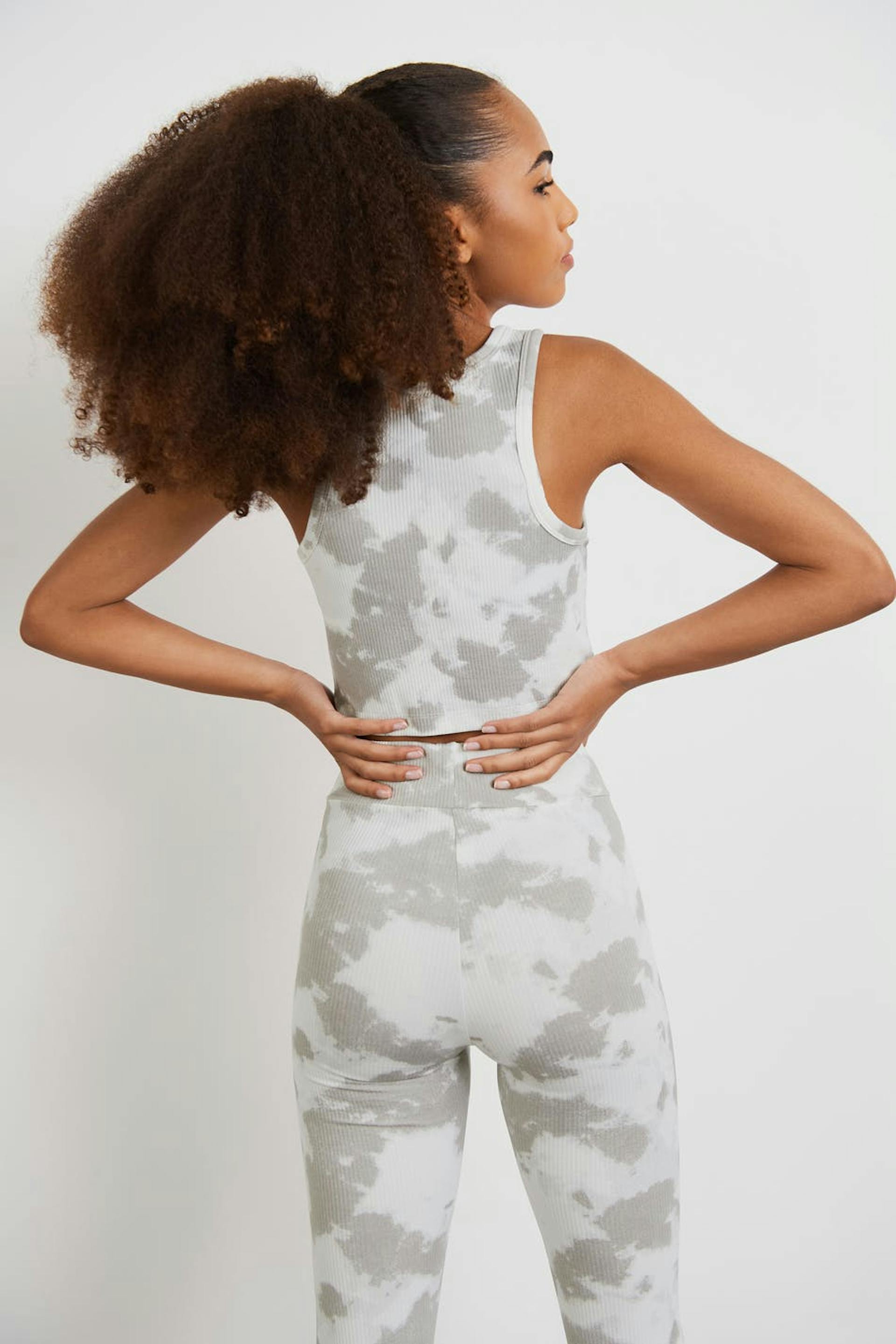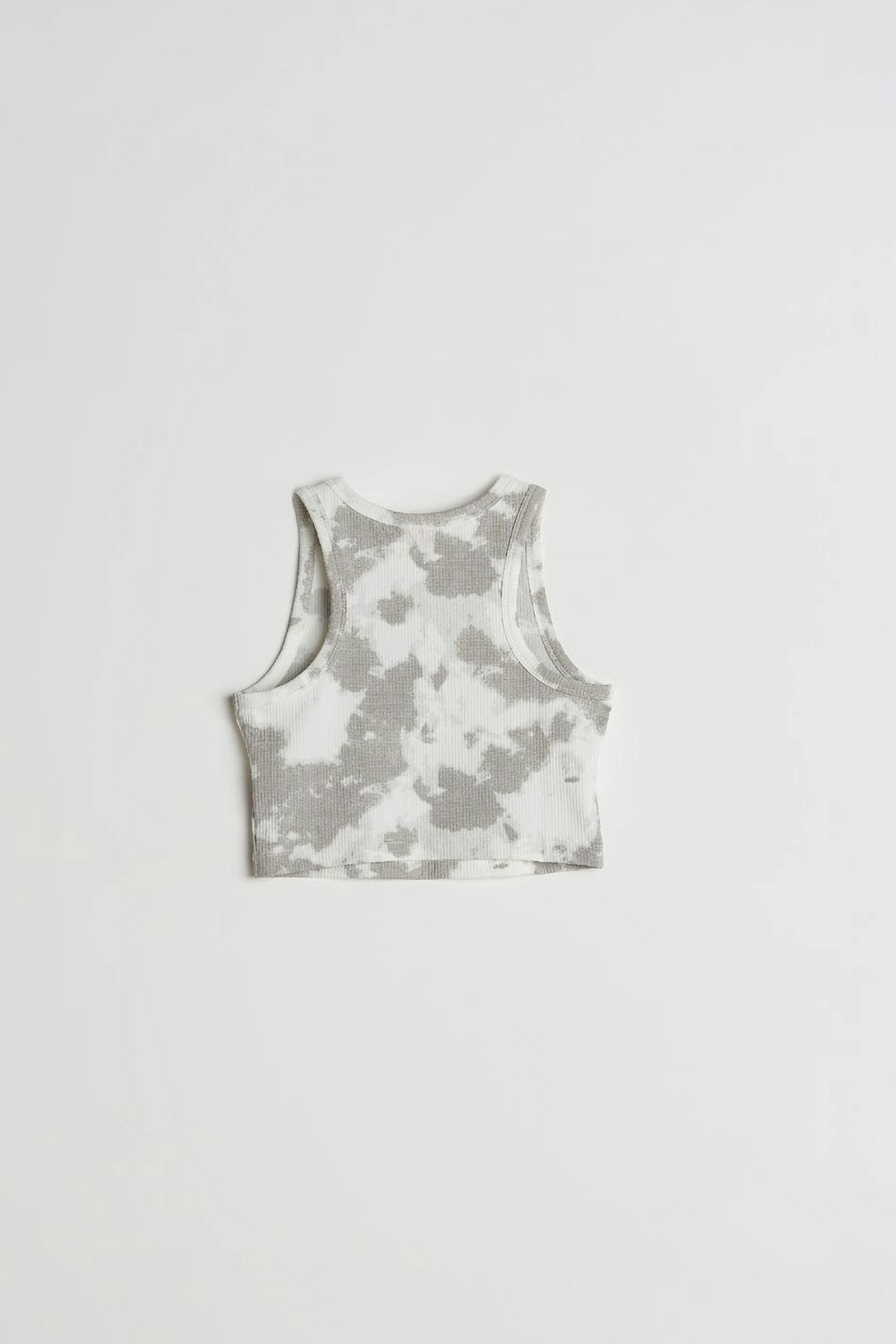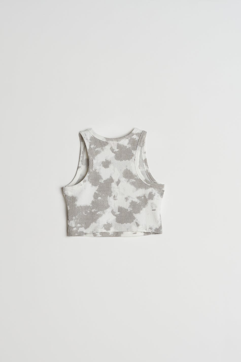 Geripptes Oberteil von aus unserem Young-Sortiment mit einer taillierten Passform. Das Oberteil ist grau, ärmellos und gemustert. Es hat eine abgeschnittene Länge und einen Rundhalsausschnitt.