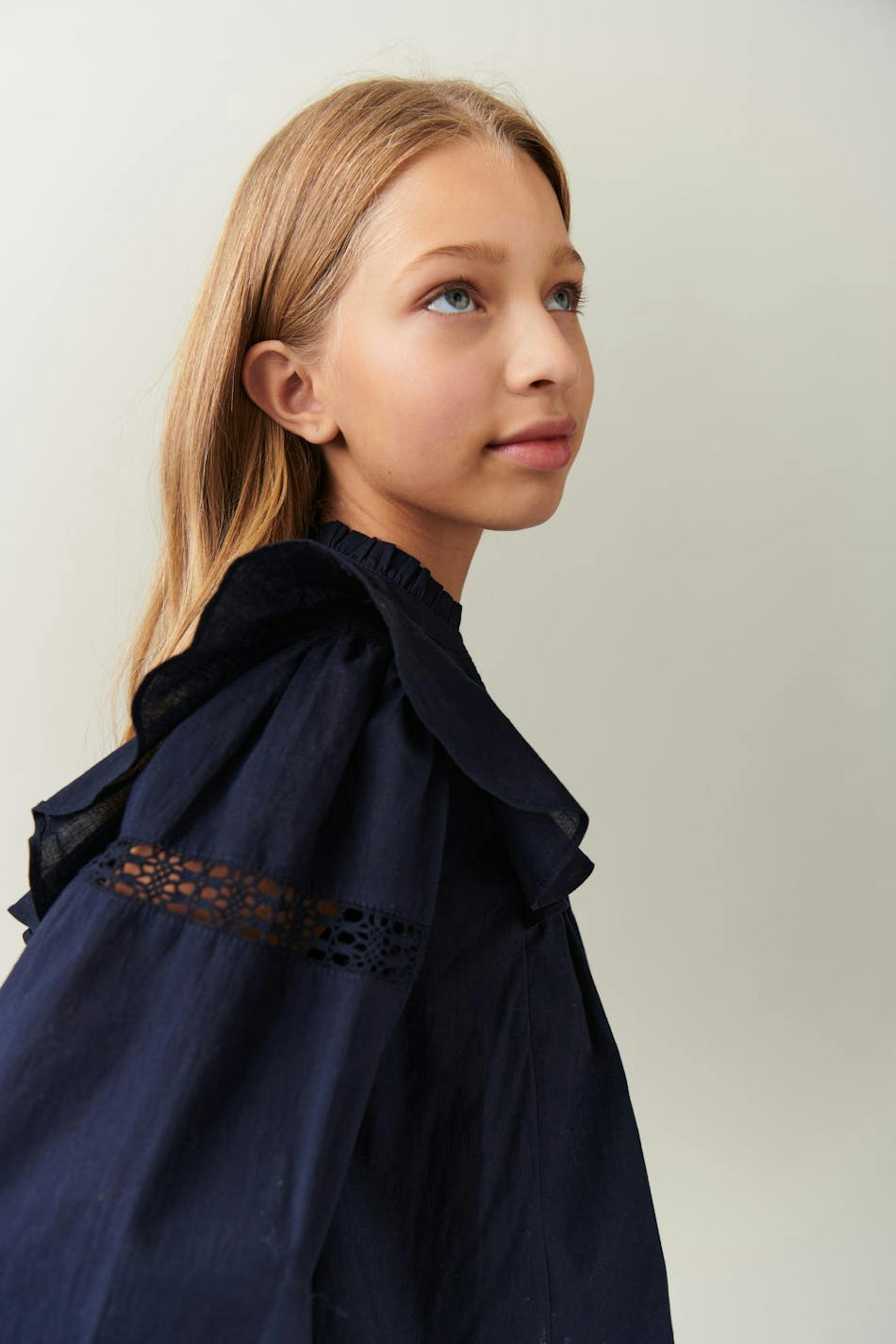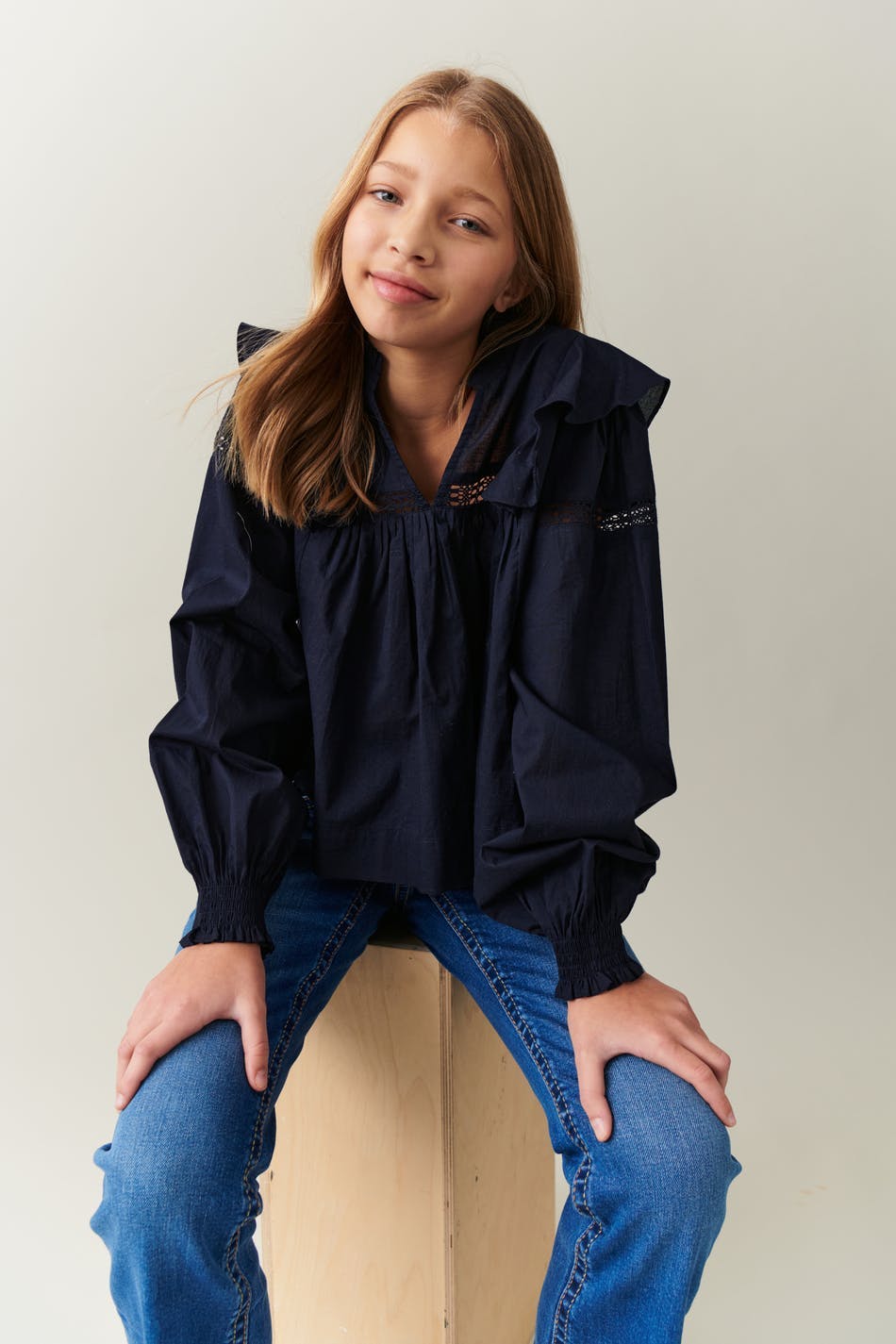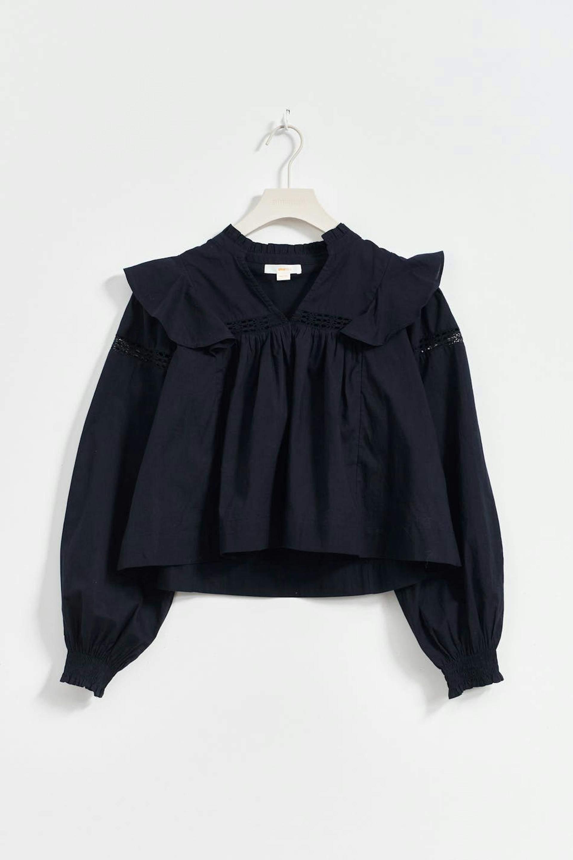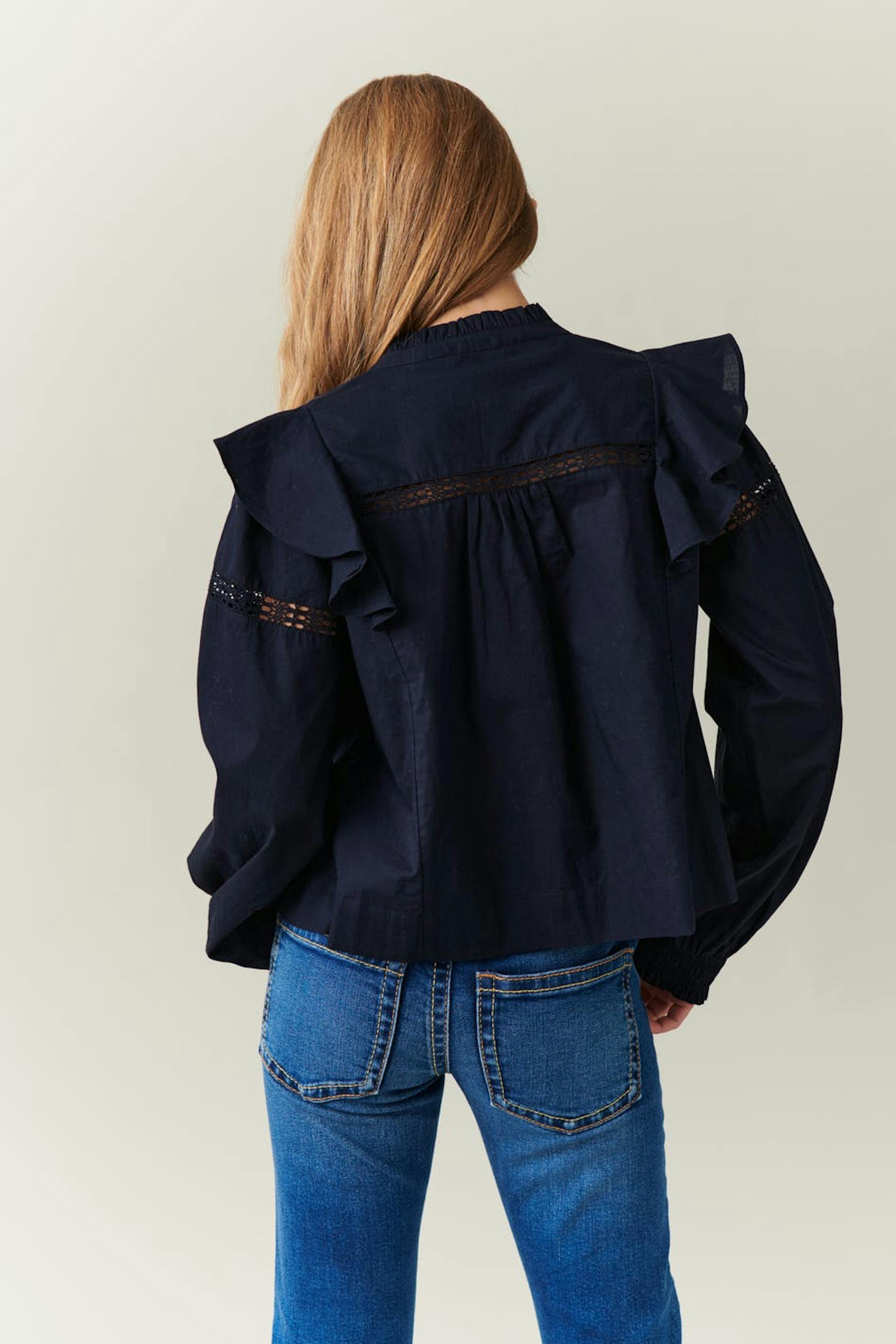 Böhmische Bluse mit Volants um die Schultern herum. Die Bluse ist marine und blau und hat weit-geschnittenen Style. Sie hat V-Ausschnitt, Häkeldetails, Smoking an den Ärmelenden und Kragen mit Rüschen-Details.