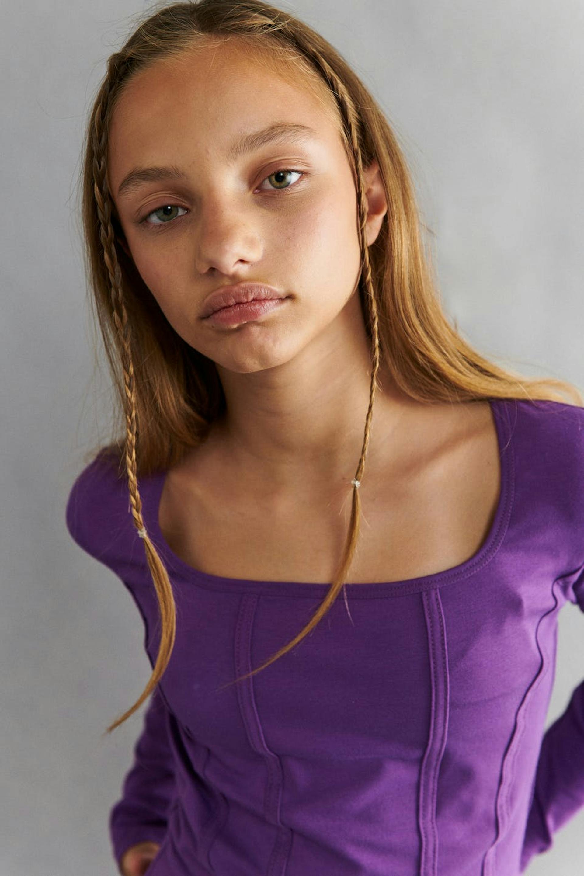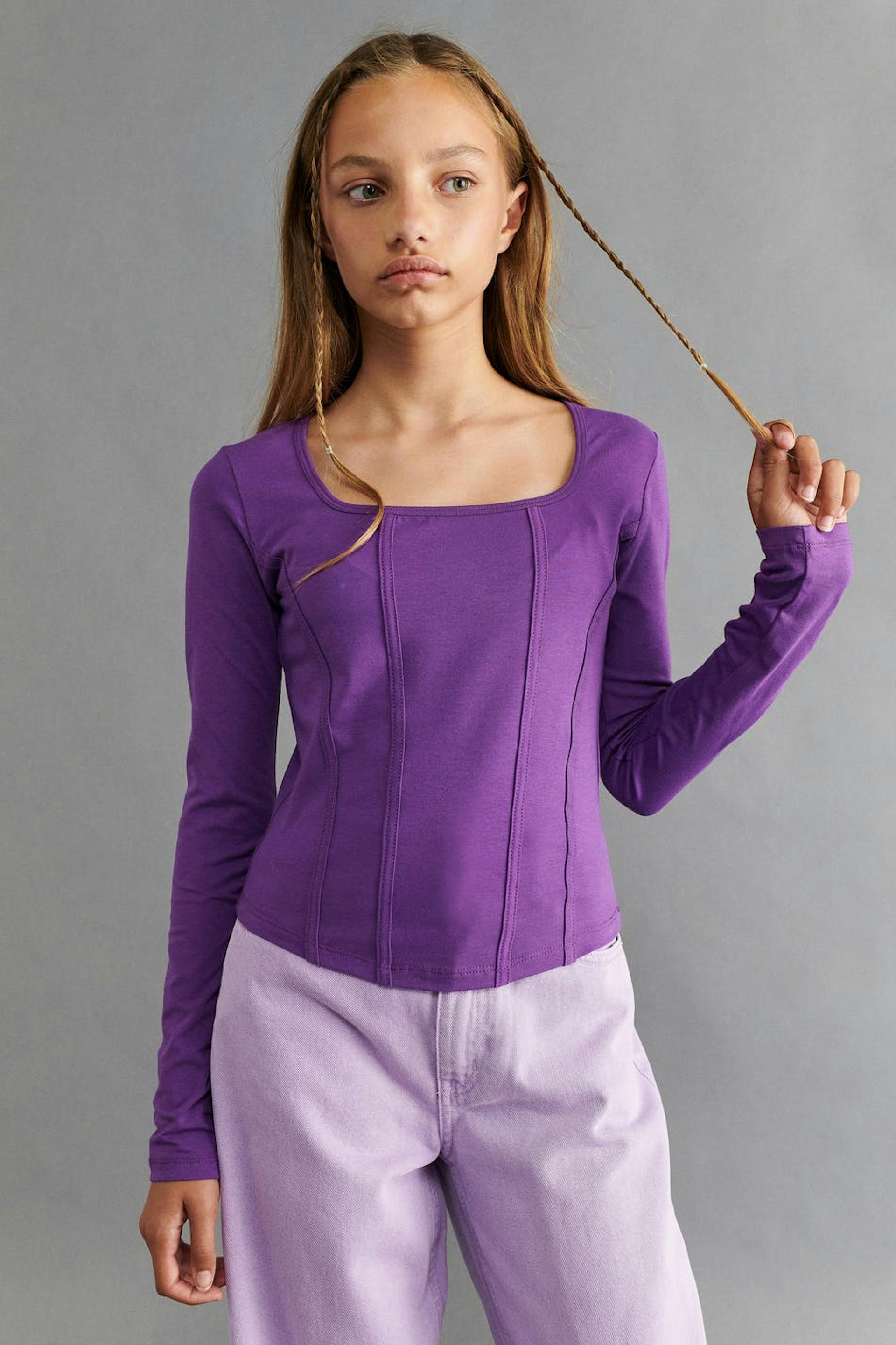 Langärmliges Korsett-Oberteil von aus unserem Young-Sortiment mit taillierter Passform. Das Oberteil ist lila und hat korsettartige Säume vorne.