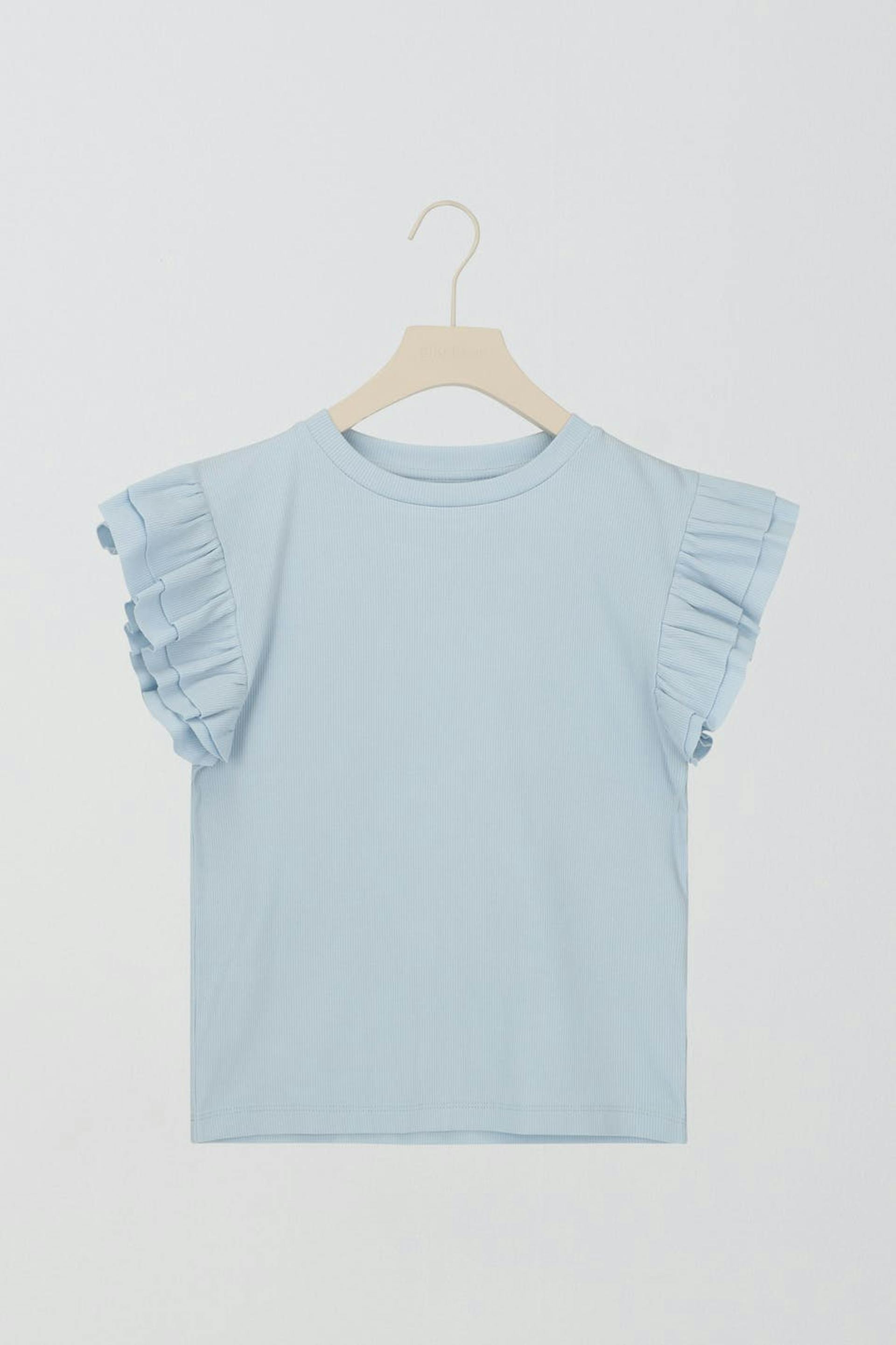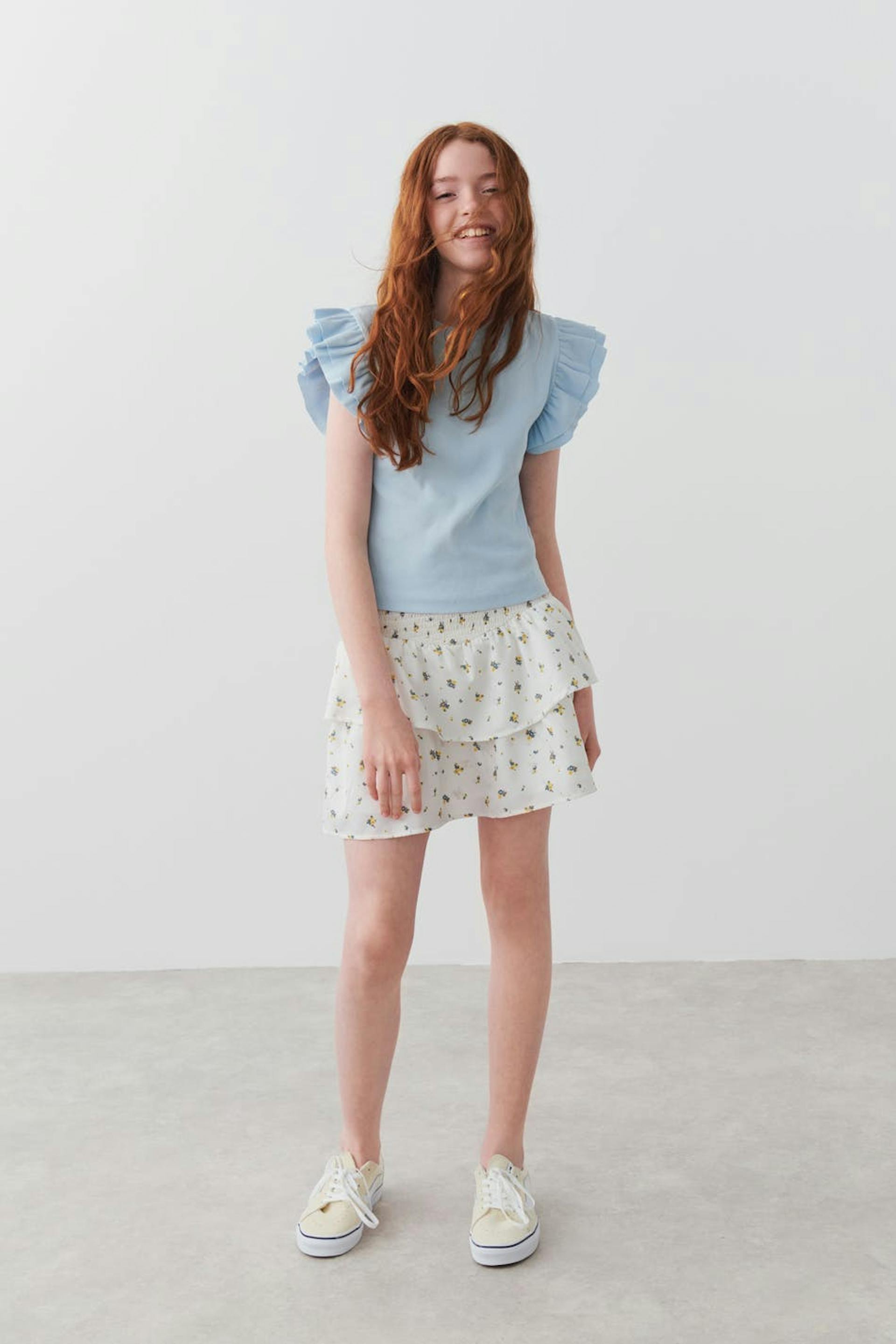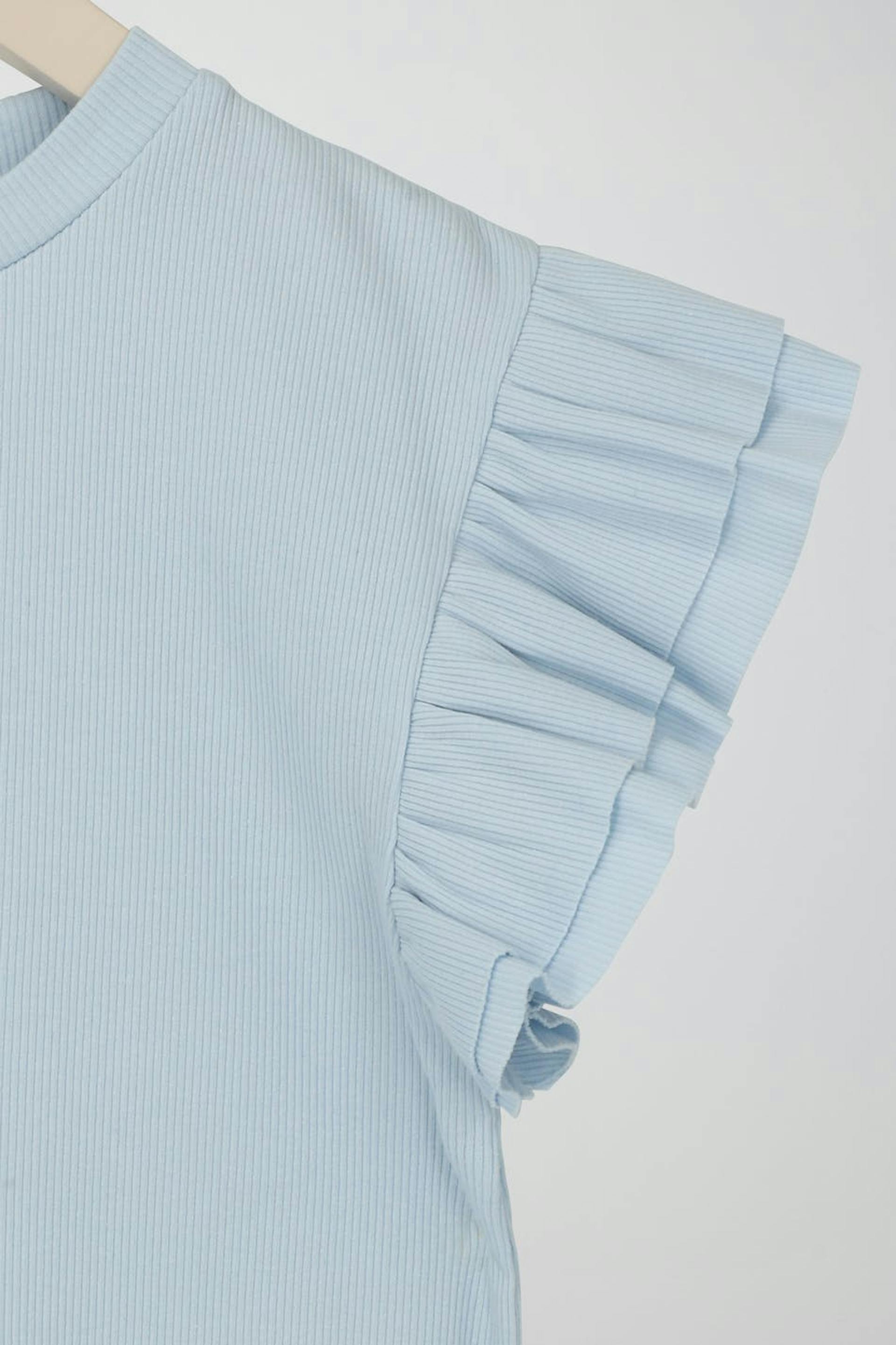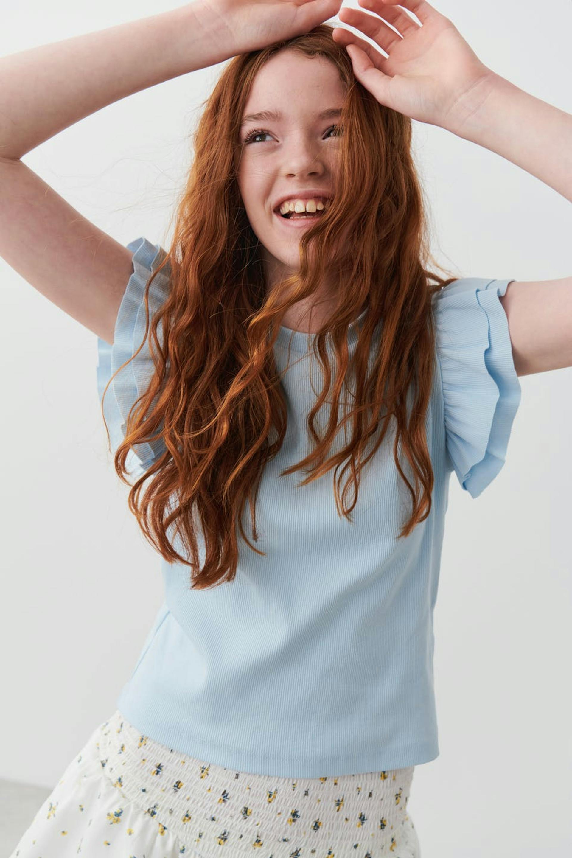 Oberteil von Gina Tricot Young mit kurzen Rüschenärmeln. Das Oberteil ist blau und hat eine gerippte Qualität aus Jersey.