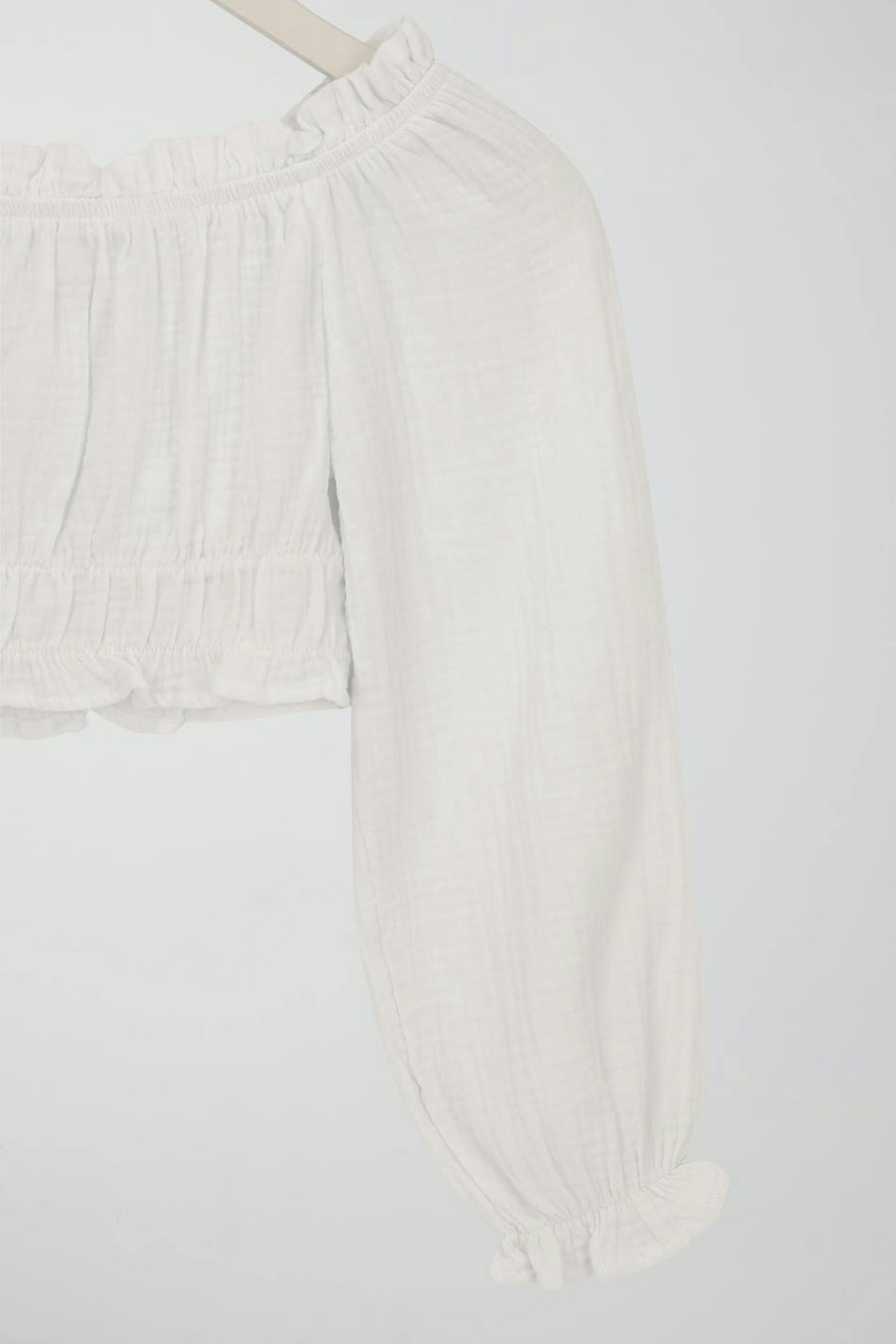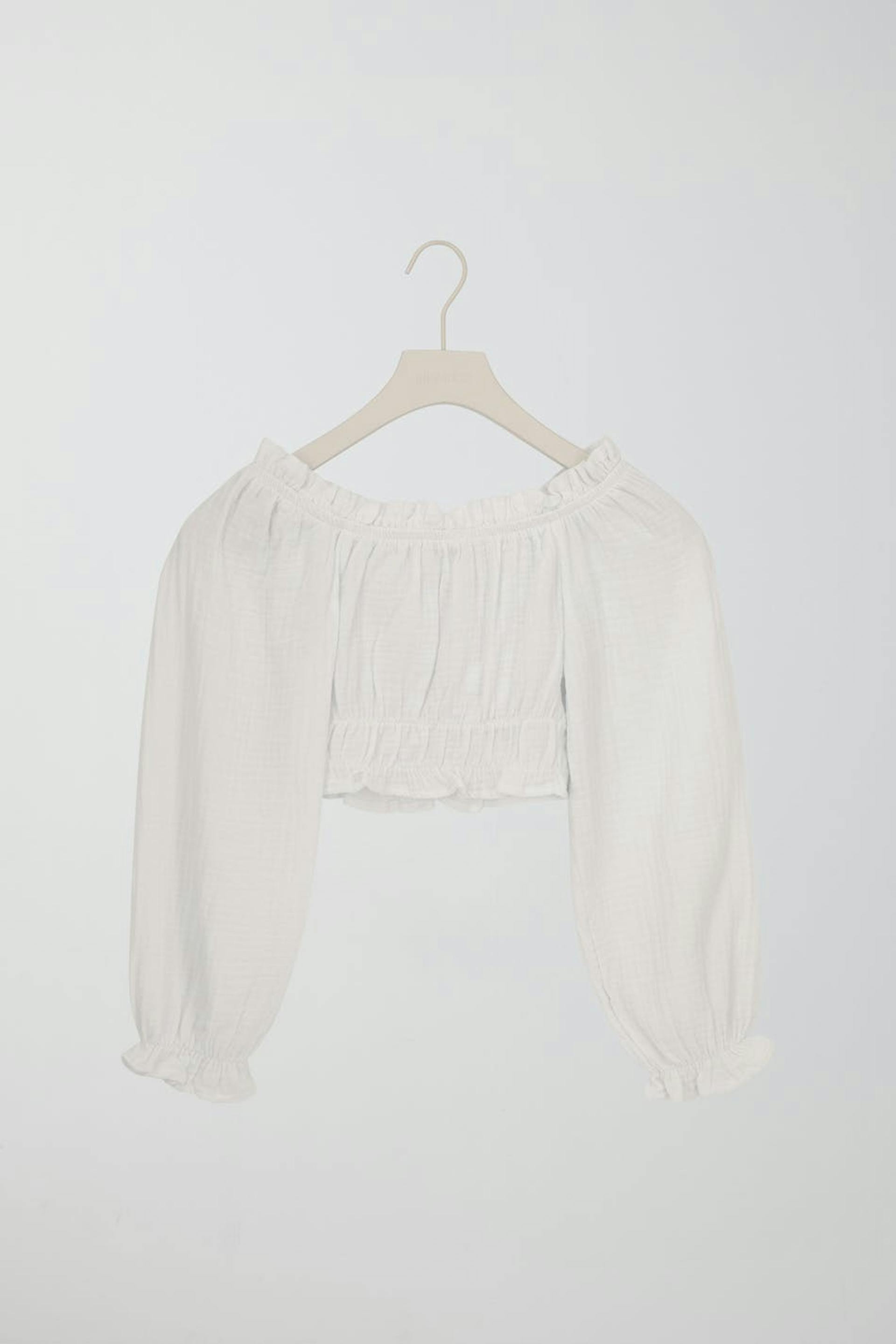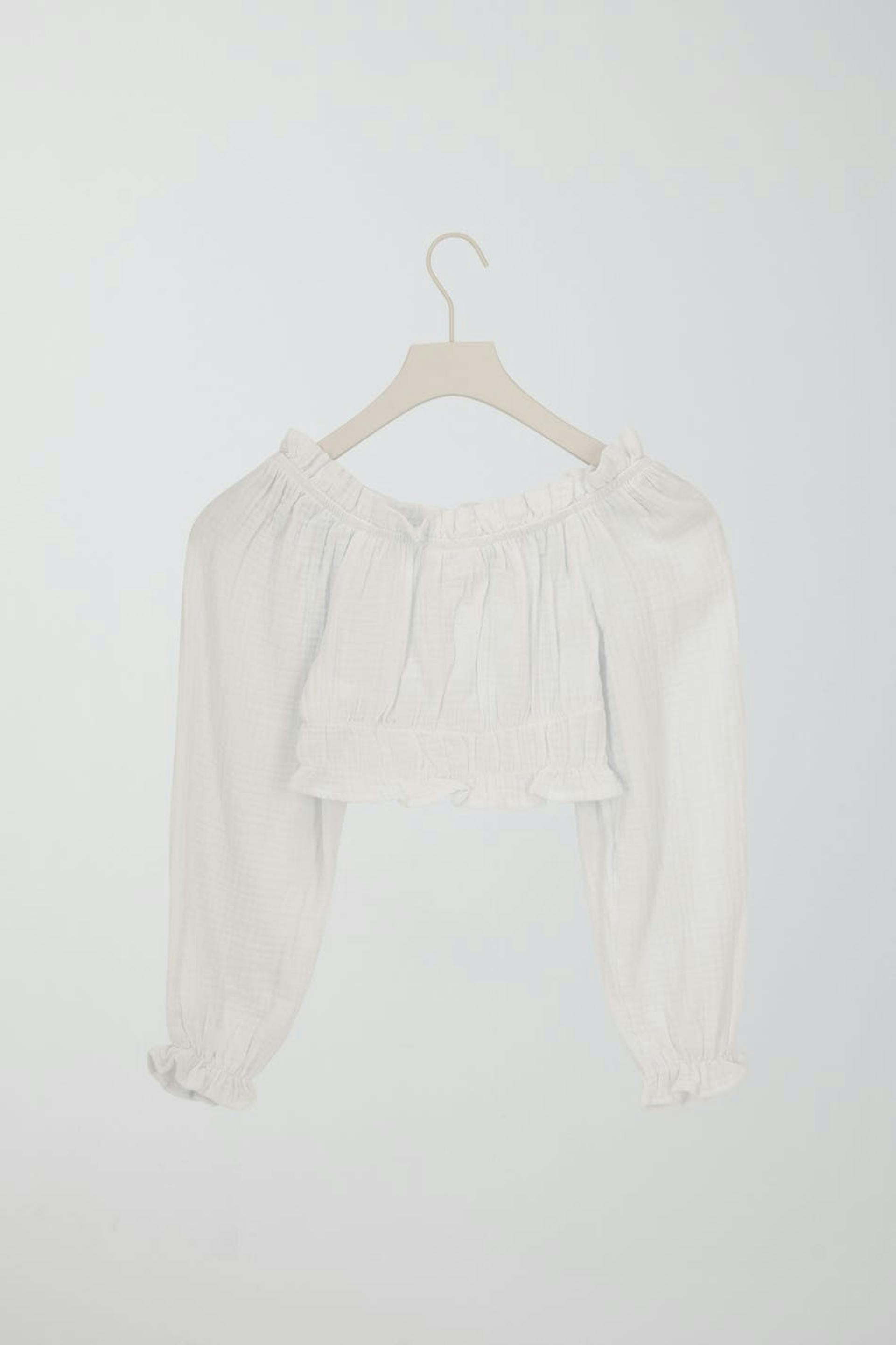 Abgeschnittene schulterfreie Bluse mit Gummiband in der Taille. Die Bluse ist weiβ und hat gemusterte Textur. Sie hat einen flauschigen Ärmel und Falten vorne.
