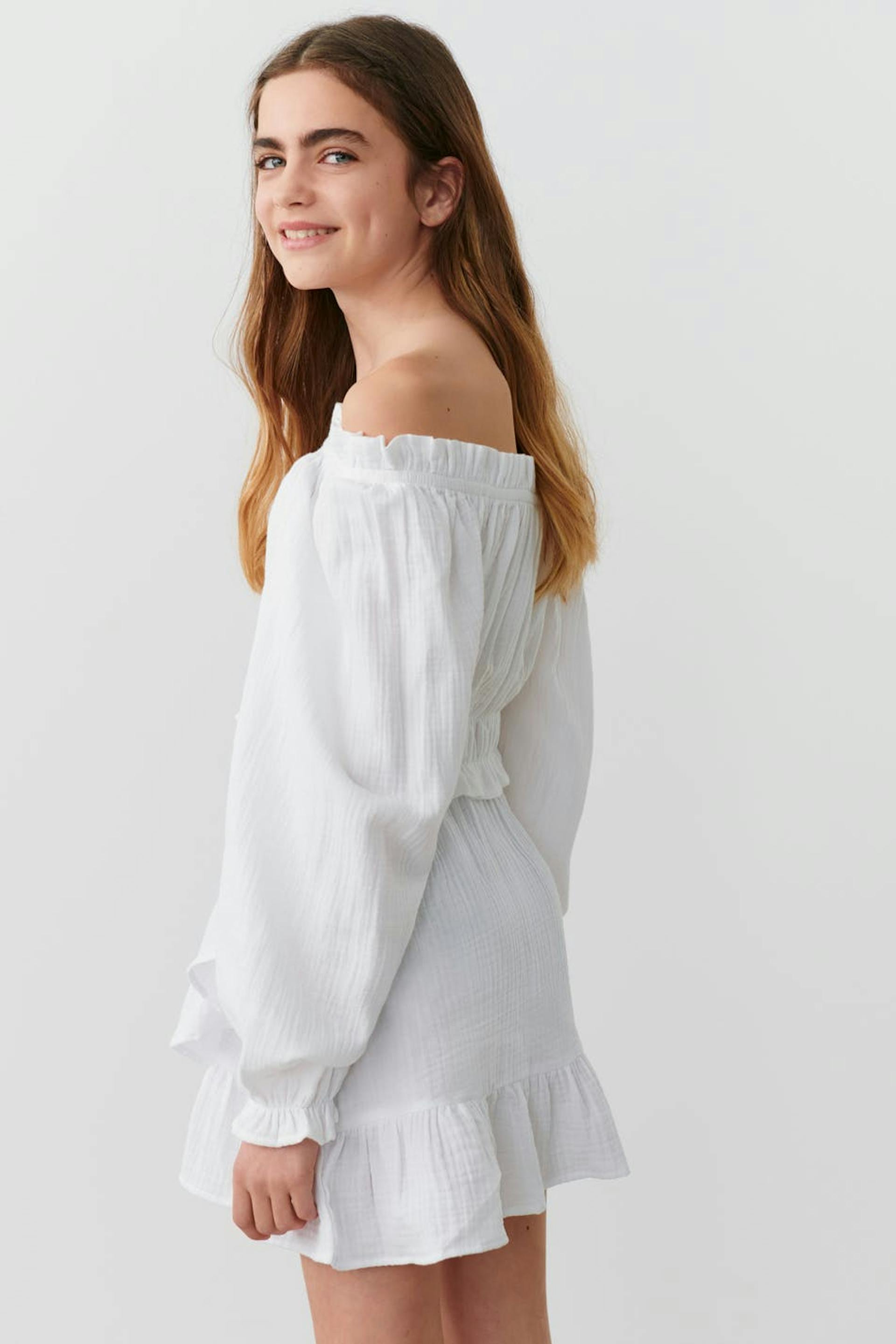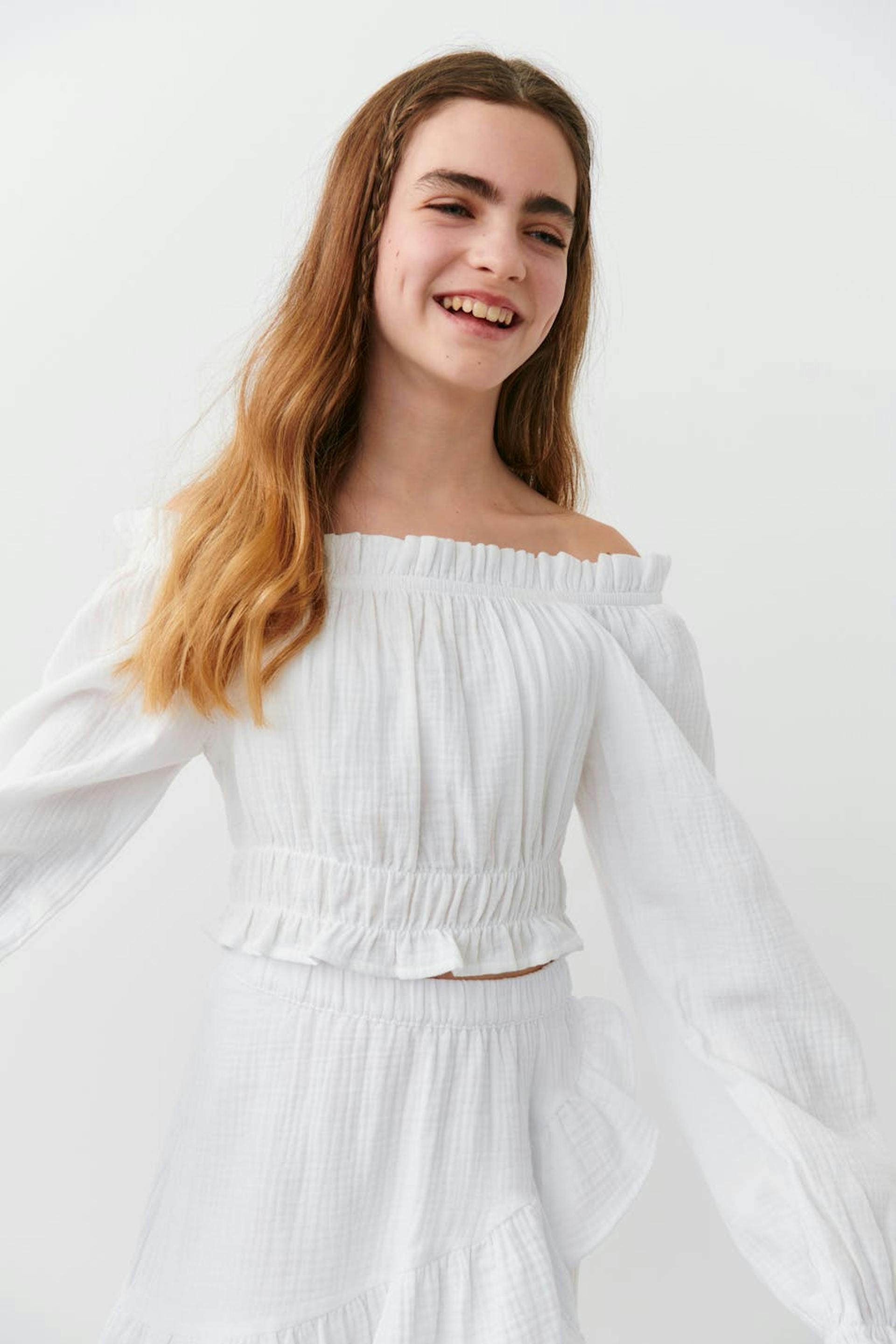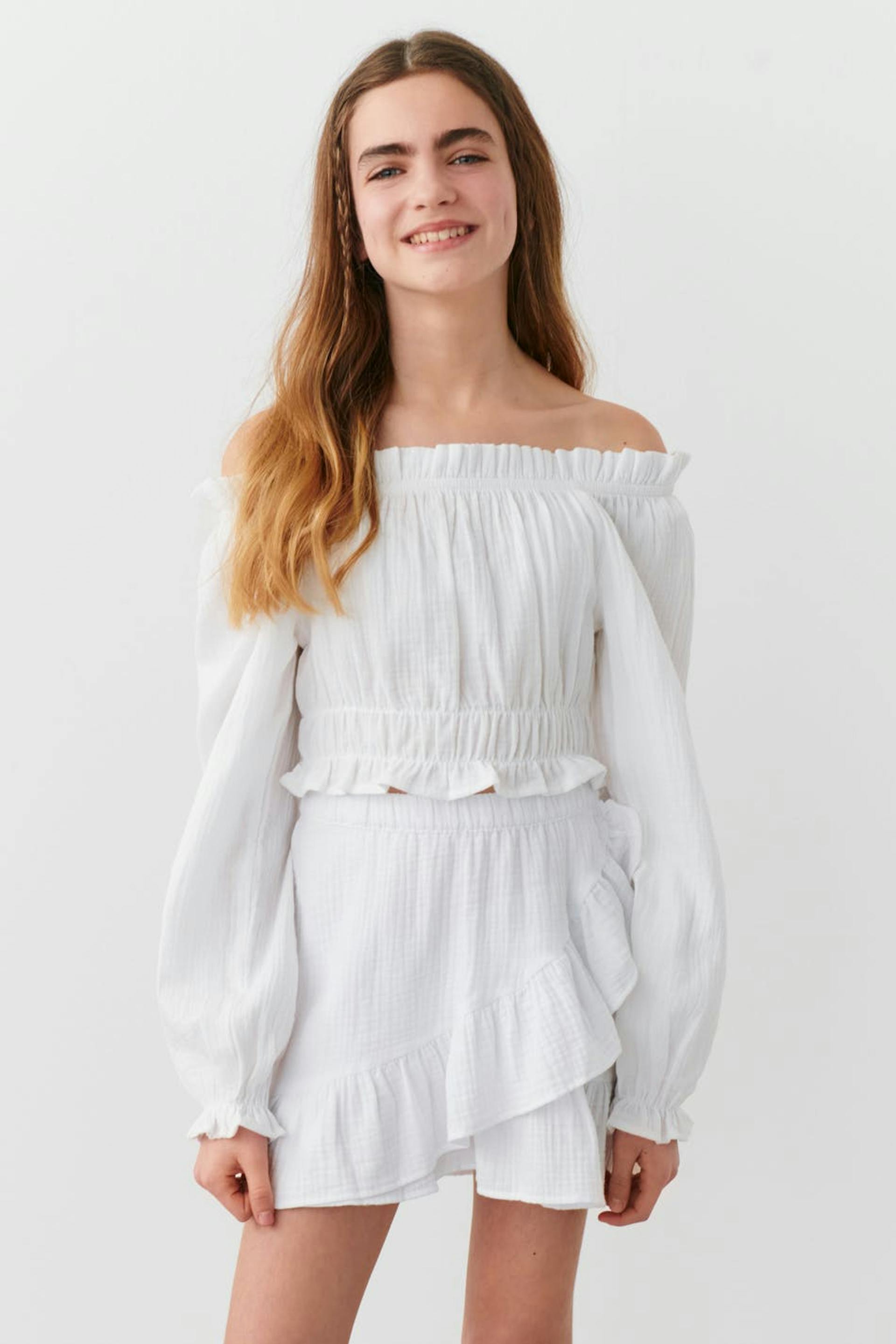 Abgeschnittene schulterfreie Bluse mit Gummiband in der Taille. Die Bluse ist weiβ und hat gemusterte Textur. Sie hat einen flauschigen Ärmel und Falten vorne.