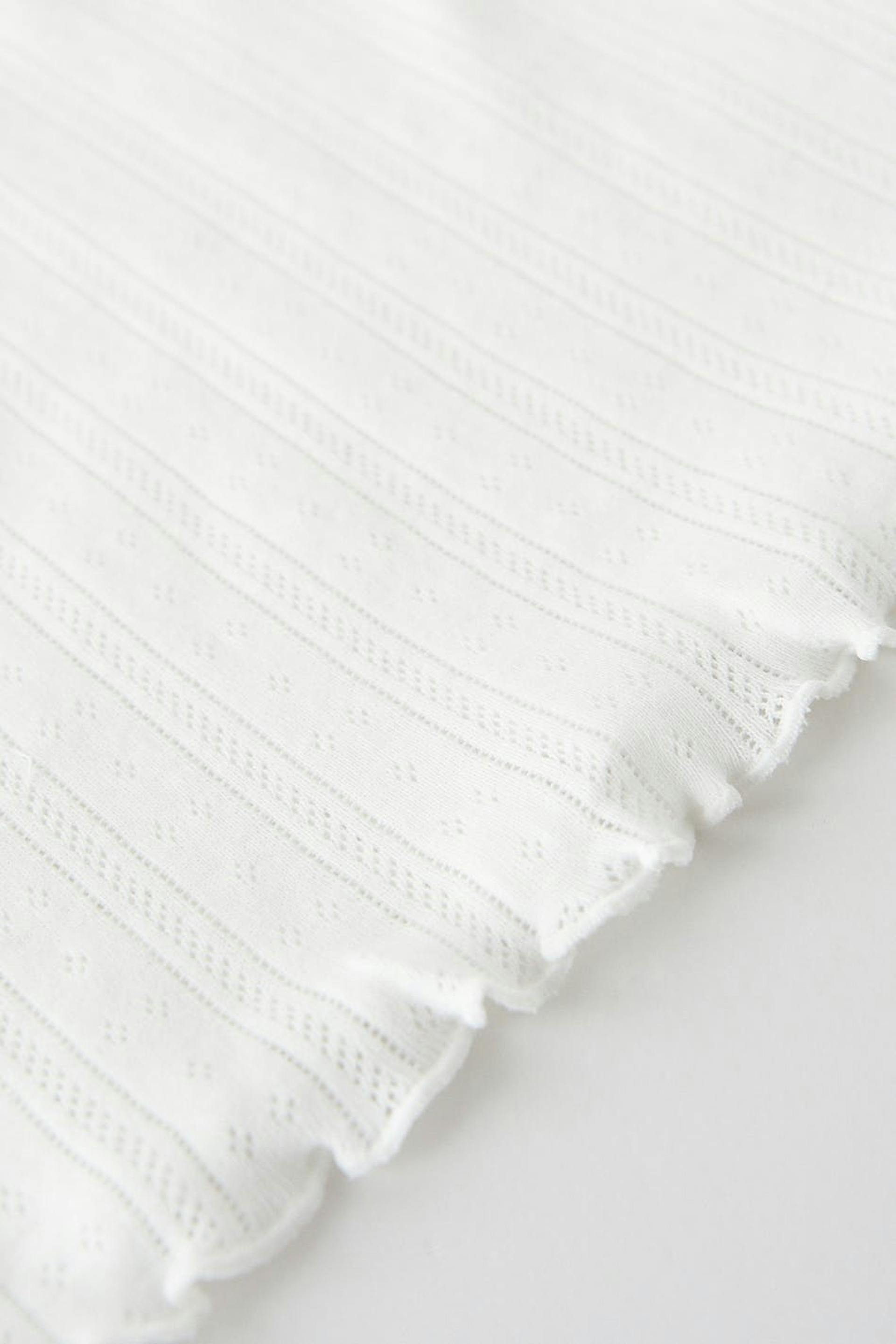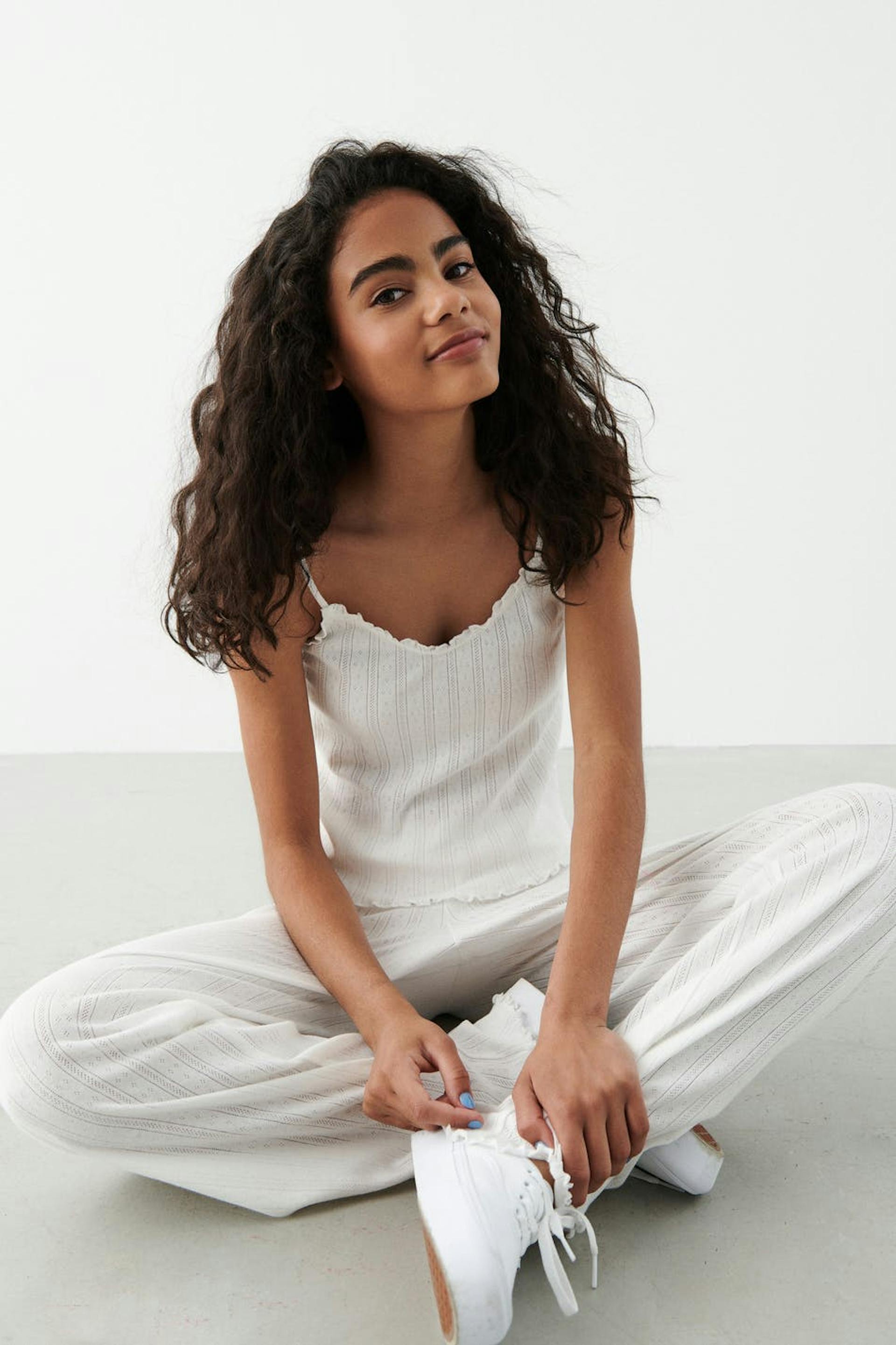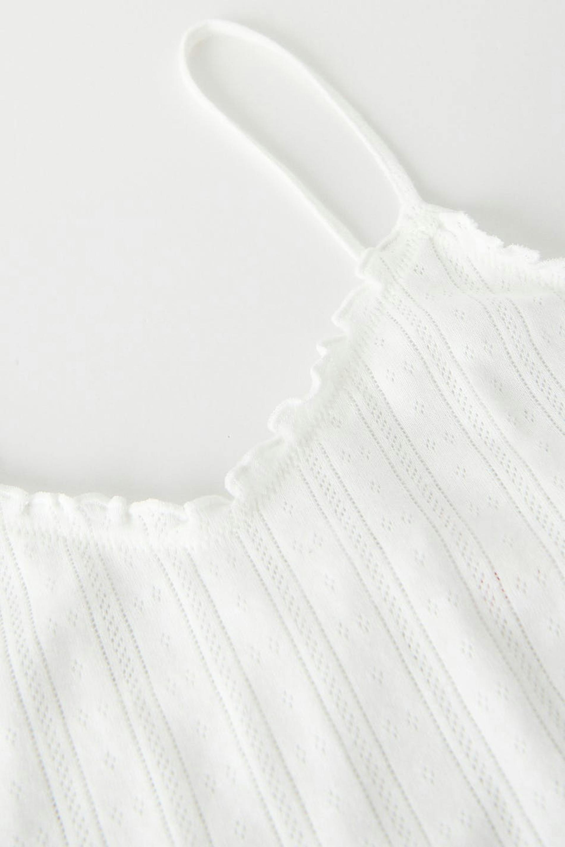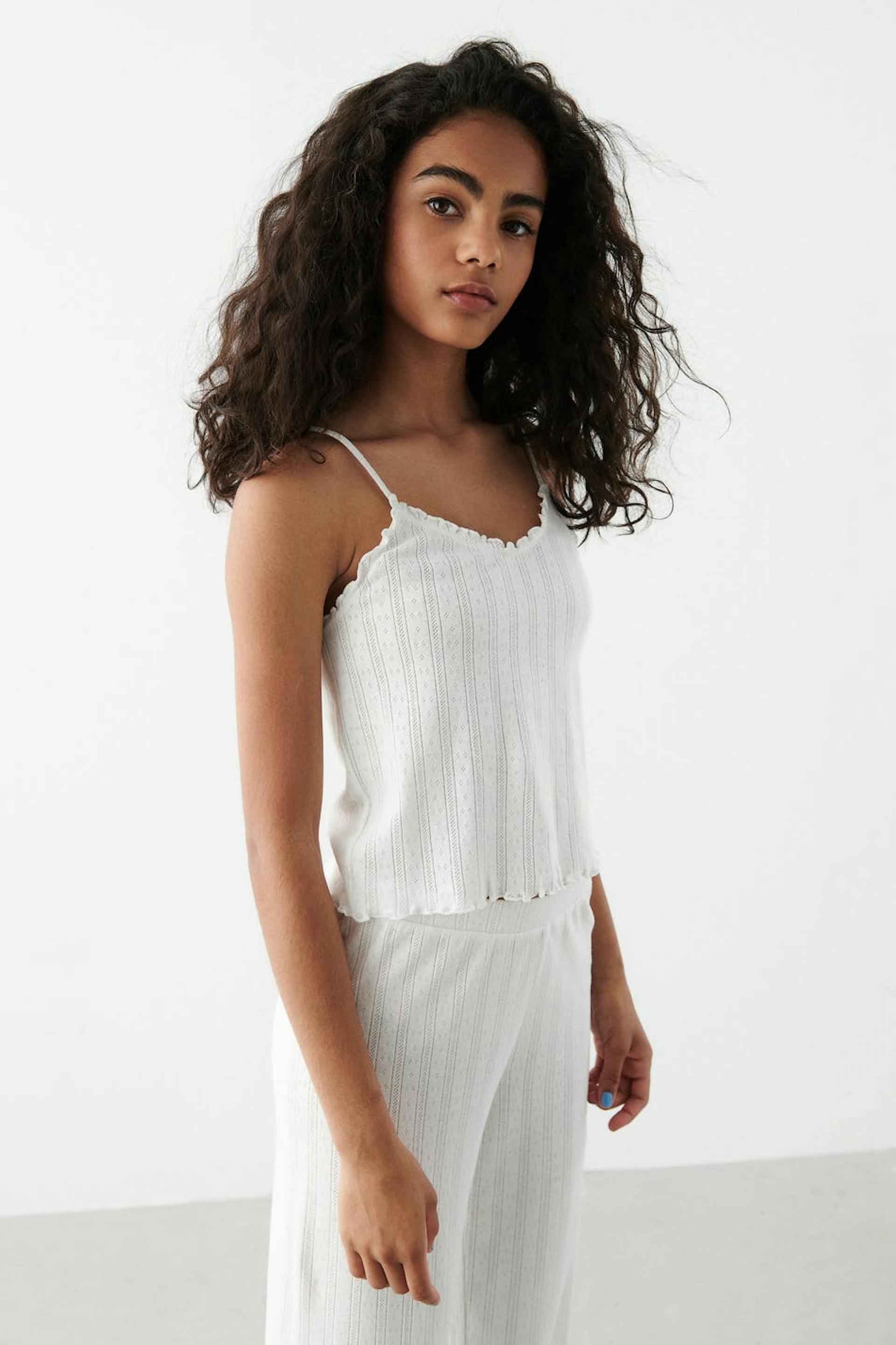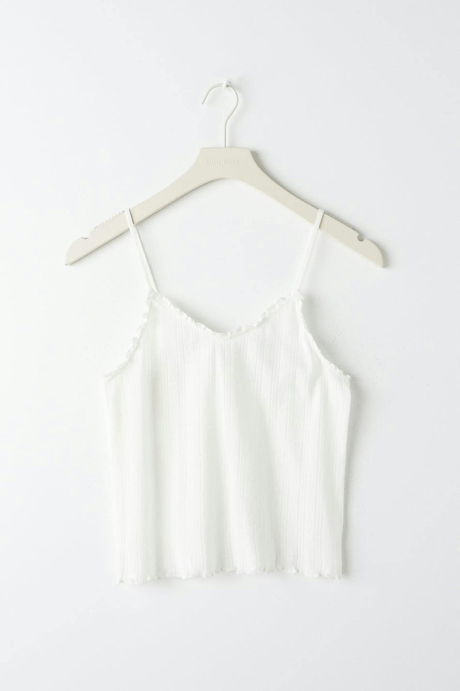 Niedliches Oberteil mit einer normalen Passform. Das Oberteil ist weiβ, abgeschnitten und ärmellos. Es hat krause Kanten und dünne Trägerbänder.