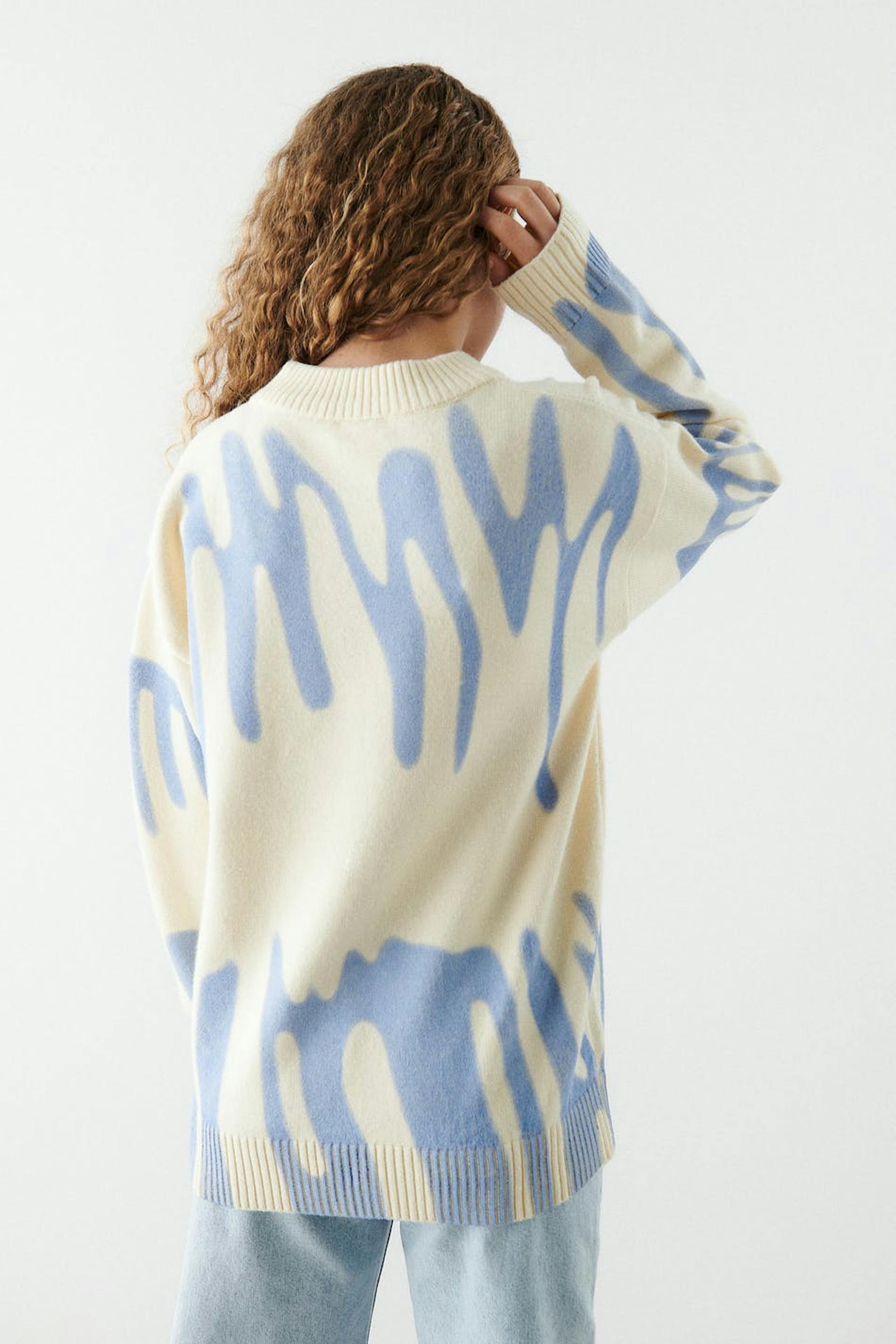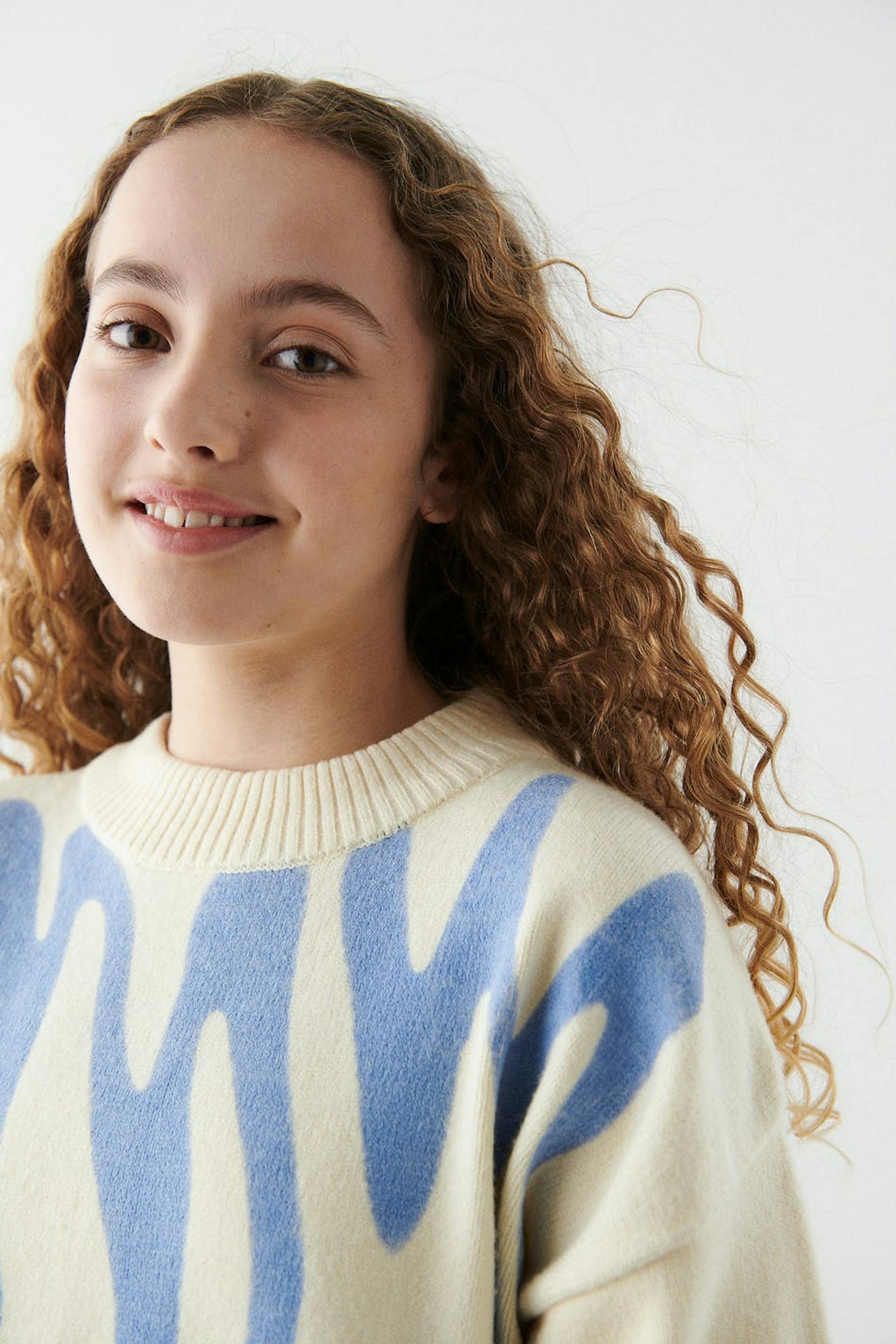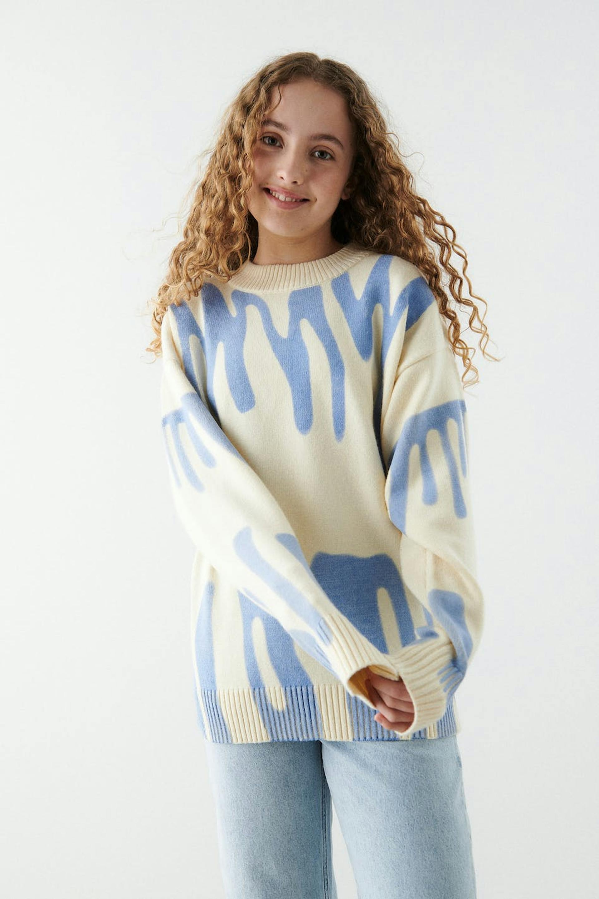 Strickpullover von aus unserem Young-Sortiment mit einer Oversize-Passform. Der Pullover ist beige und hat ein blaues Muster. Er hat gerippten Saum und einen Rundhalsausschnitt.