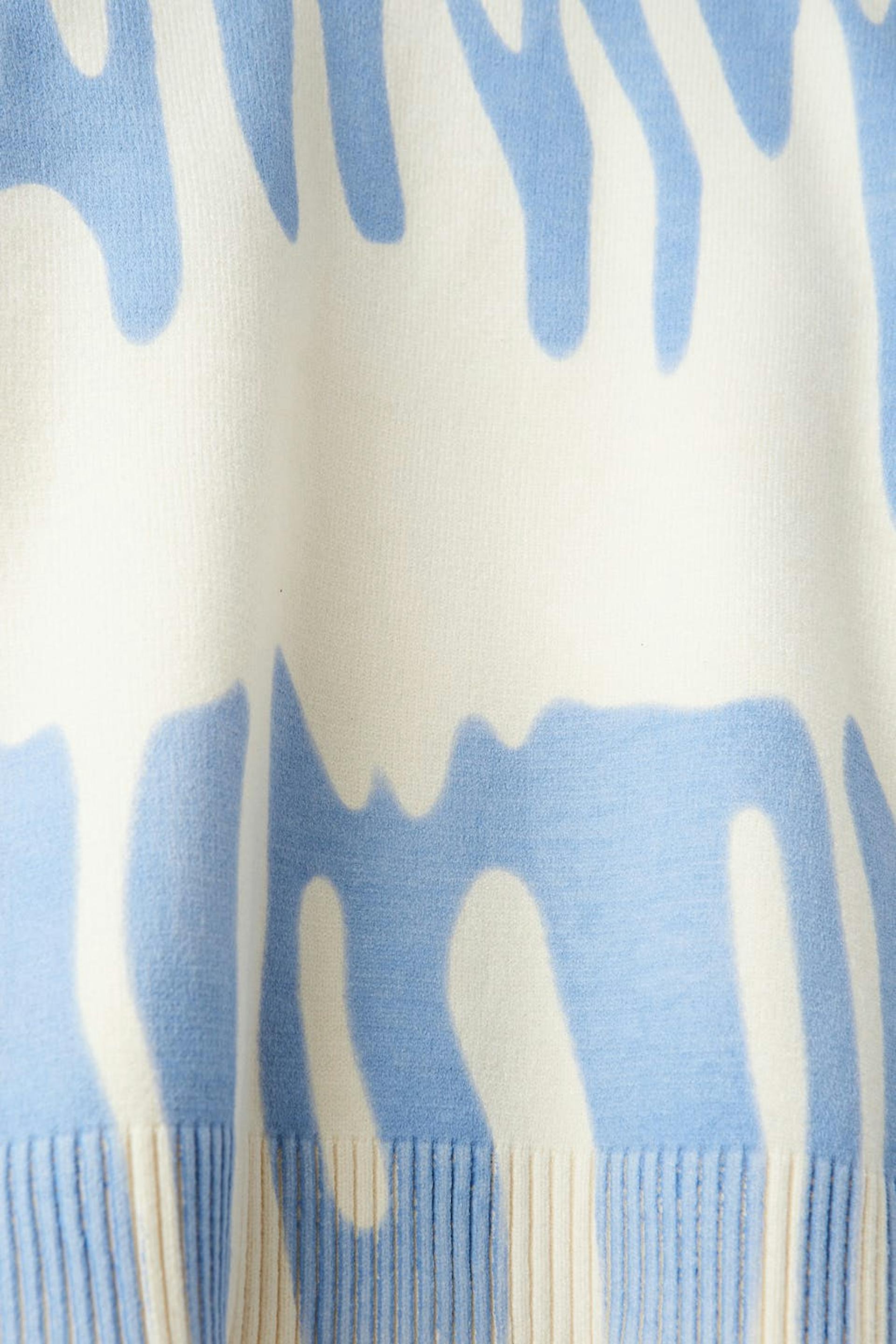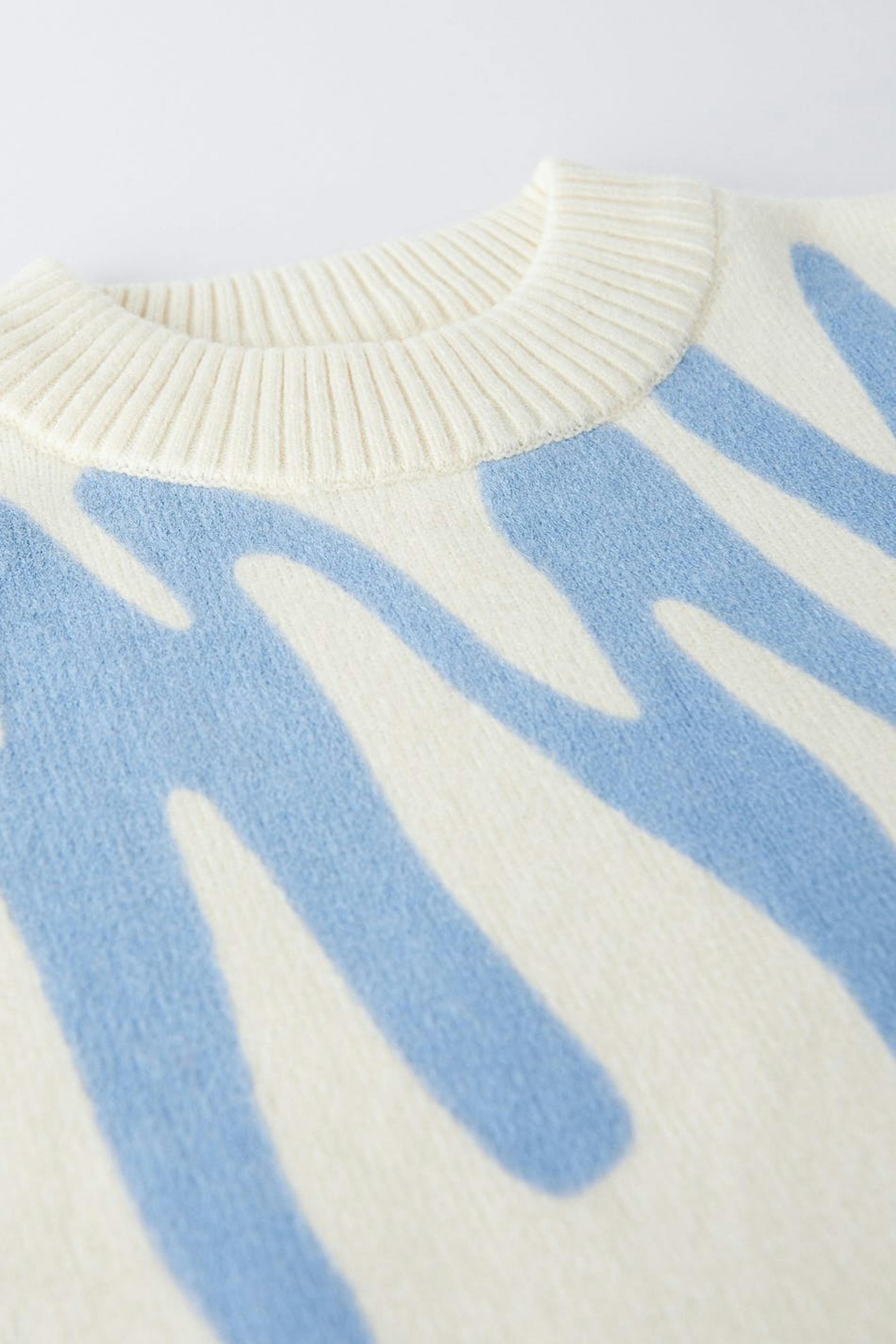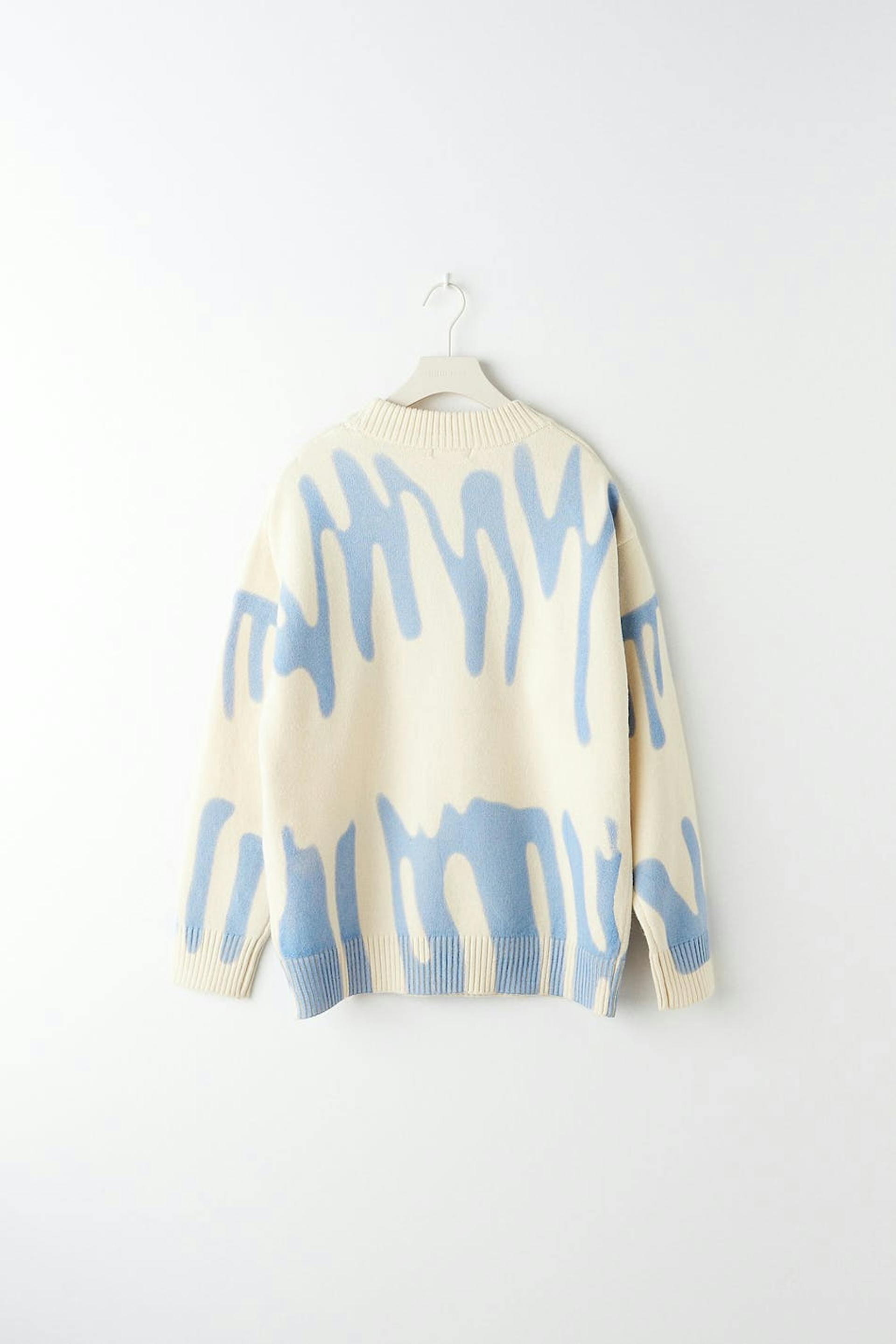 Strickpullover von aus unserem Young-Sortiment mit einer Oversize-Passform. Der Pullover ist beige und hat ein blaues Muster. Er hat gerippten Saum und einen Rundhalsausschnitt.