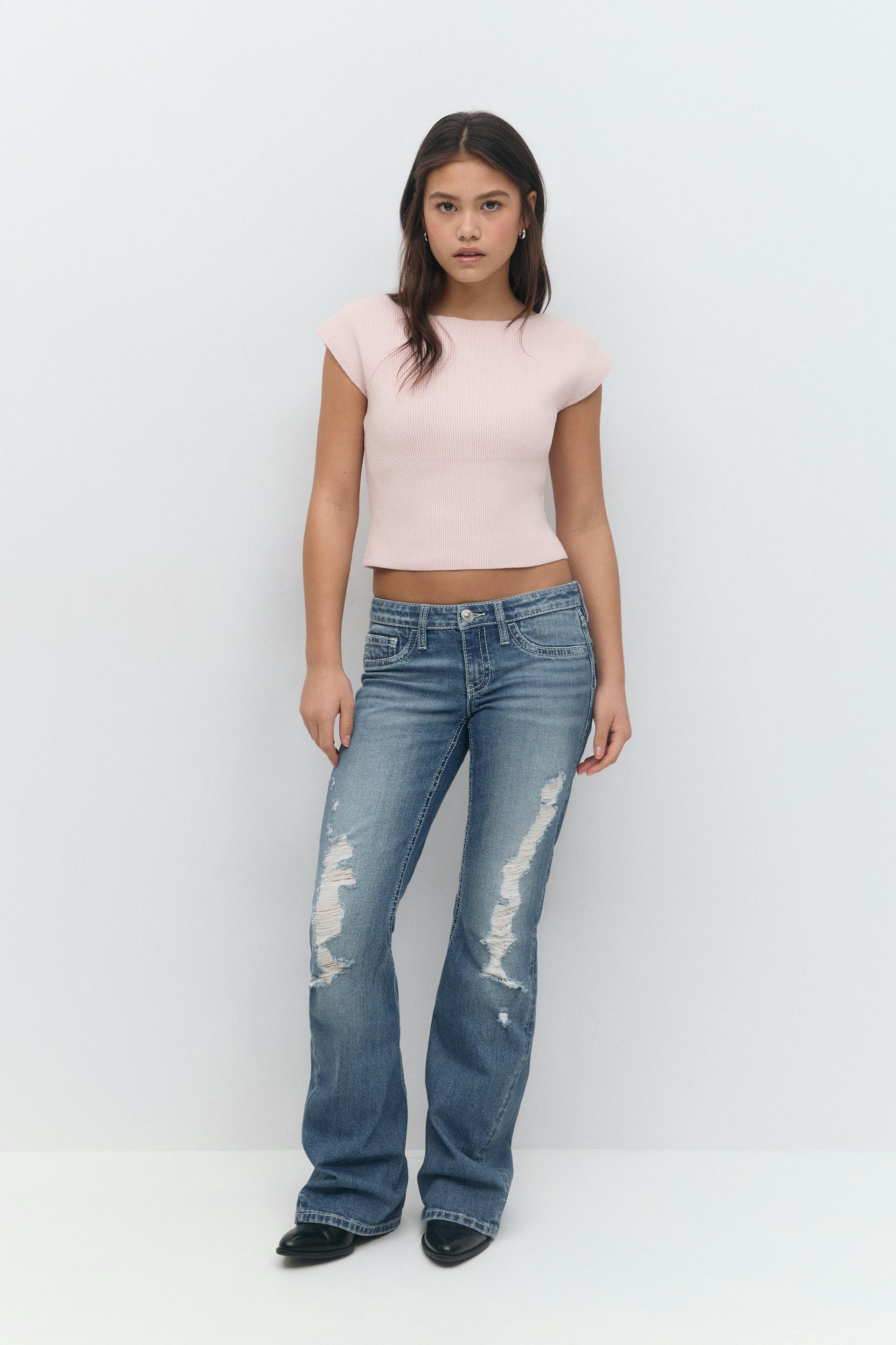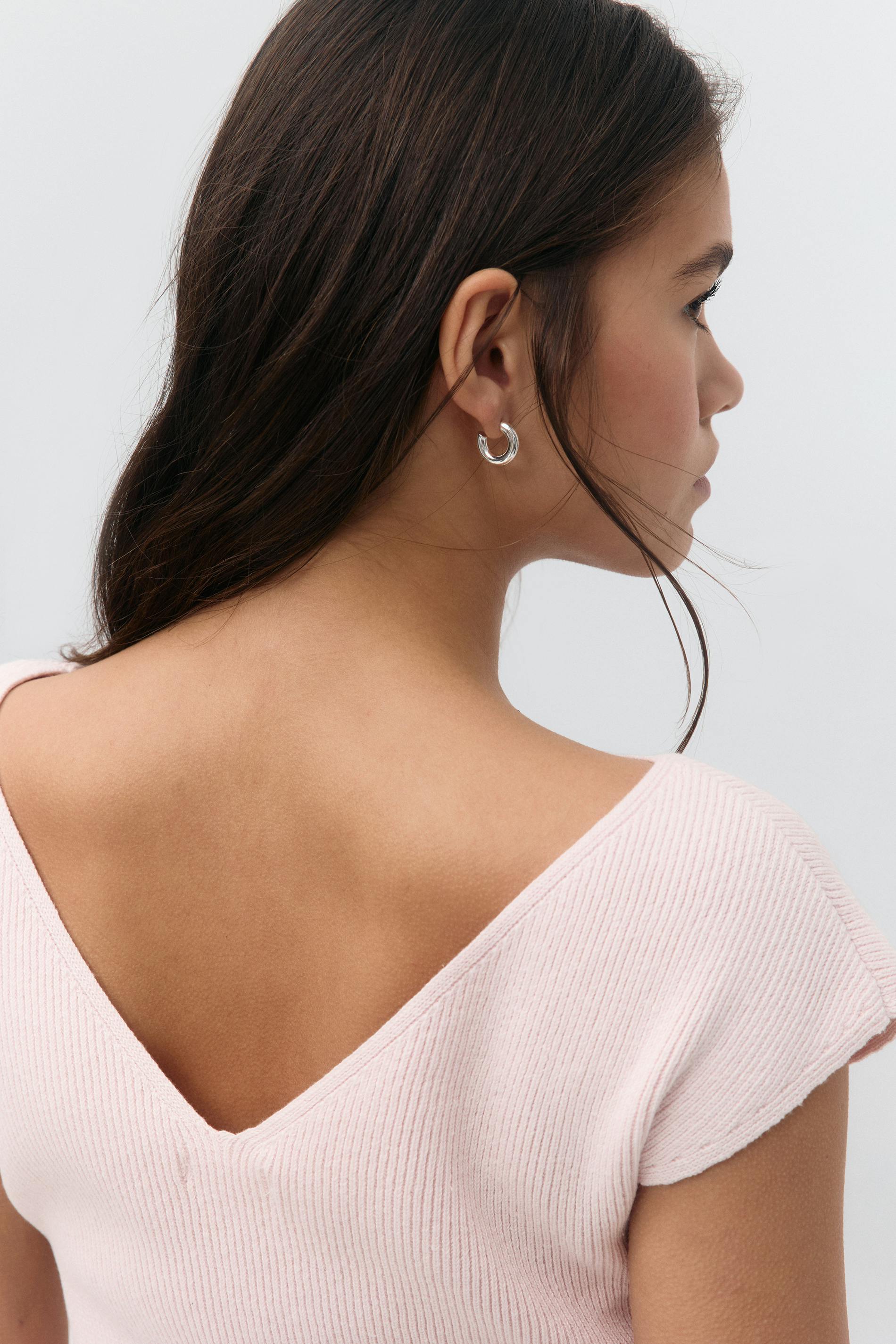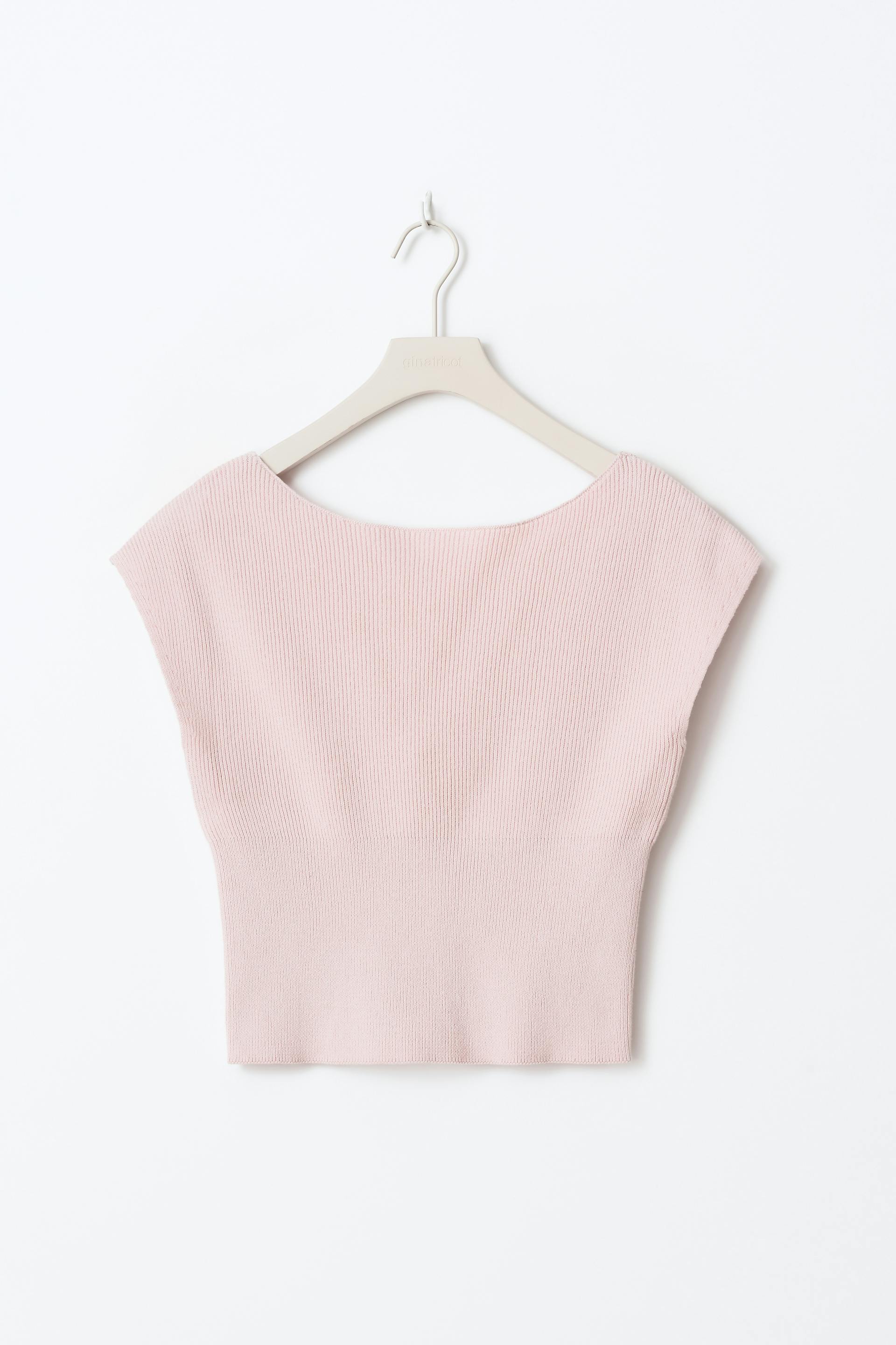 Geripptes Oberteil mit einem V-Ausschnitt auf der Rückseite. Das Oberteil ist rosa und ärmellos und hat eine normale Passform.