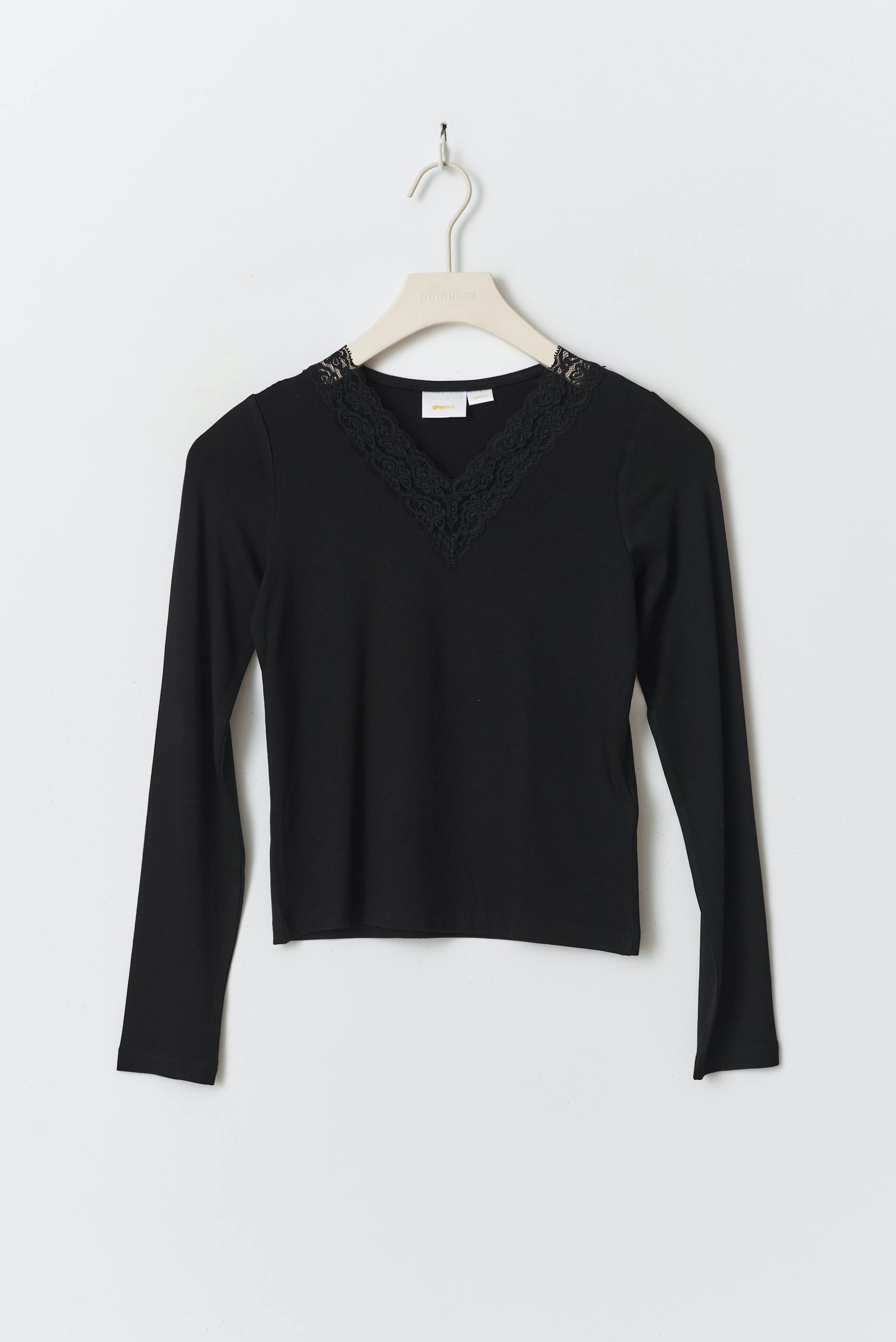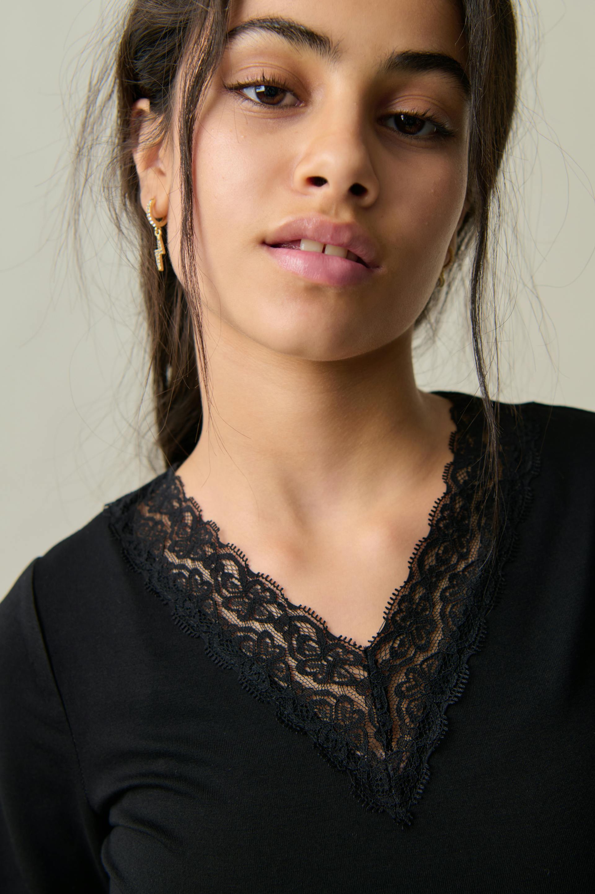 Langärmeliges Top mit Spitze am Ausschnitt. Das Oberteil ist schwarz und hat V-Ausschnitt. Es hat figurbetonte Passform.