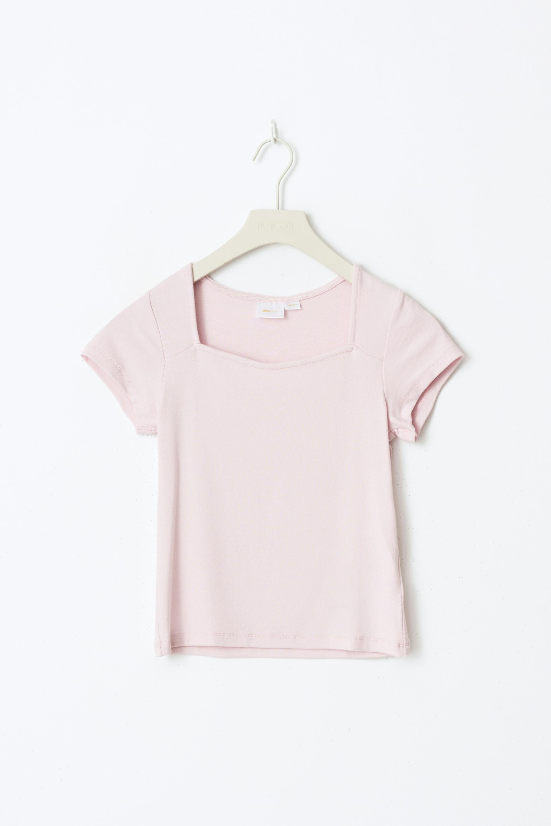 Kurzärmliges Oberteil mit quadratischem Ausschnitt. Das Oberteil ist rosa und hat normale Passform.