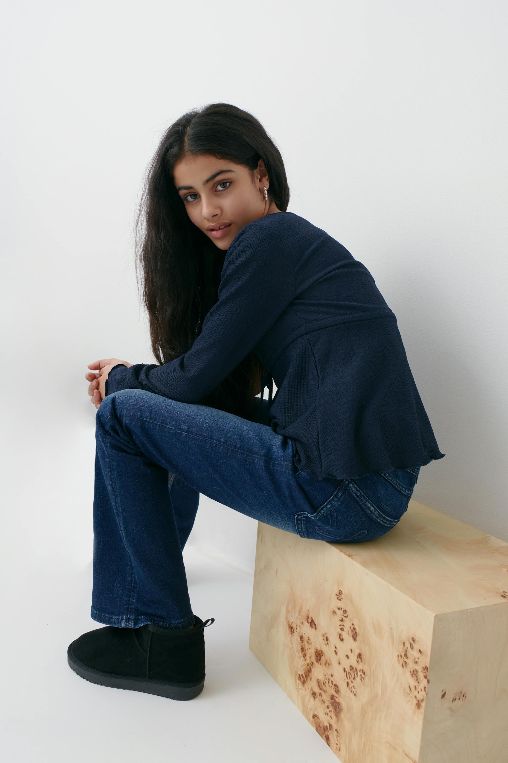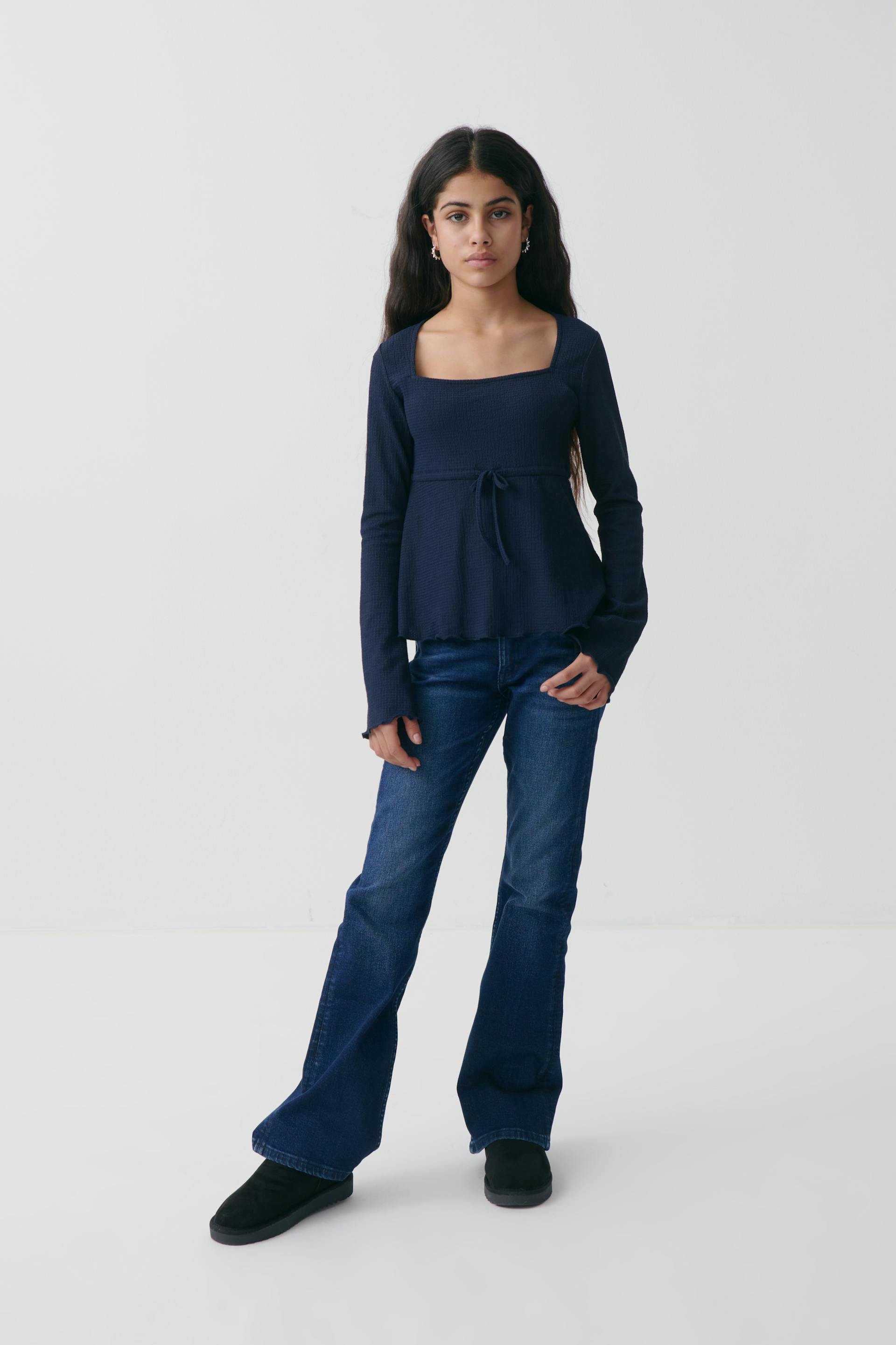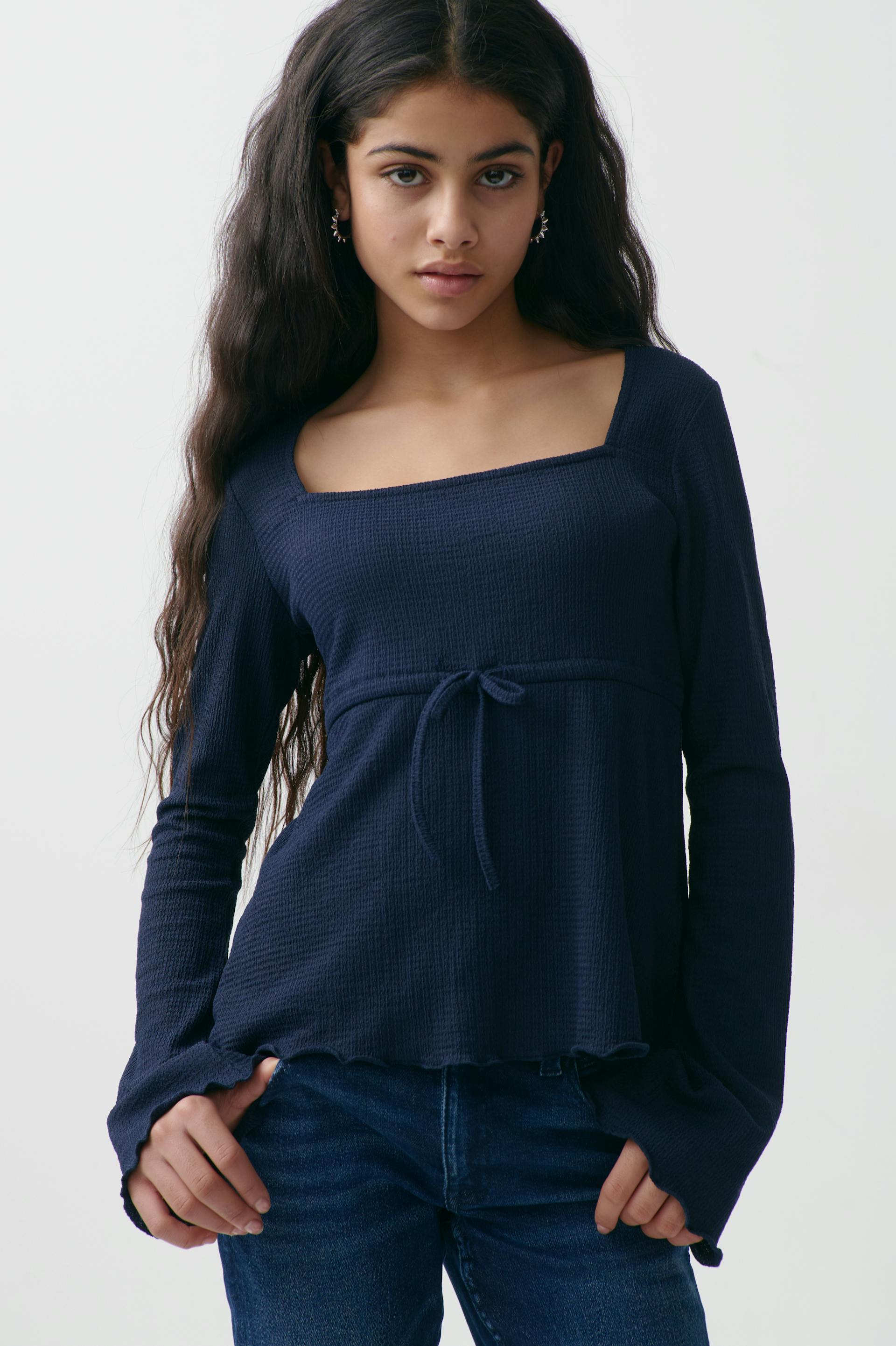 Langärmliges Oberteil aus Jersey mit Knoten-Detail in der Taille. Das Oberteil ist marineblau und hat strukturiertes Material. Es hat quadratischen Ausschnitt und gekettelte Naht.
