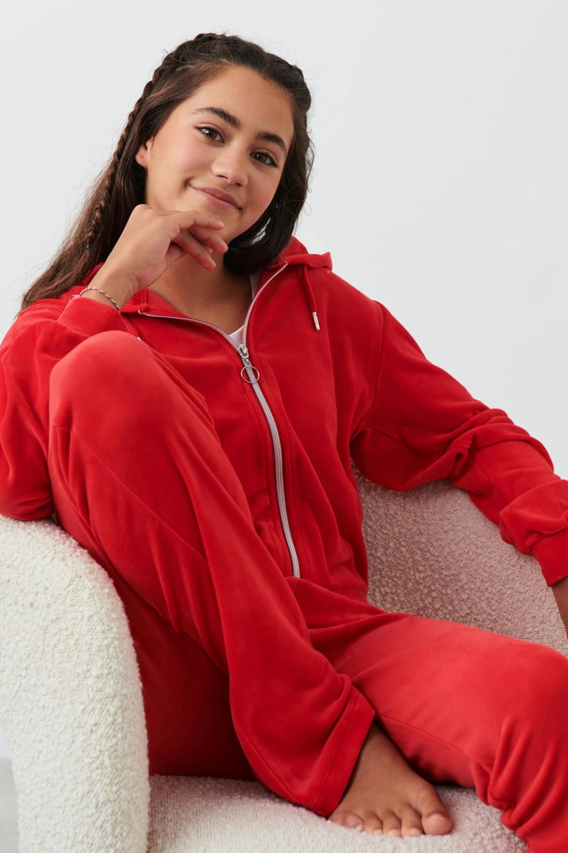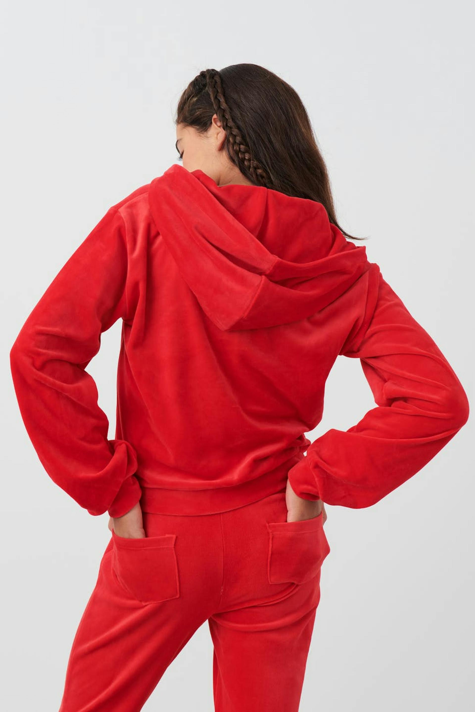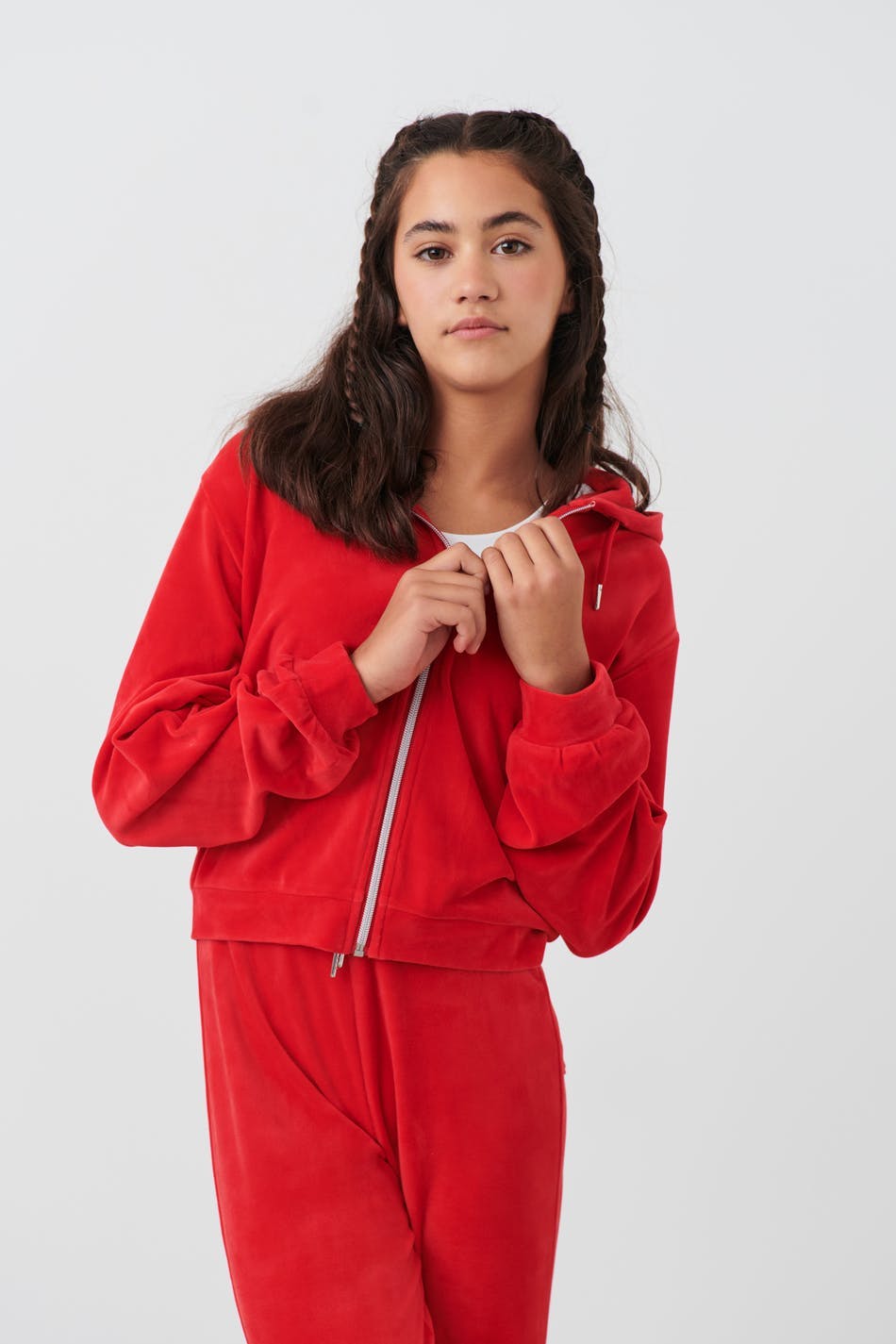 Abgeschnittener Hoodie aus Velours mit Reißverschluss vorne. Der Hoodie ist rot und hat langen Ärmel mit Manschette.