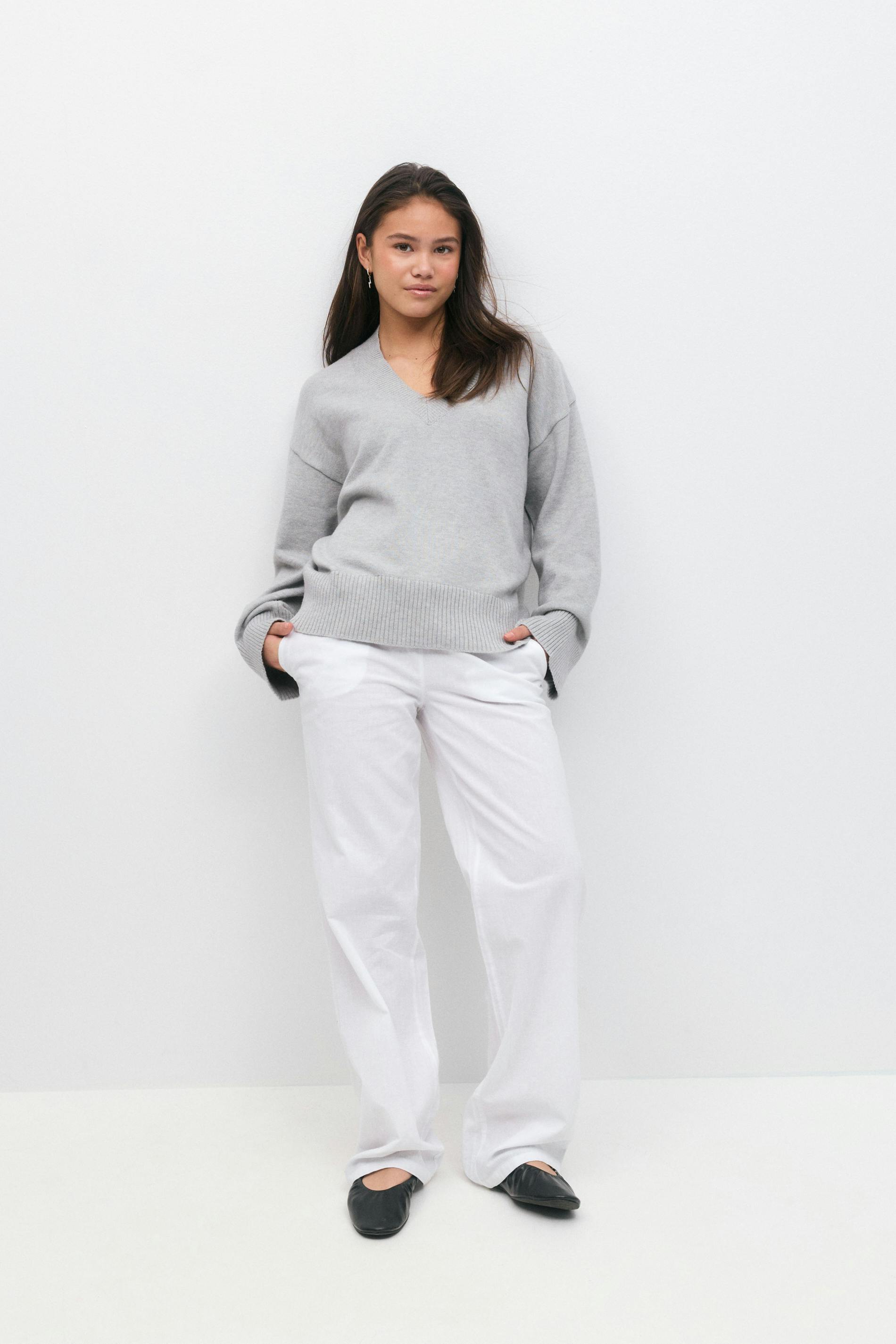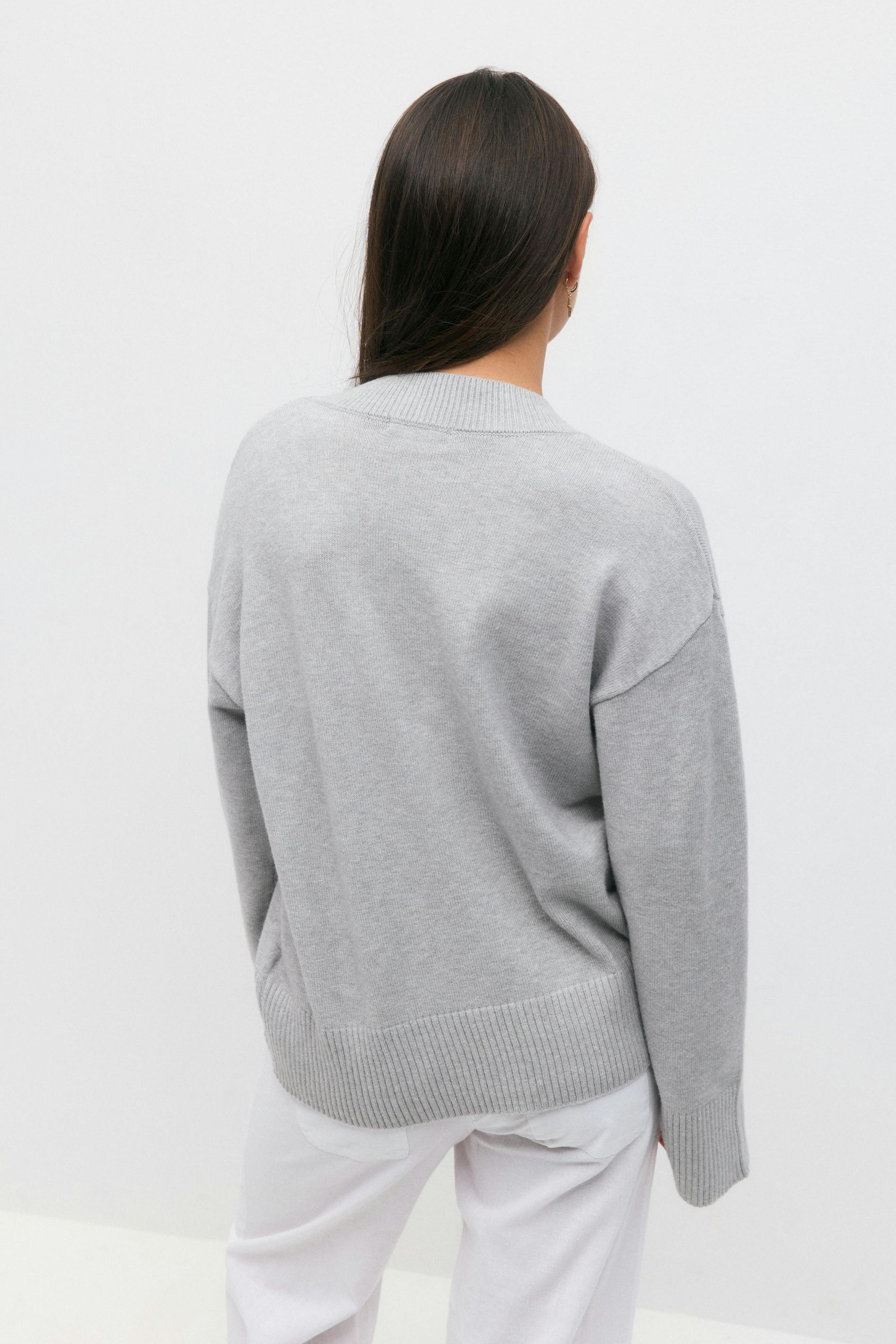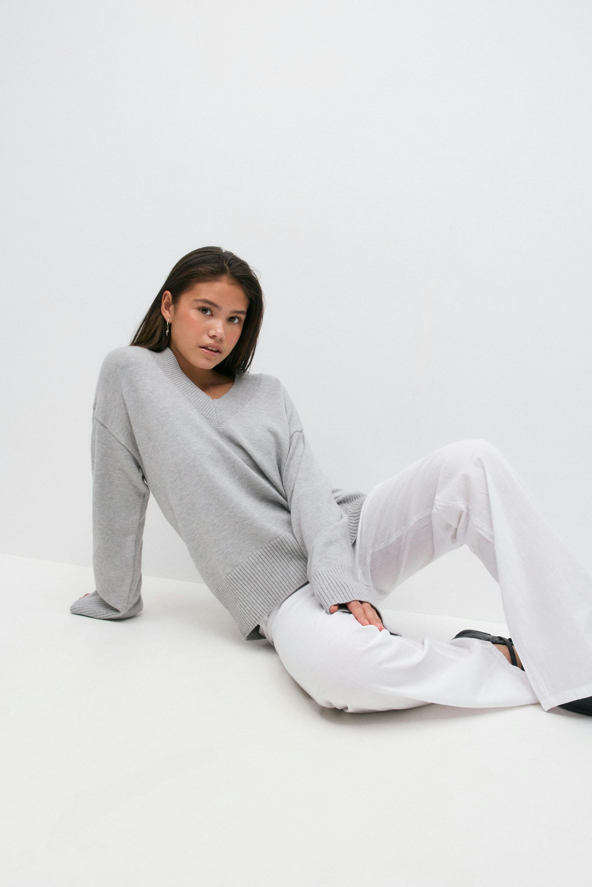 Strickpullover mit V-Ausschnitt. Der Pullover ist grau und hat Oversize-Passform. Er hat langen Ärmel, weiche Qualität und Rippenstrick an den Ärmelenden und an der Unterkante.