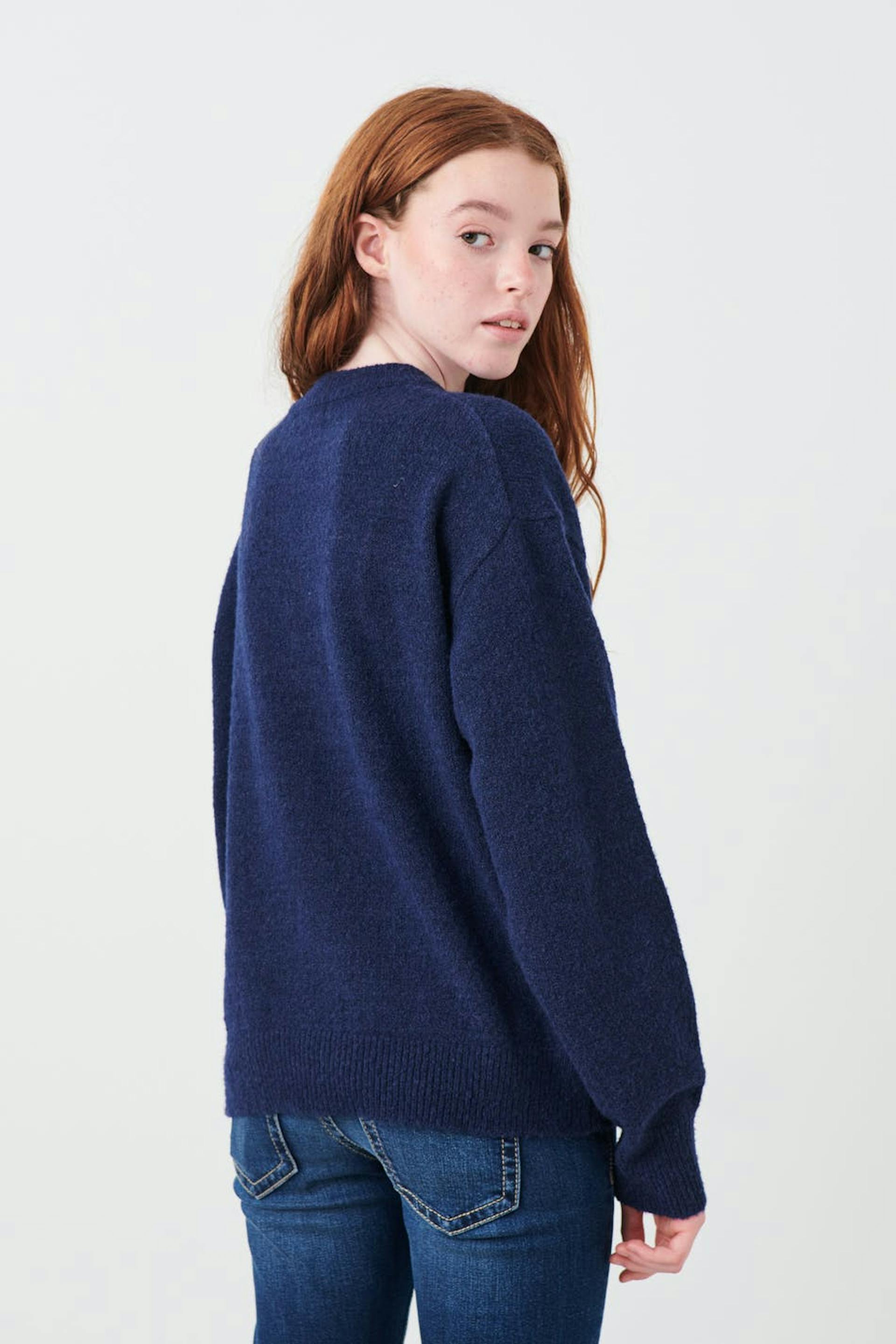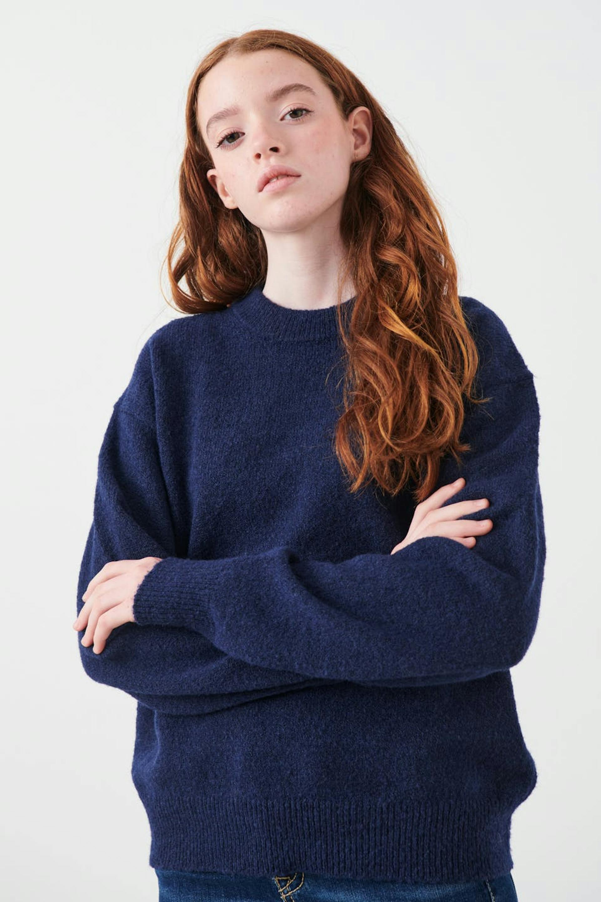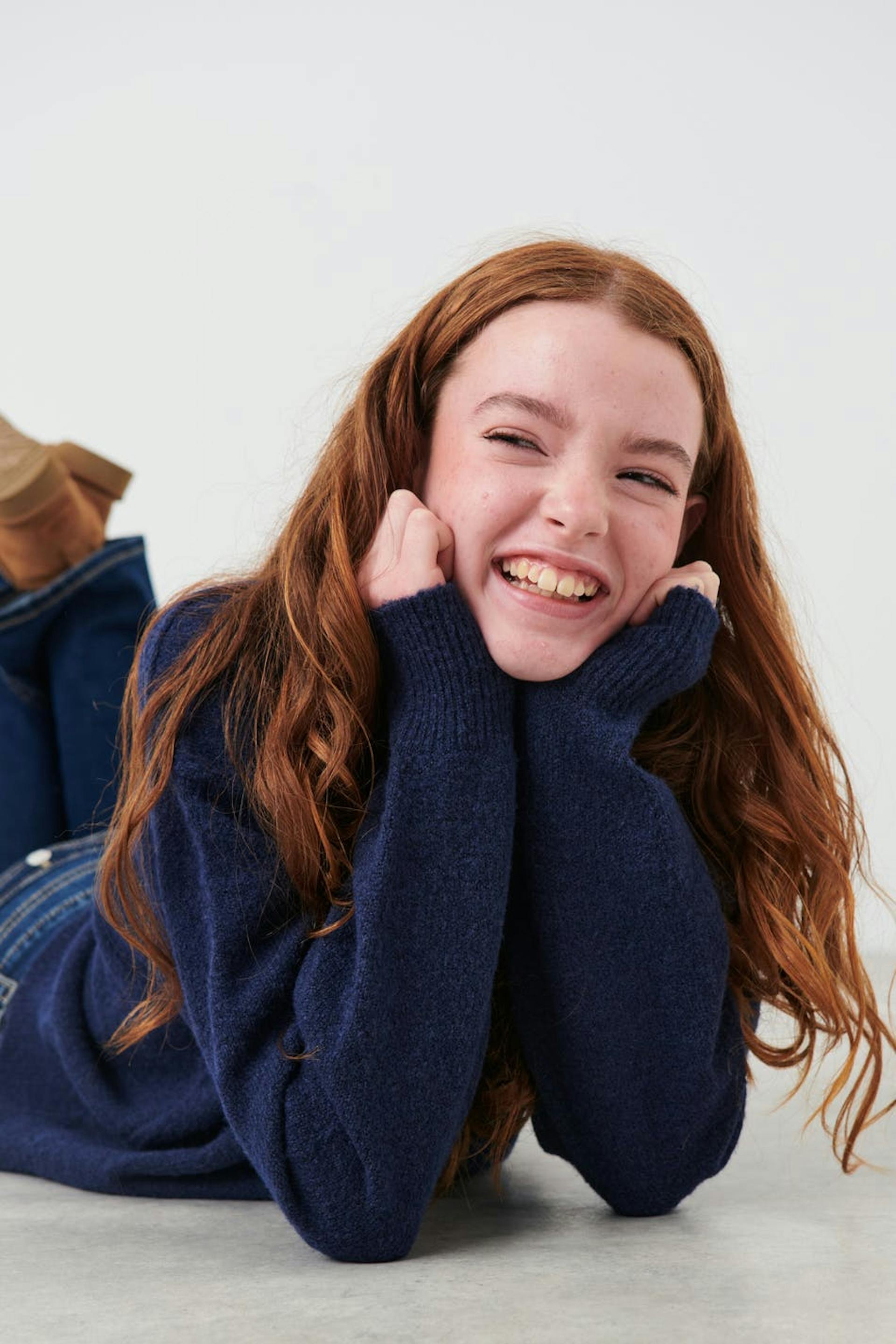 Weich gestrickter Pullover mit boxy Passform. Der Pullover ist blau und hat breite Ärmel. Er hat Rundhalsausschnitt und Rippenstrick an den Ärmelenden und an der Unterkante.