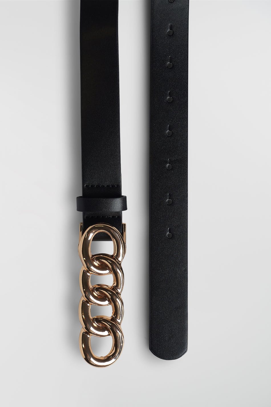 Bælte med et gyldent spænde. Bæltet er sort. Det er fremstillet af PU.