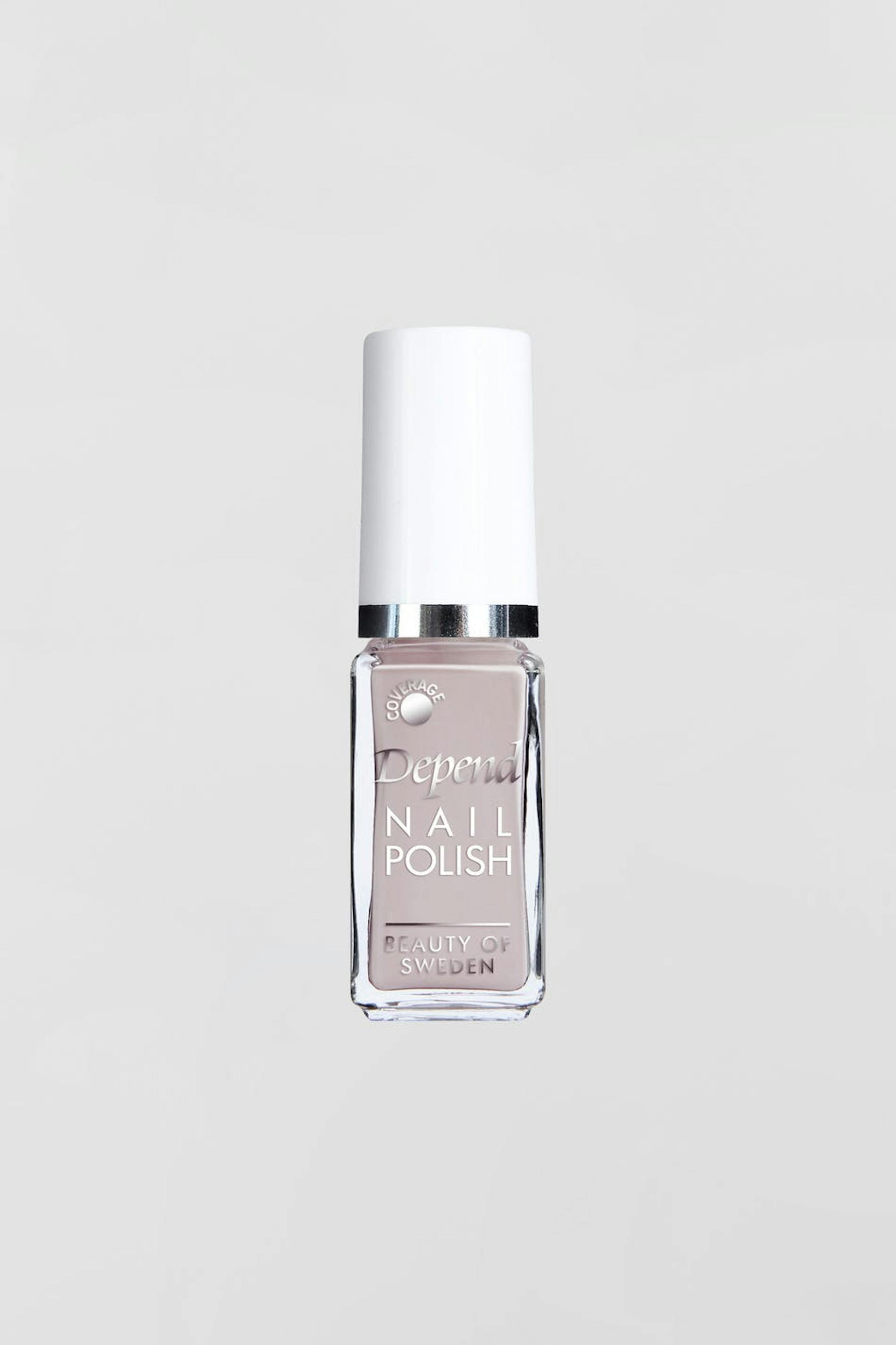 Lille neglelak fra Depend med en flad børste med en afrundet kant. Neglelaken er beige.