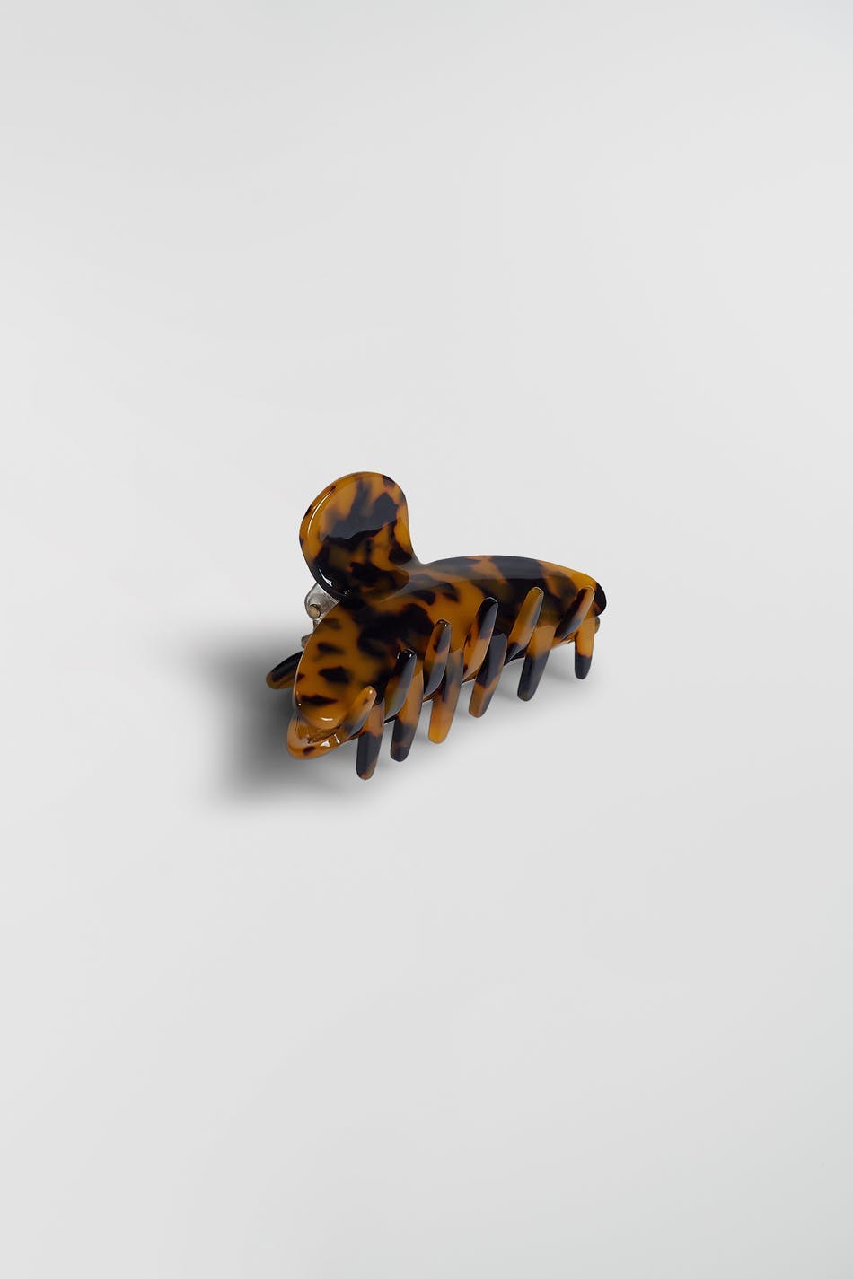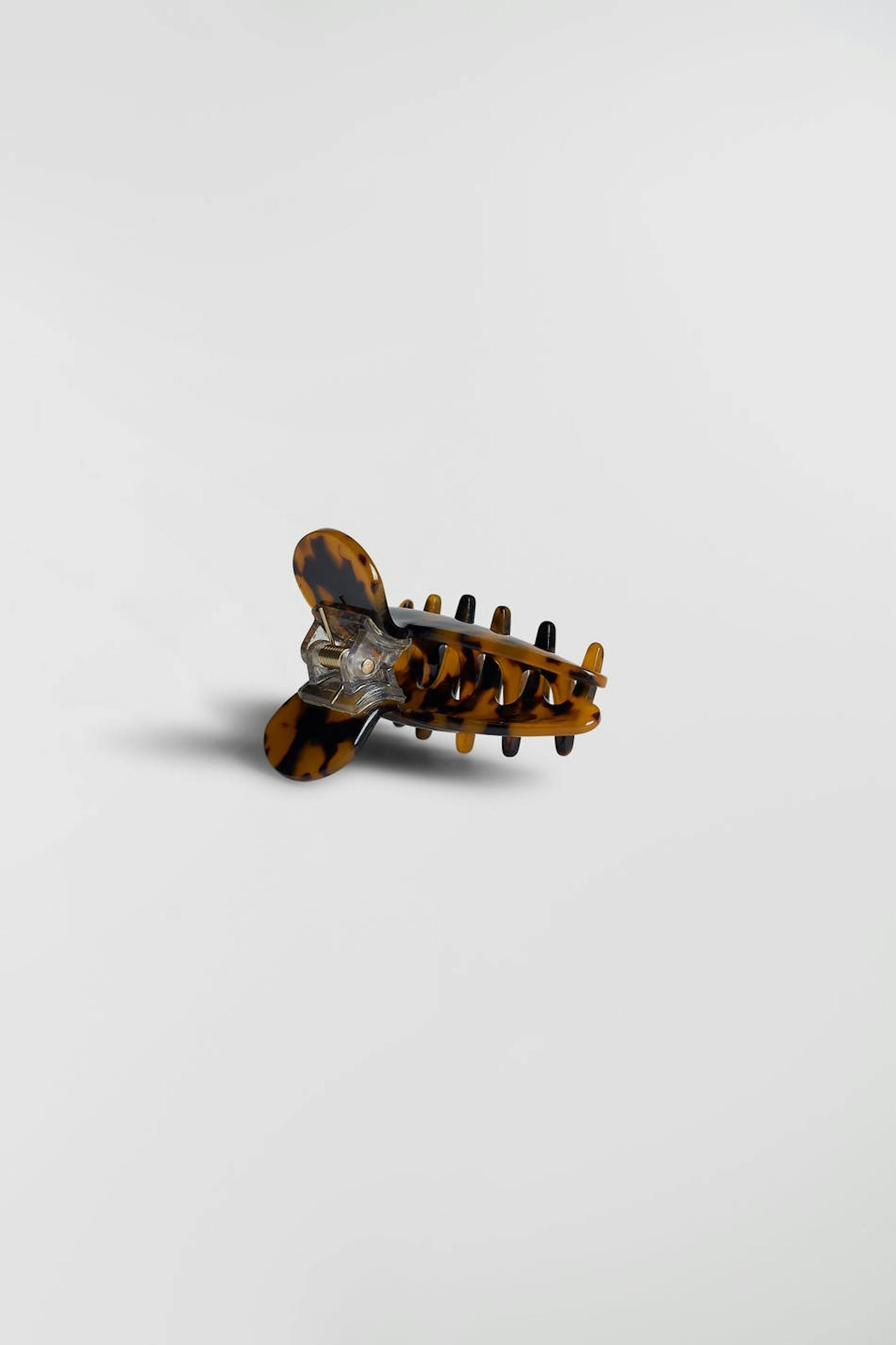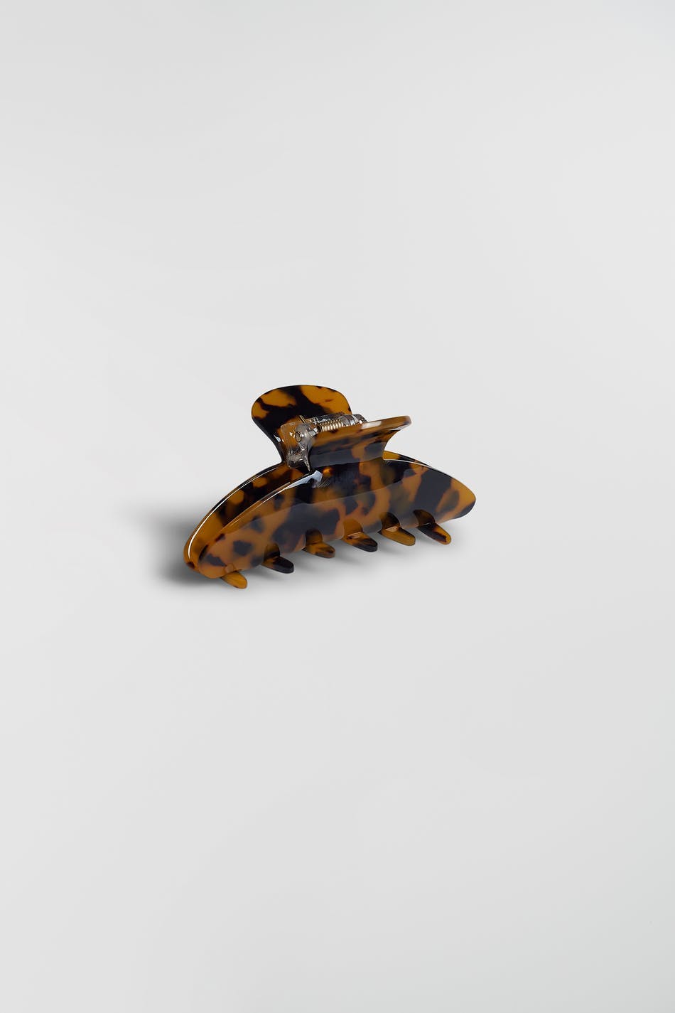 Klassisk hårklemme med et meleret mønster. Hårspændet er brunt, sort og stort.