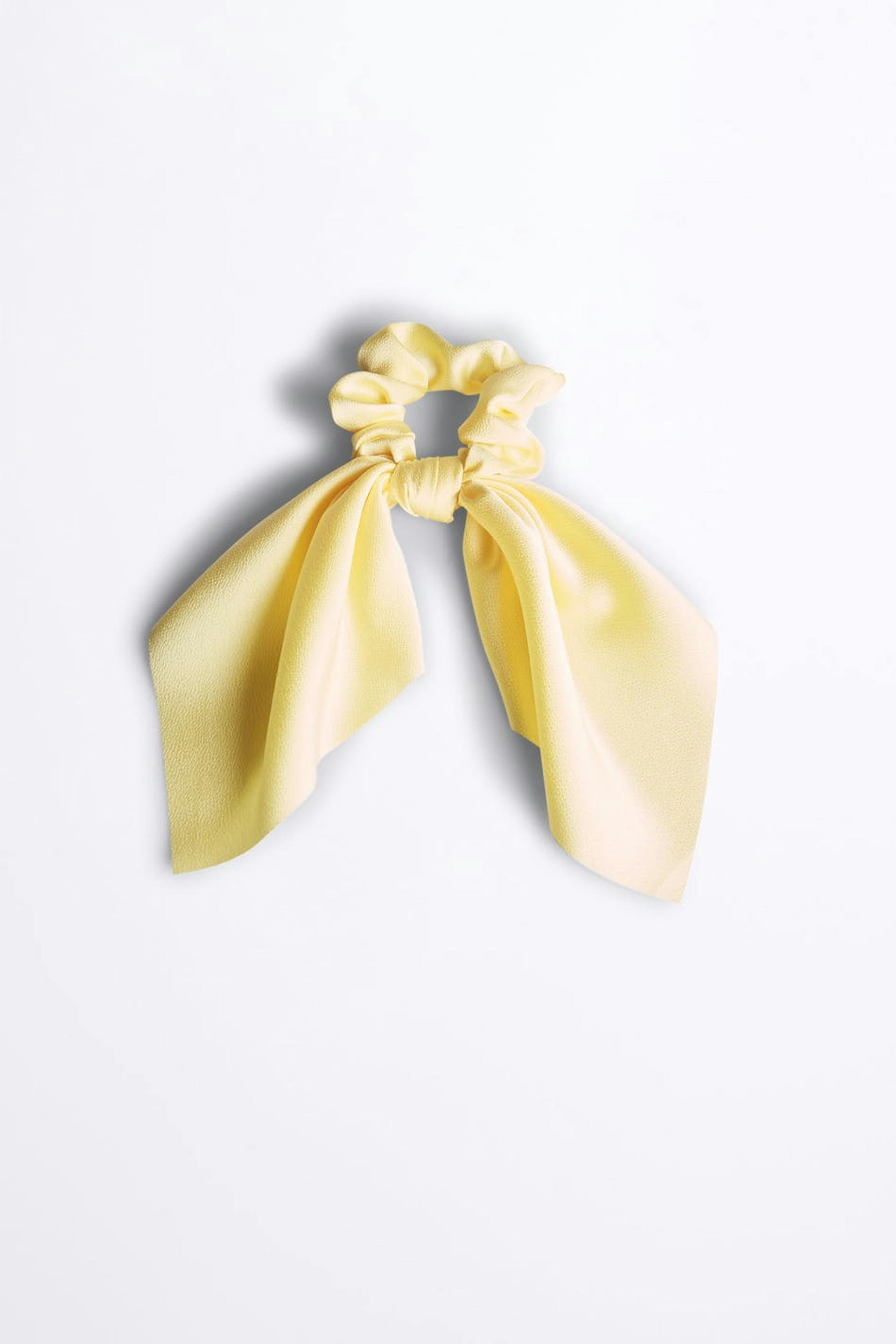 Scrunchie med knudedetalje. Håraccessoryen er gul.