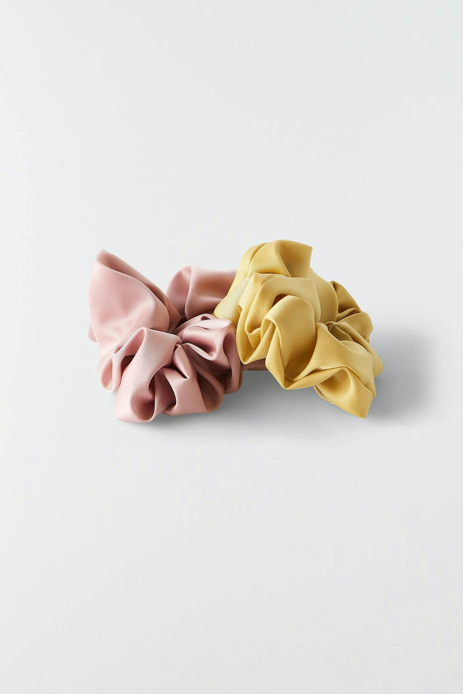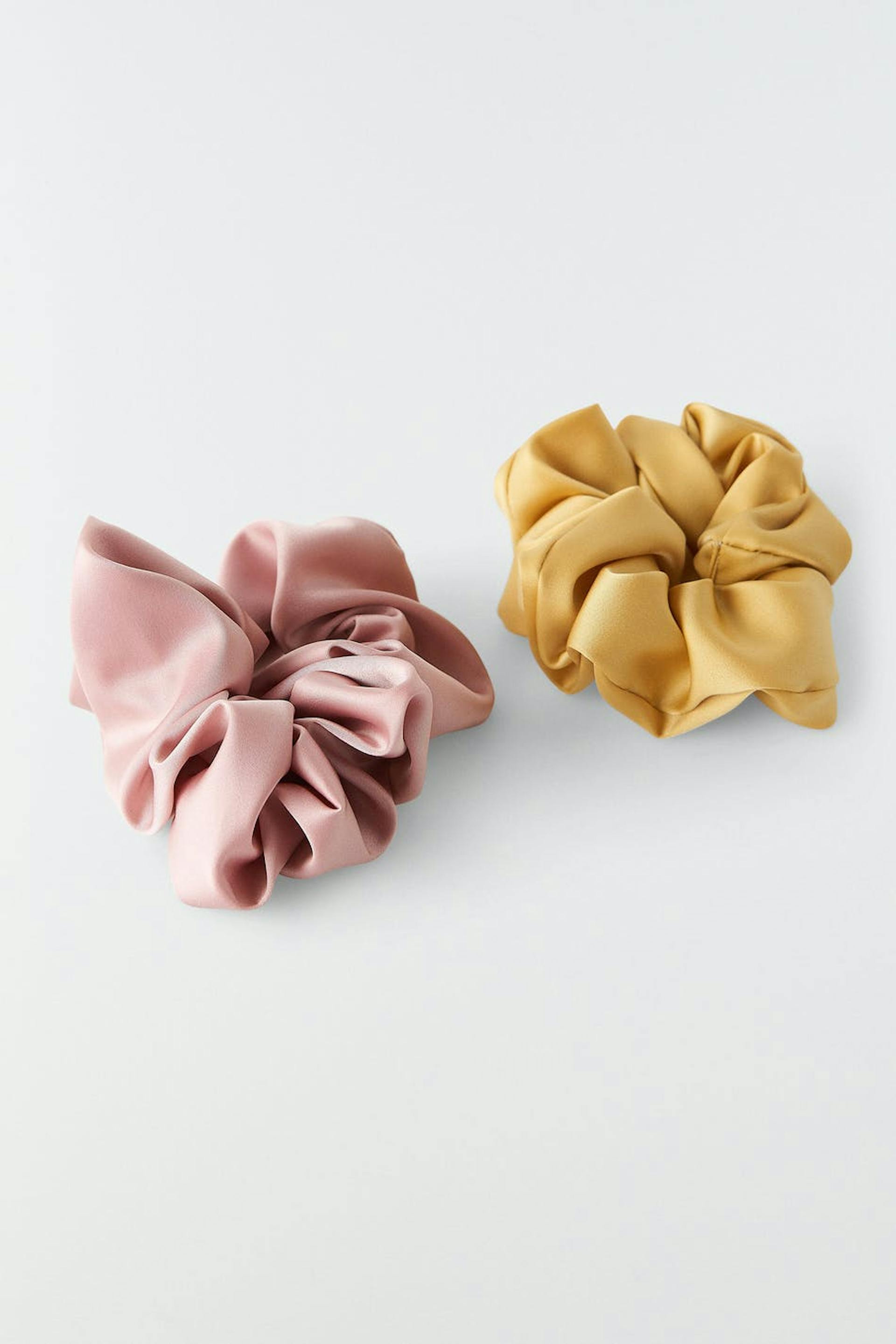 2-pak hårelastikker med et skinnende stof. Accessorierne er gule og pink.