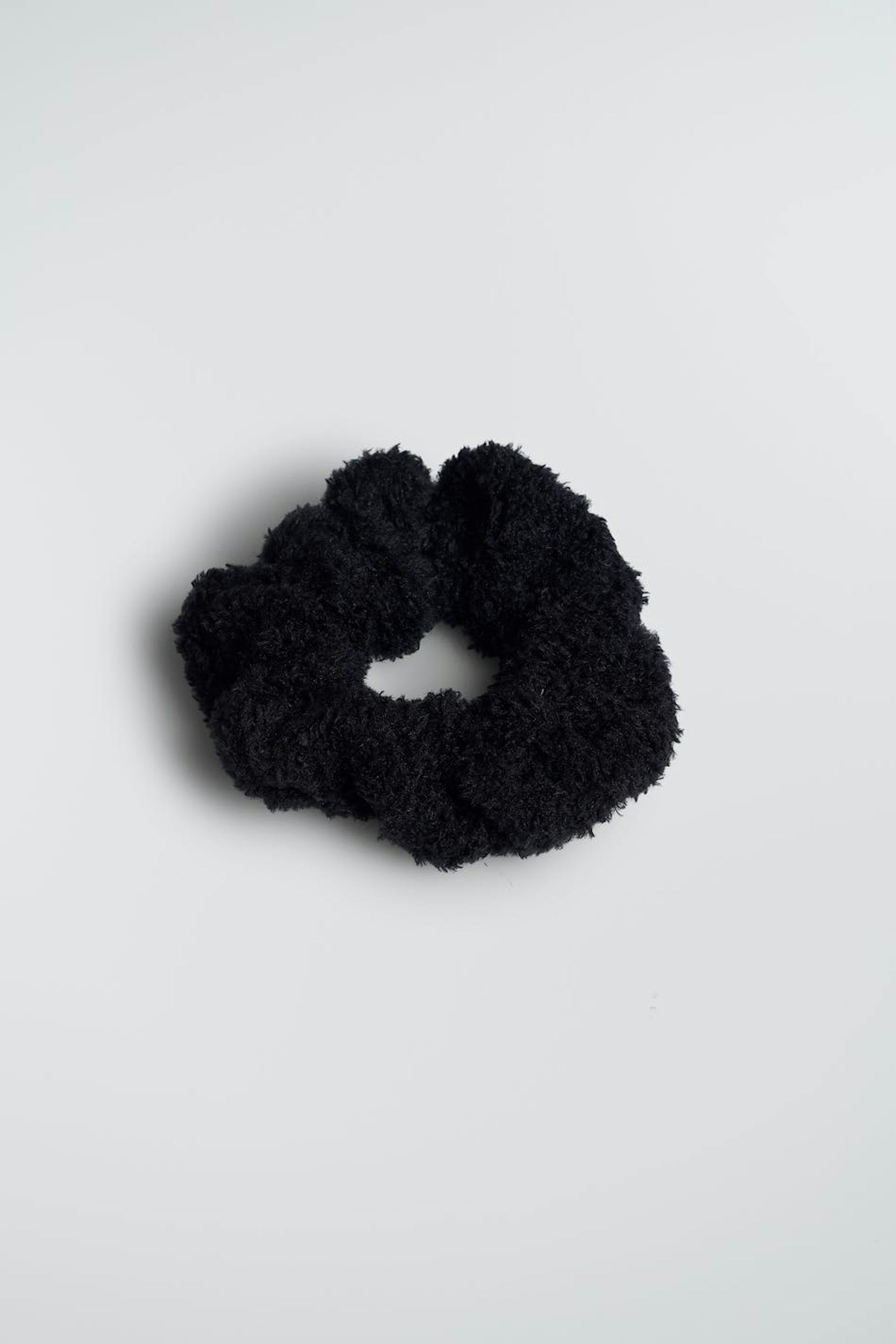 Scrunchie med et teddymateriale. Håraccessoryen er sort.