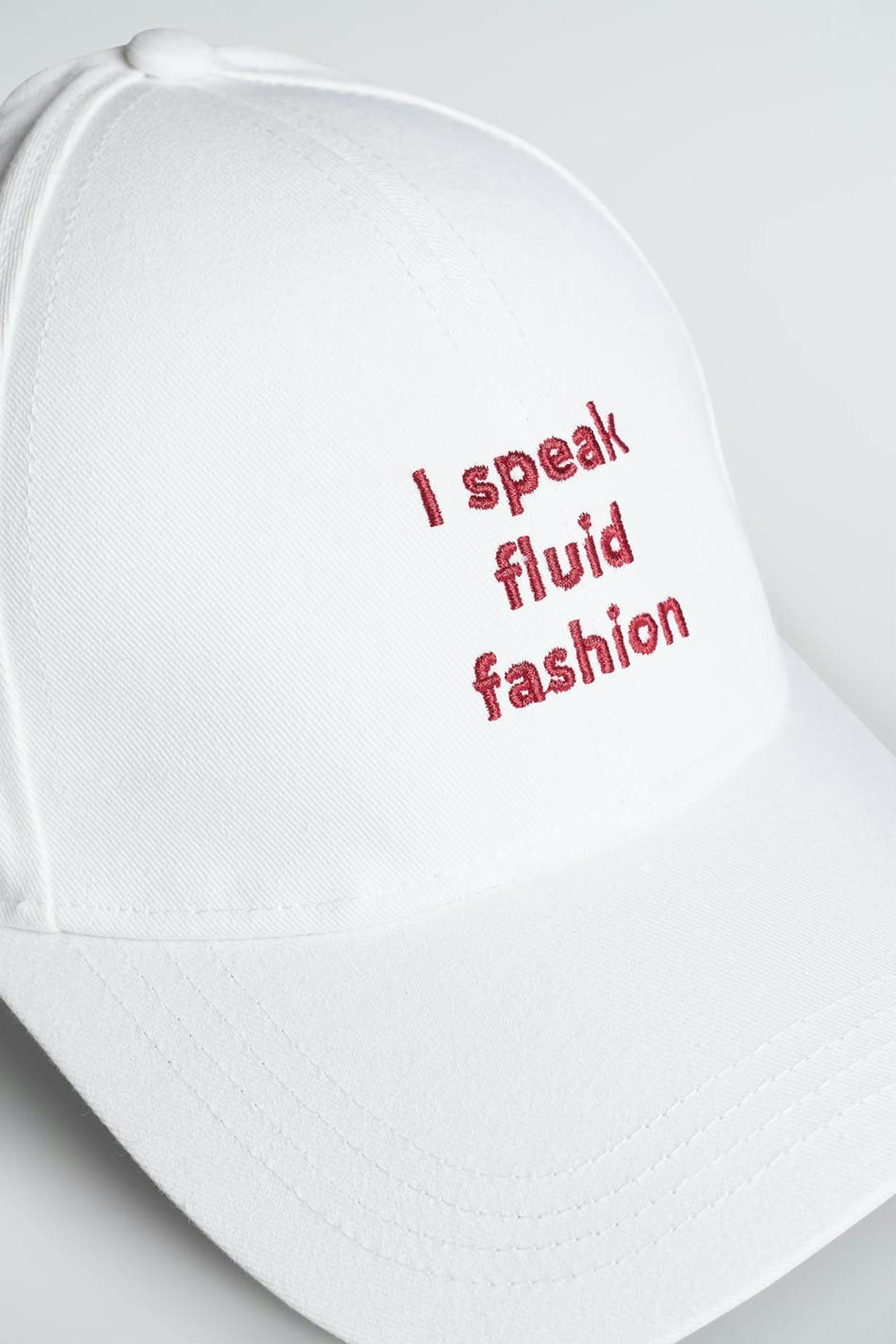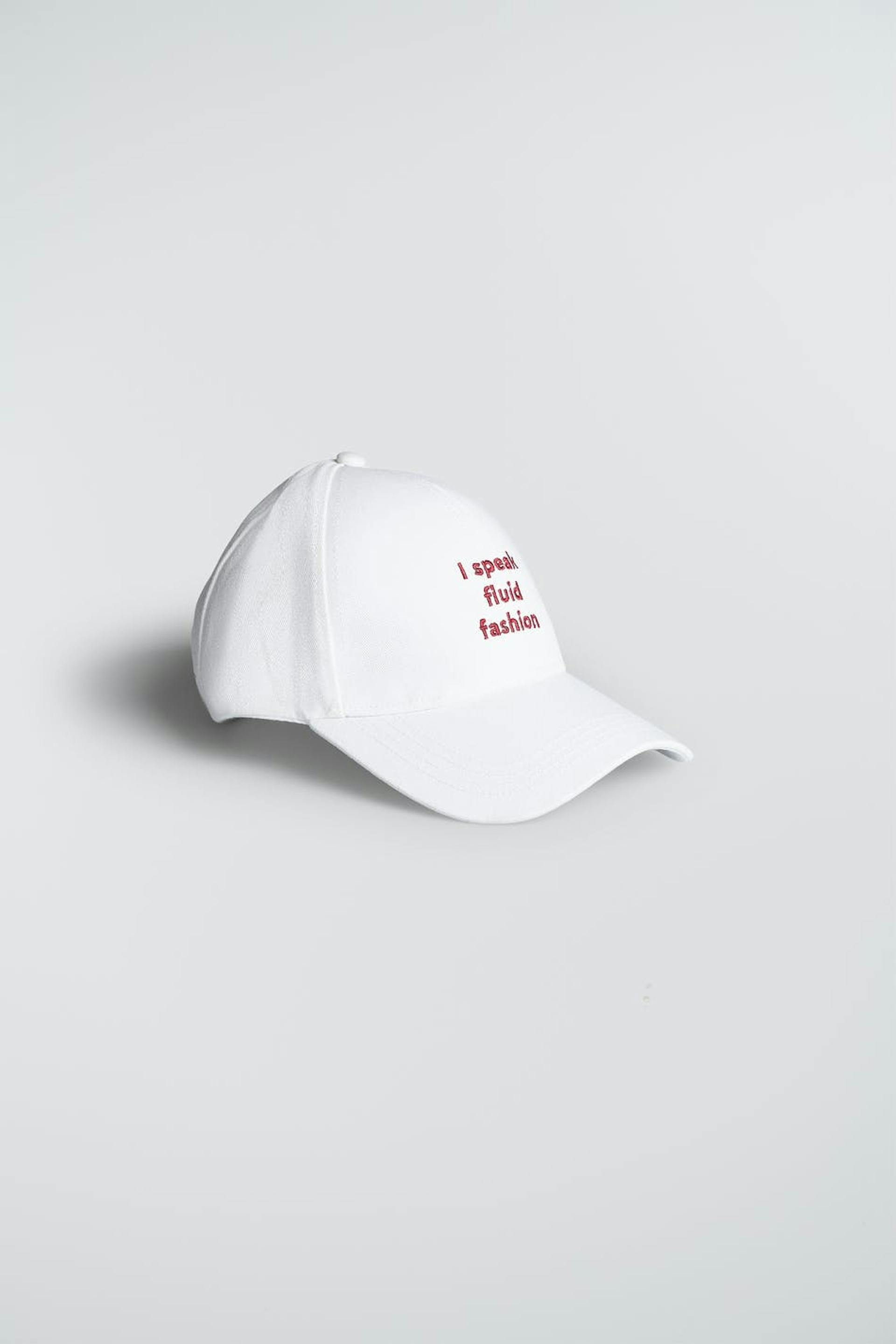 Kasket med et tryk med en rød tekst ved fronten. Kasketten er hvid og har en justerbar størrelse.