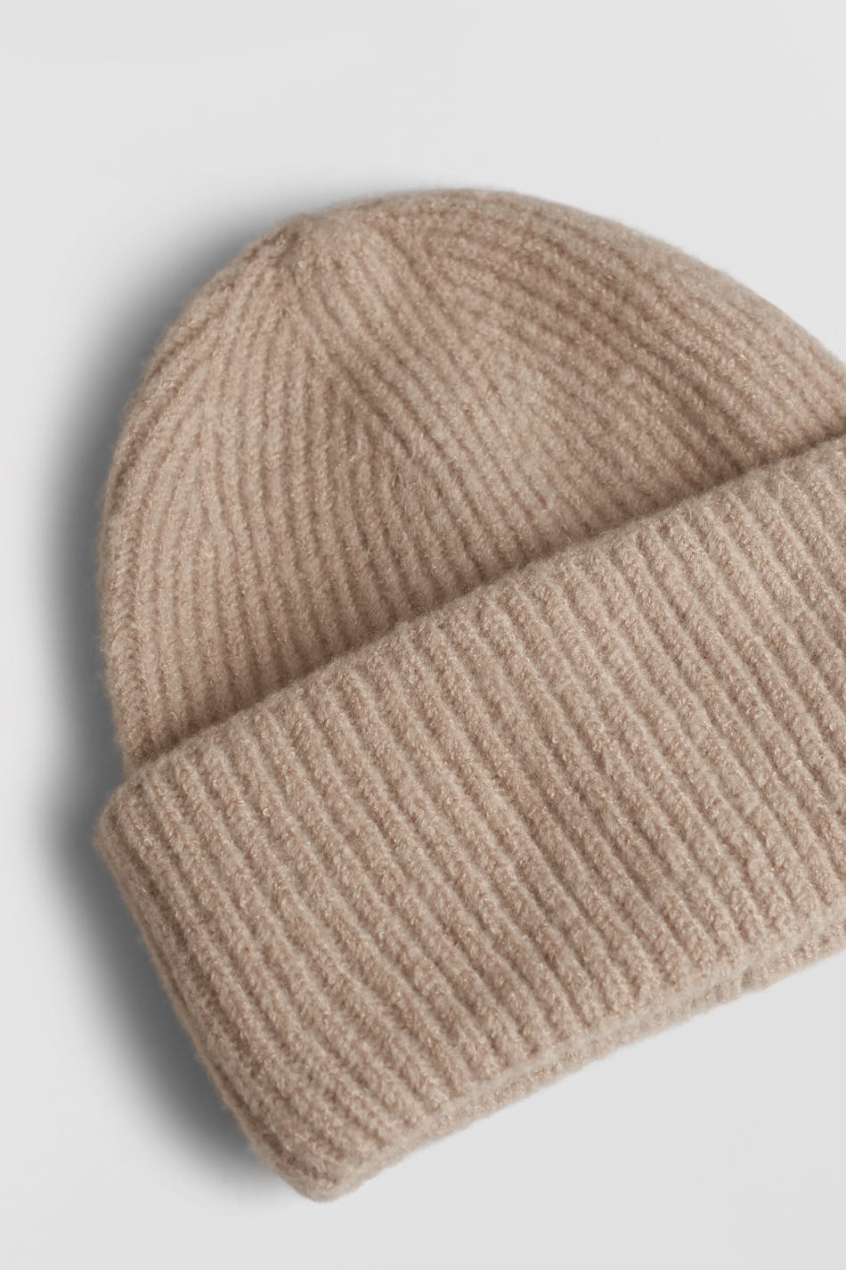 Ribstrikket hue med en foldet kant. Huen er beige.