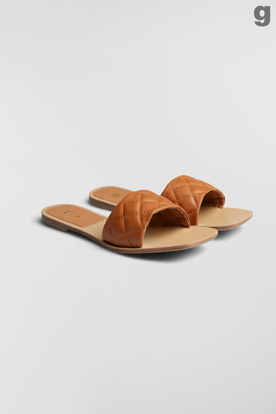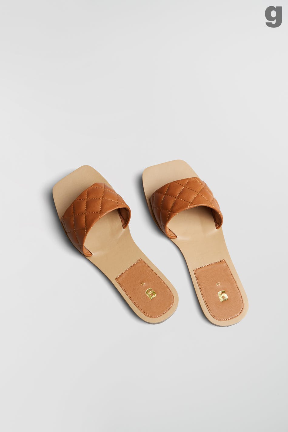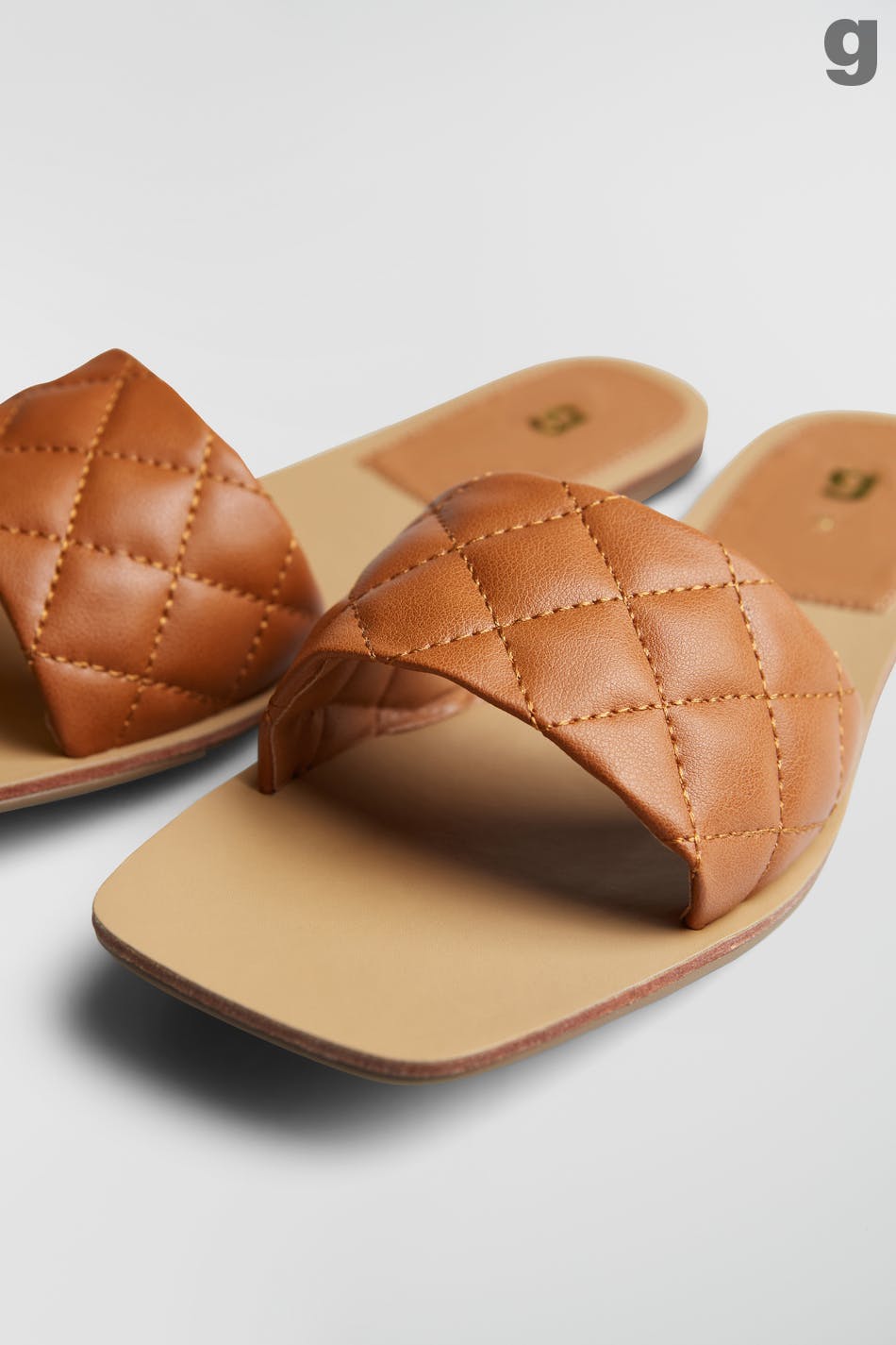 Flade sandaler med quiltet detalje i PU. Sandalerne er brune.