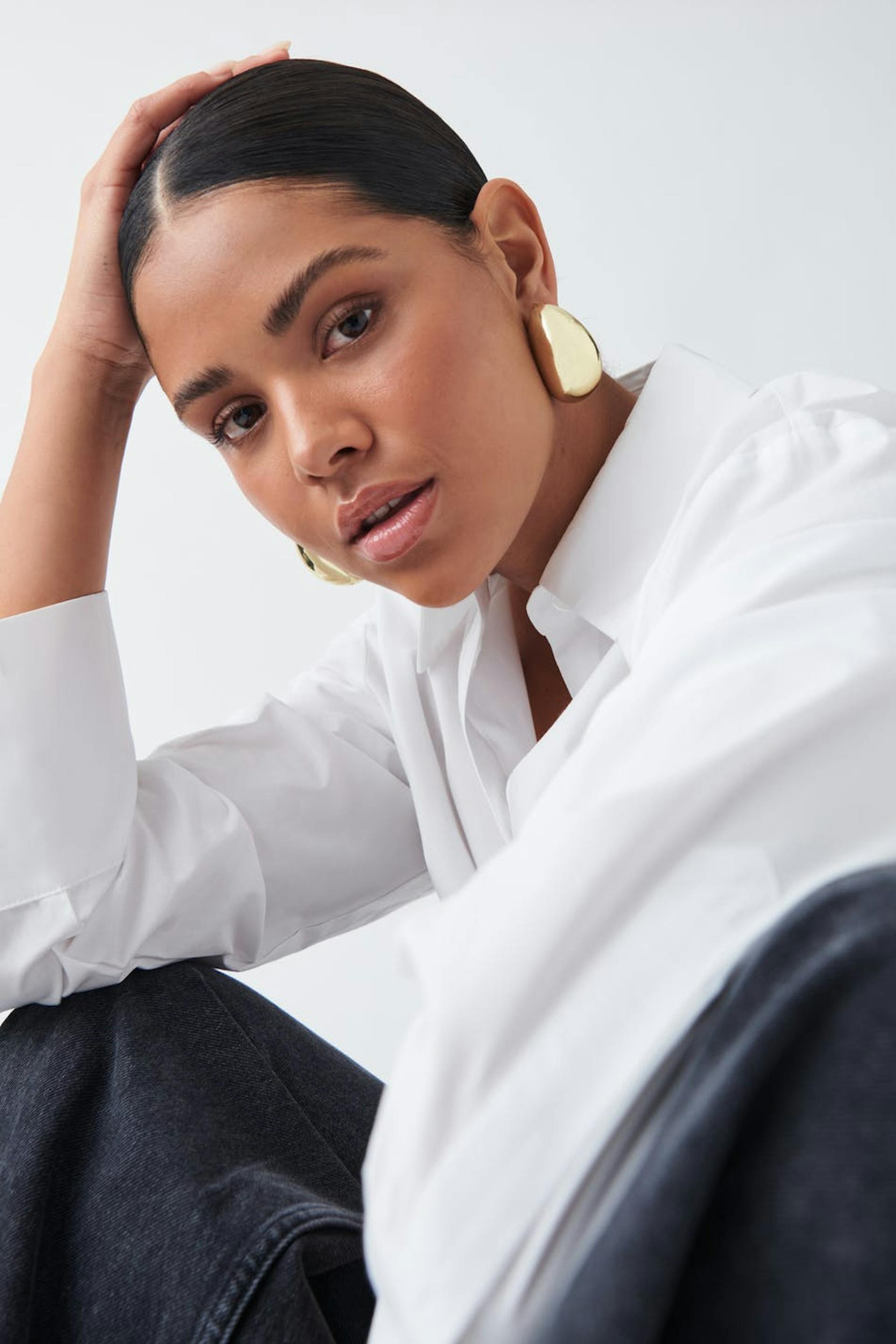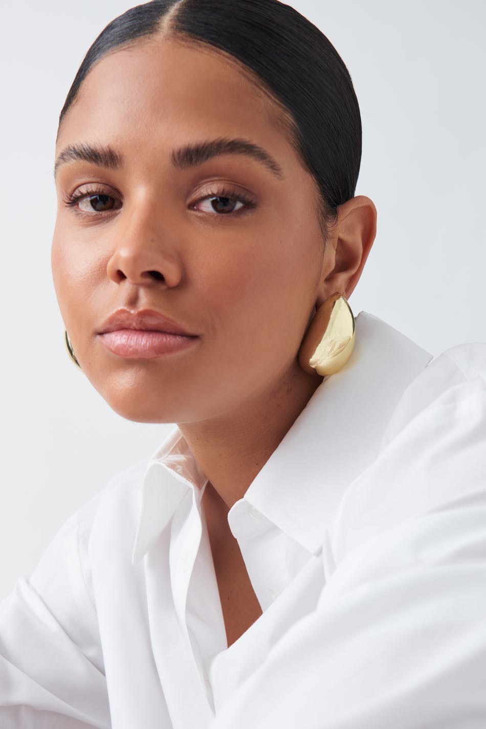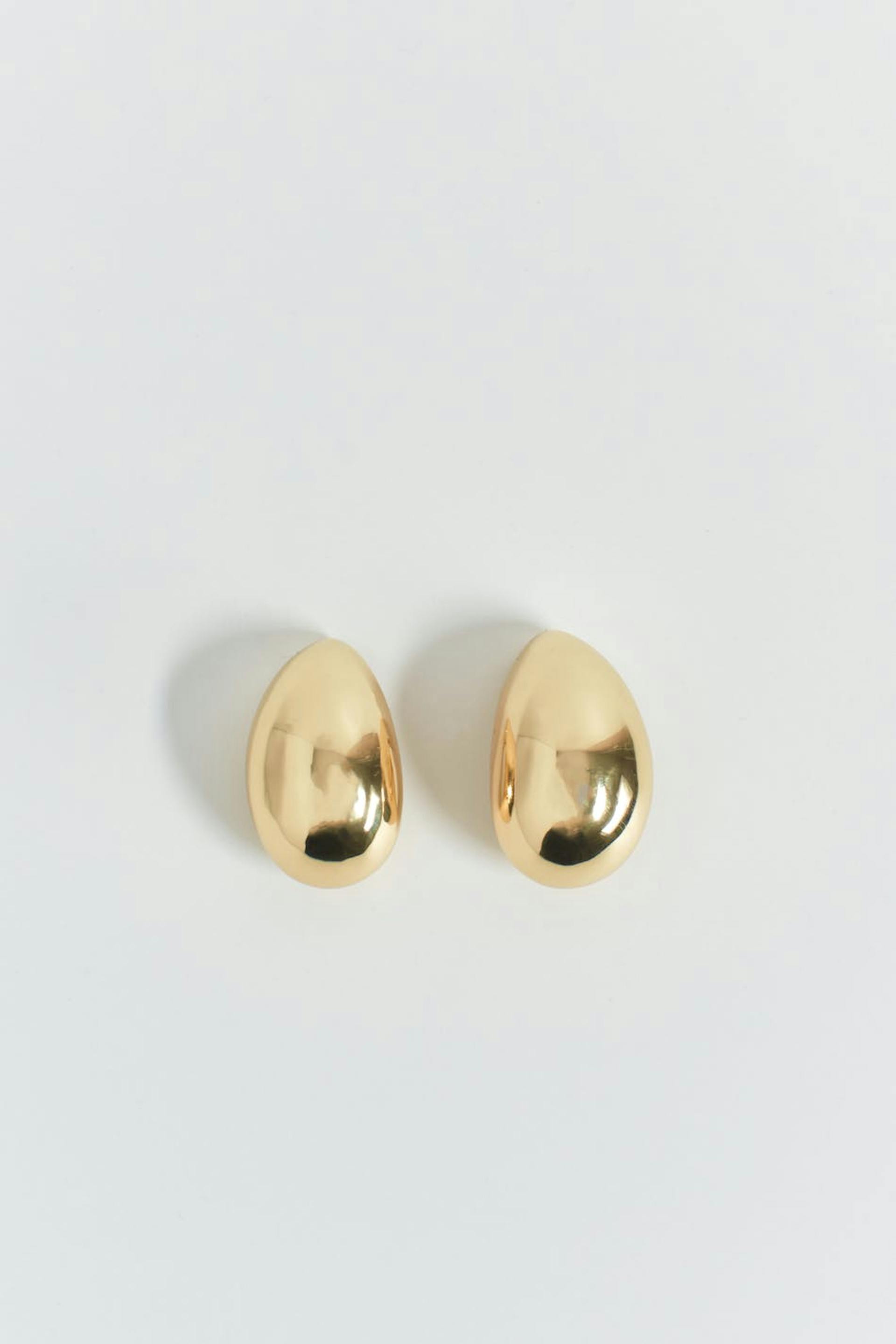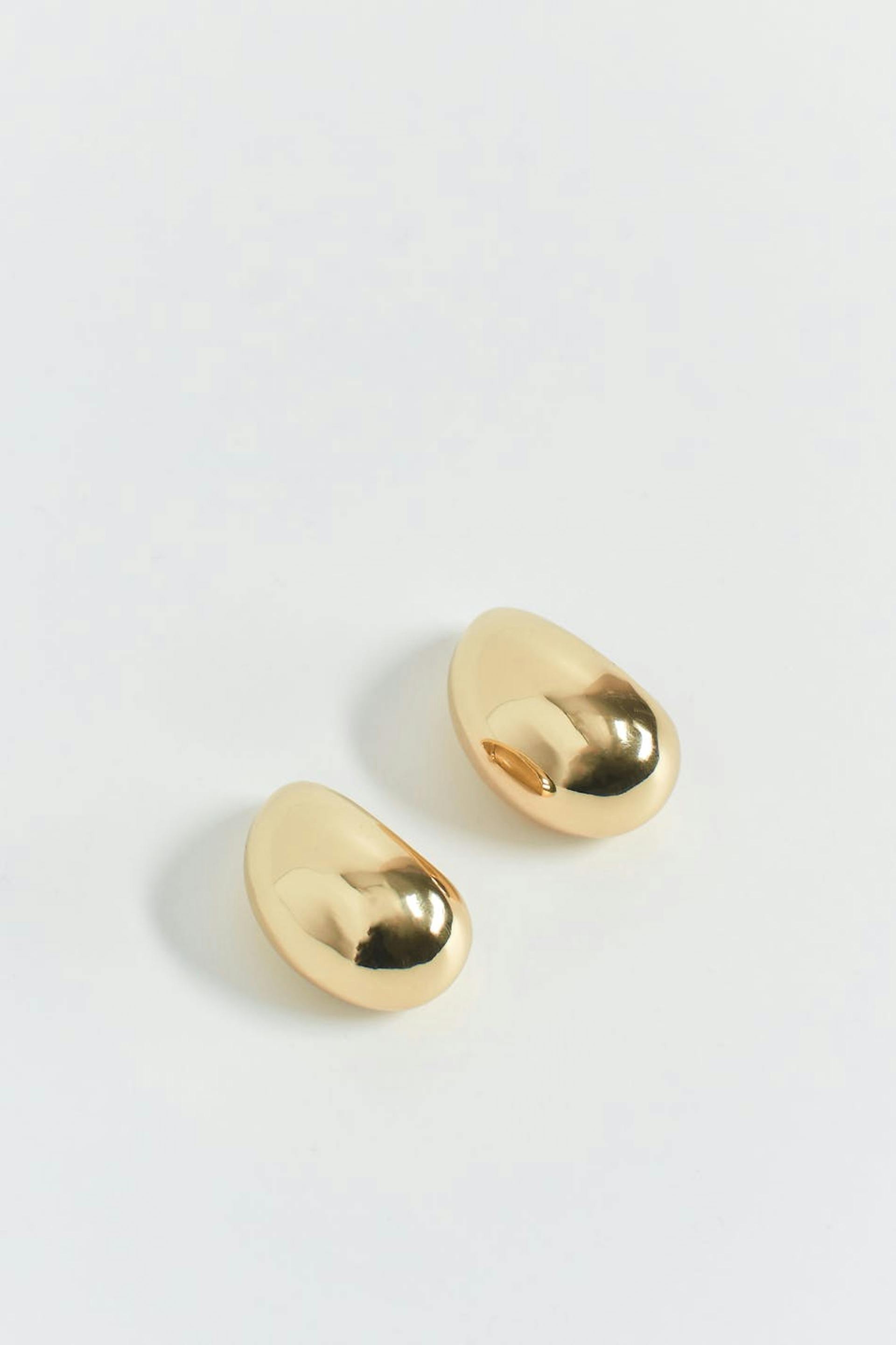 Dråbeformede øreringe med skinnende afslutning. Øreringene er gyldne.