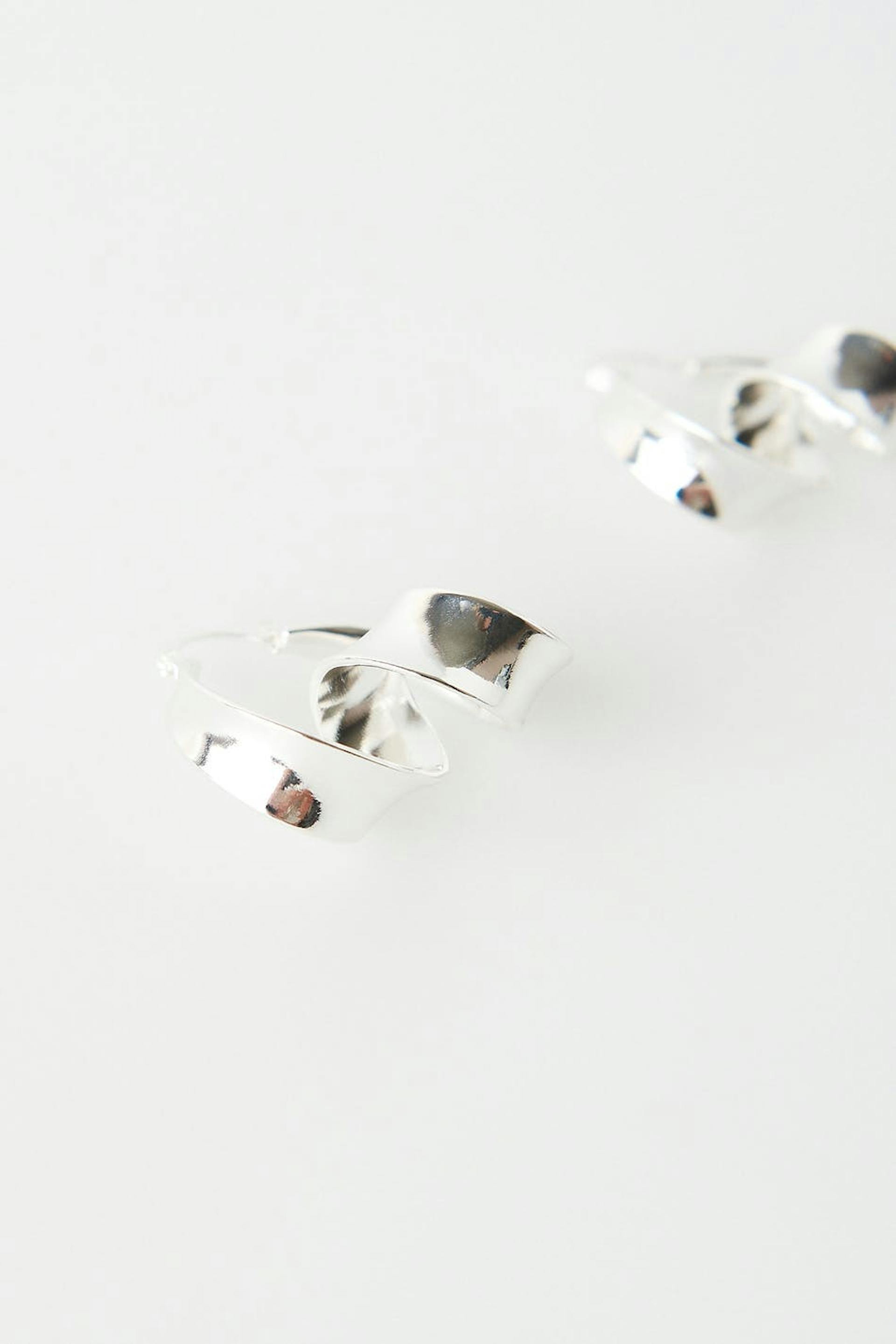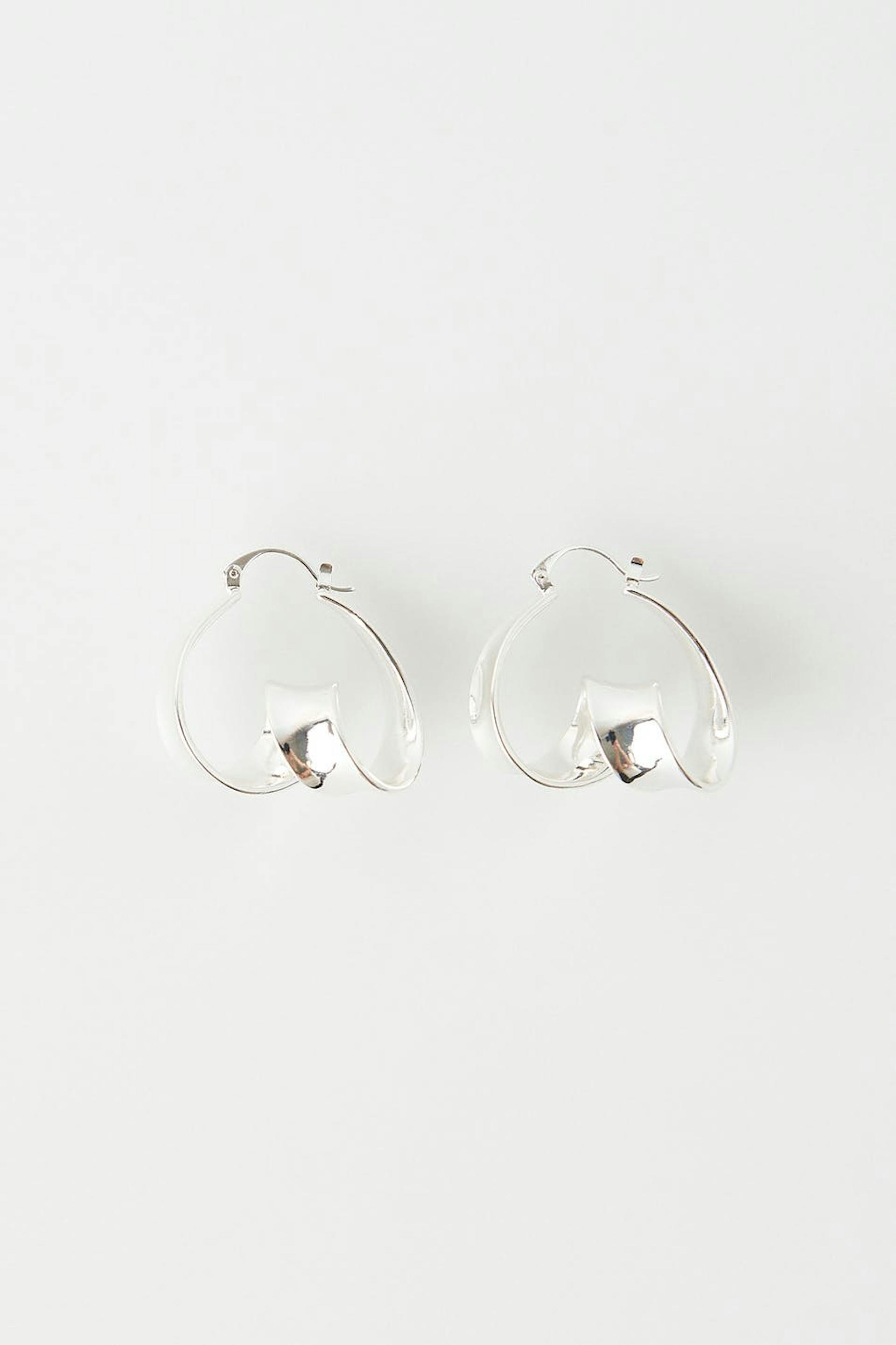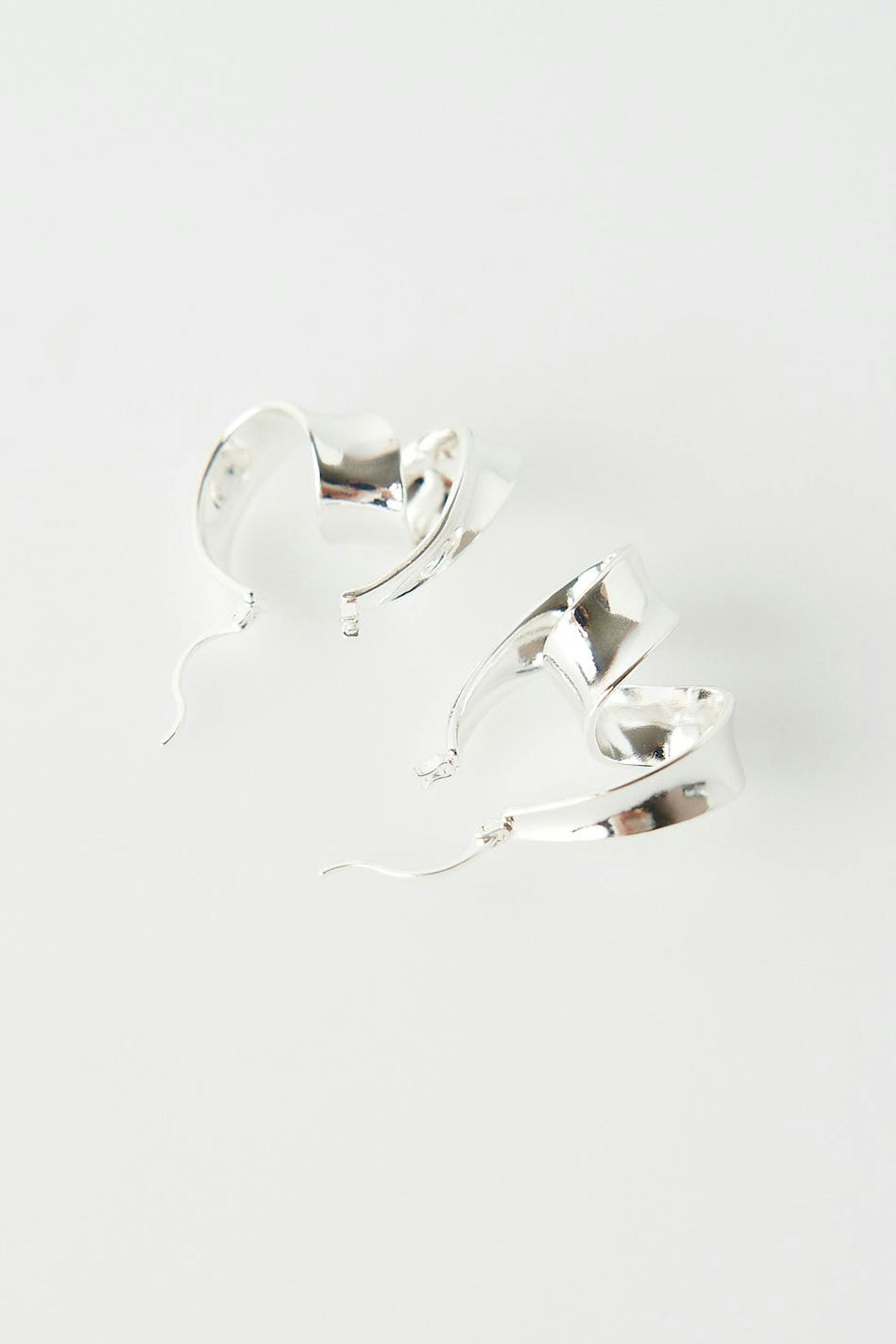 Øreringe med et snoet design. Øreringene er sølvfarvede.
