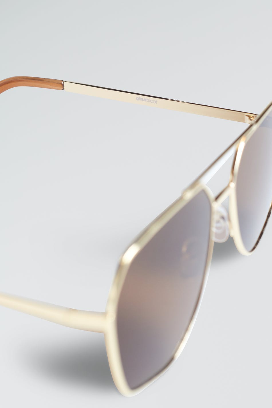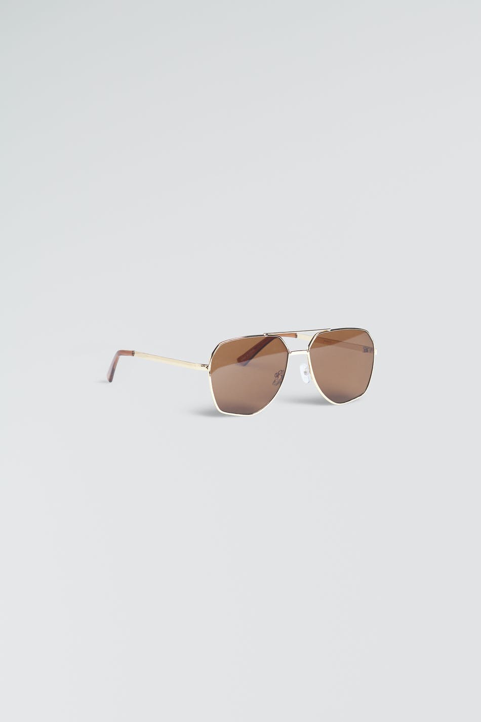 Kantede solbriller med brunt glas. Solbrillerne er gyldne.