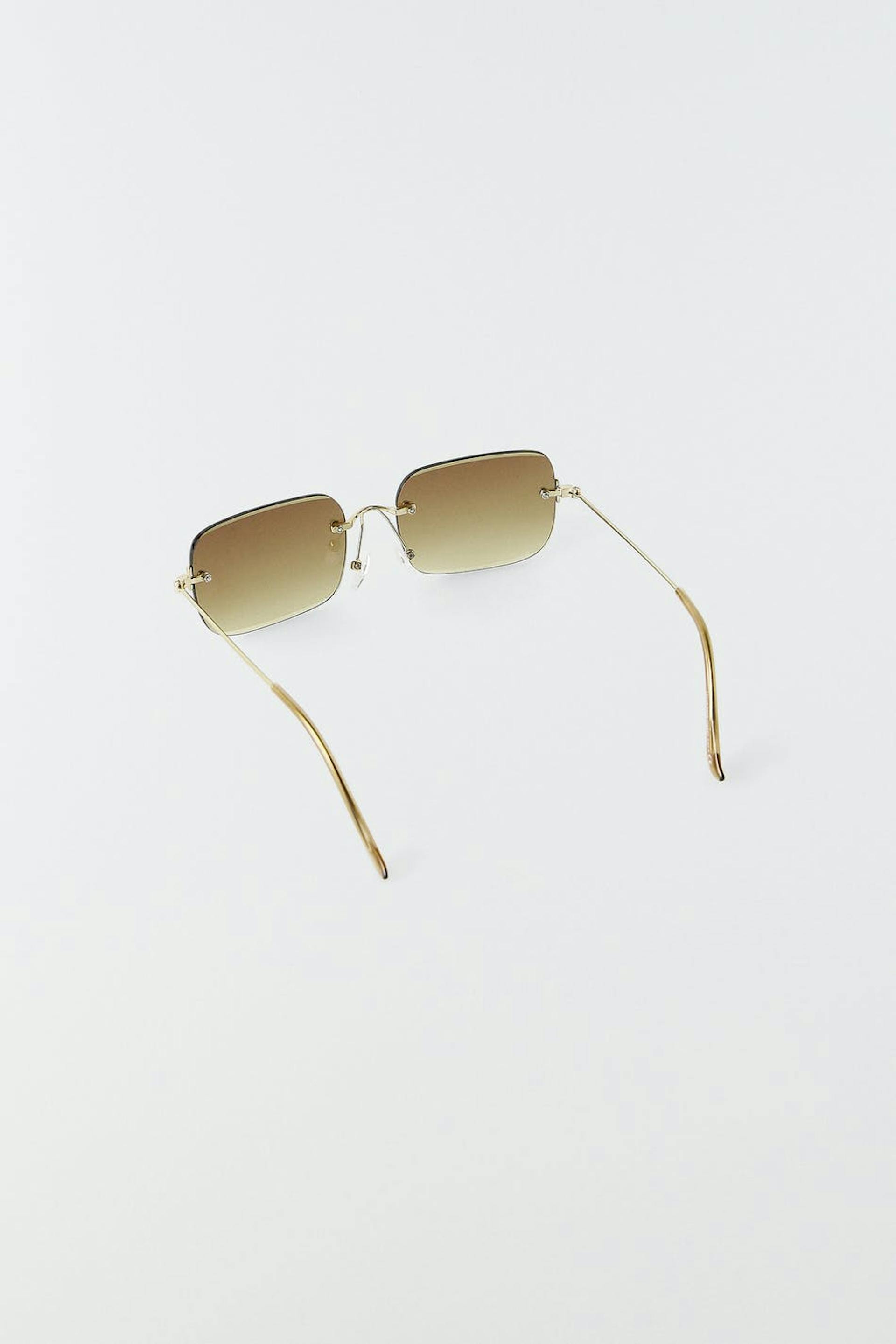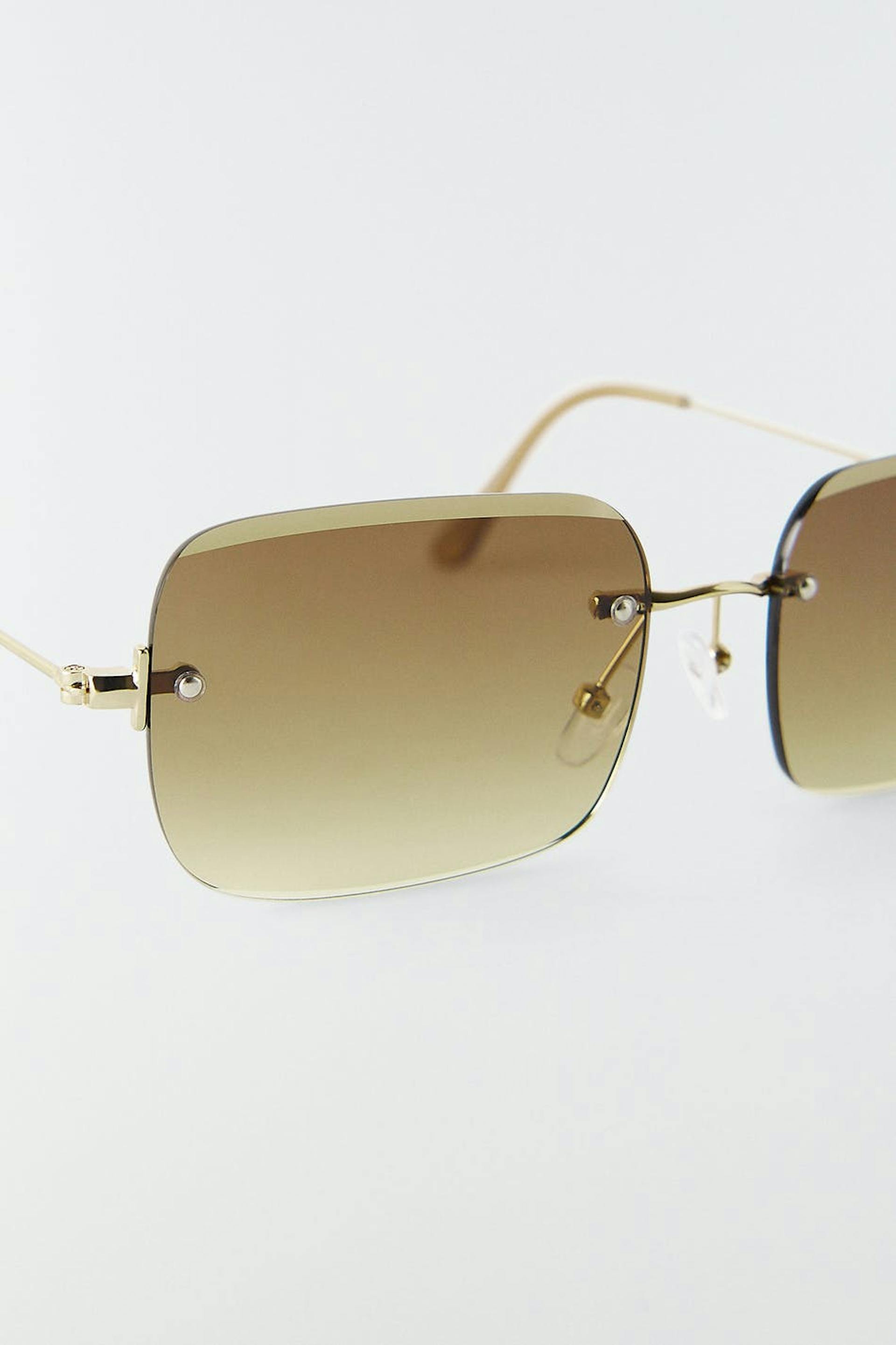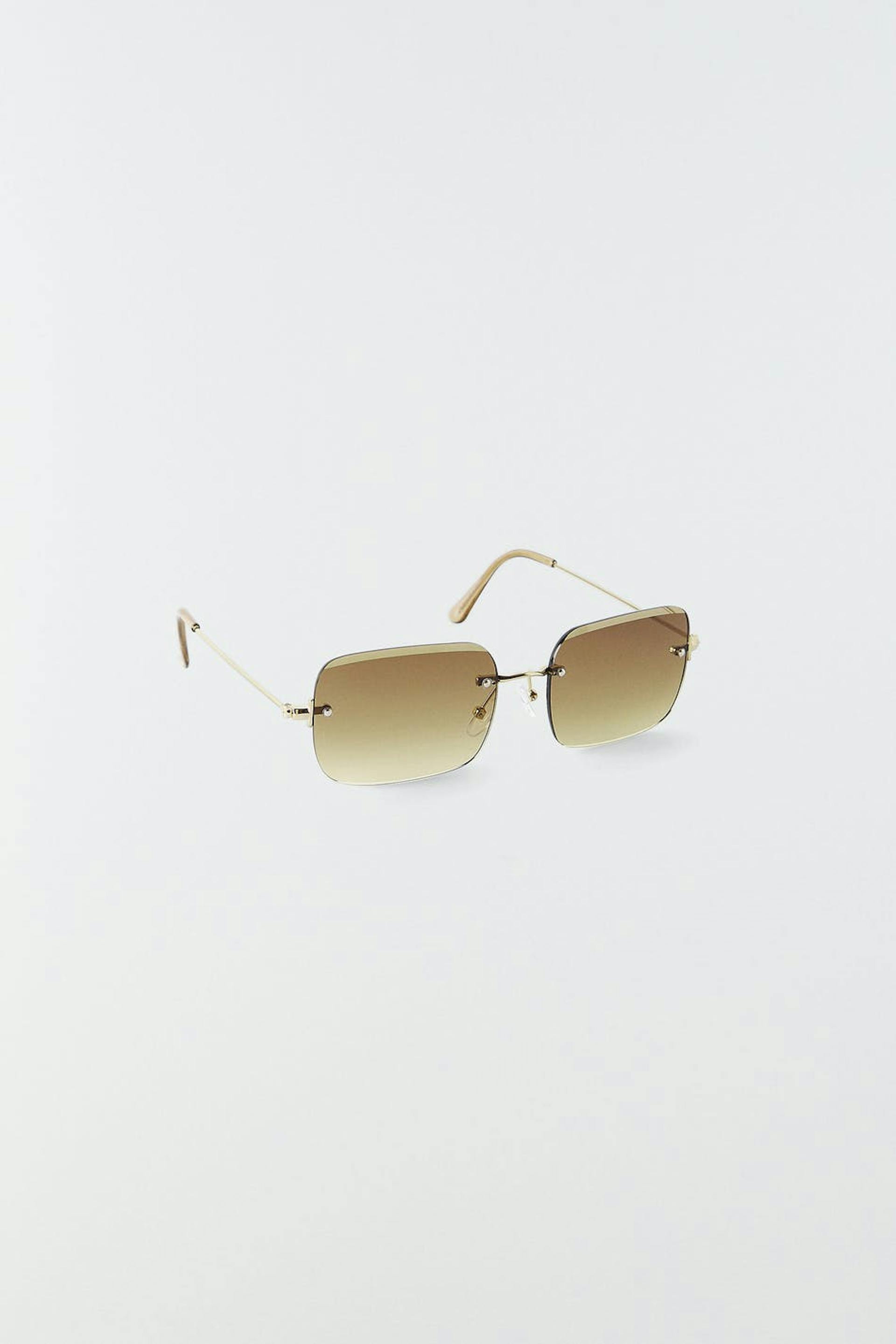 Solbriller med et guldbelagt stel i metal. Solbrillerne er brunt og har et tonet glas. Det har en firkantet form.