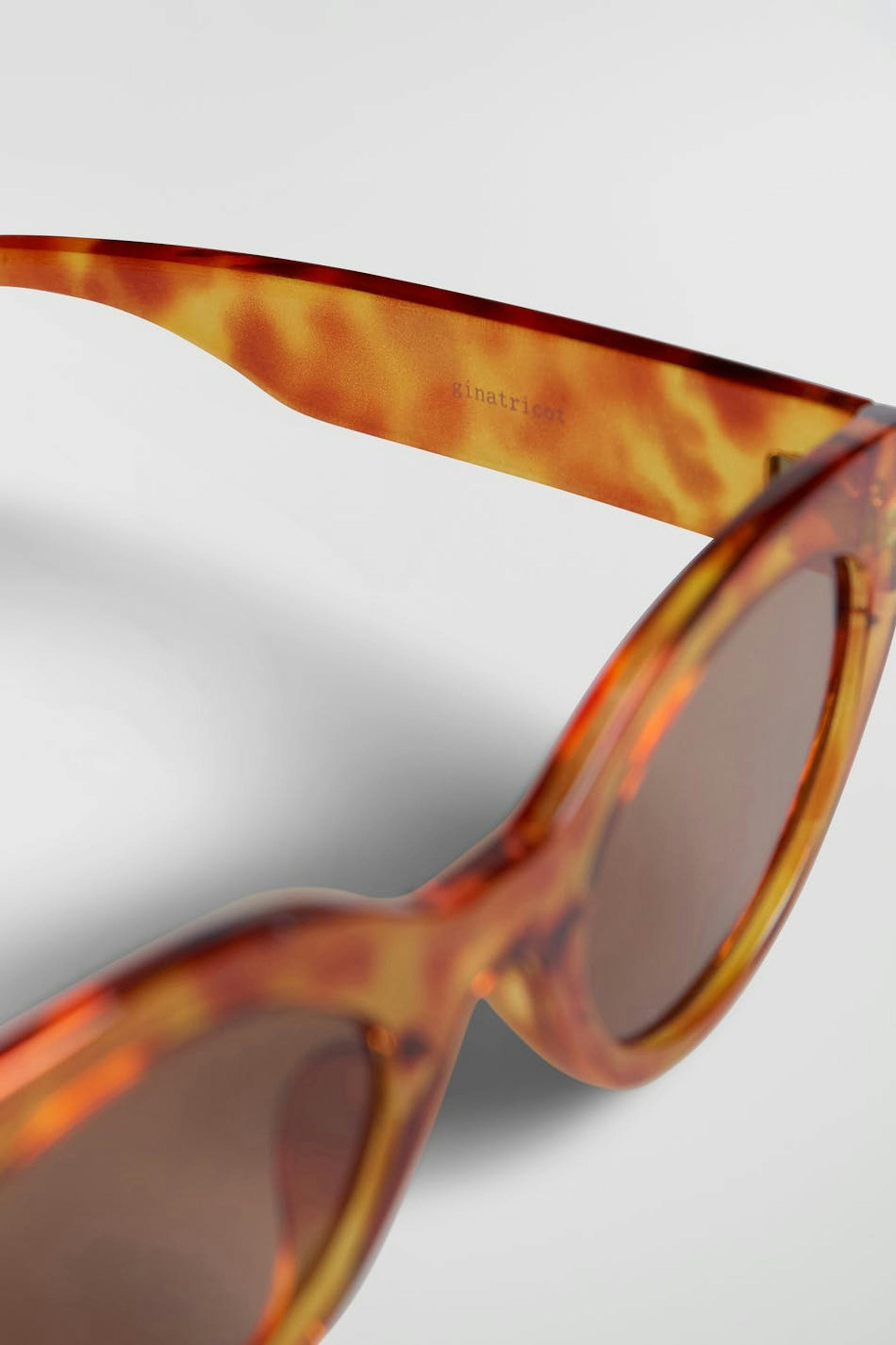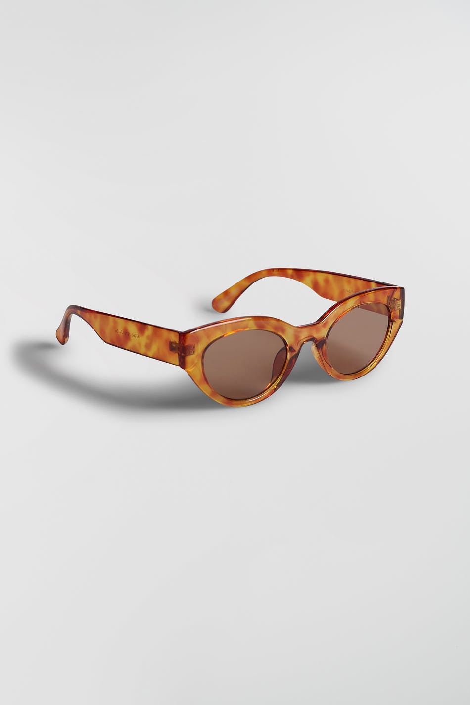 Ovale solbriller med et stel i plastik. Solbrillerne er brune.
