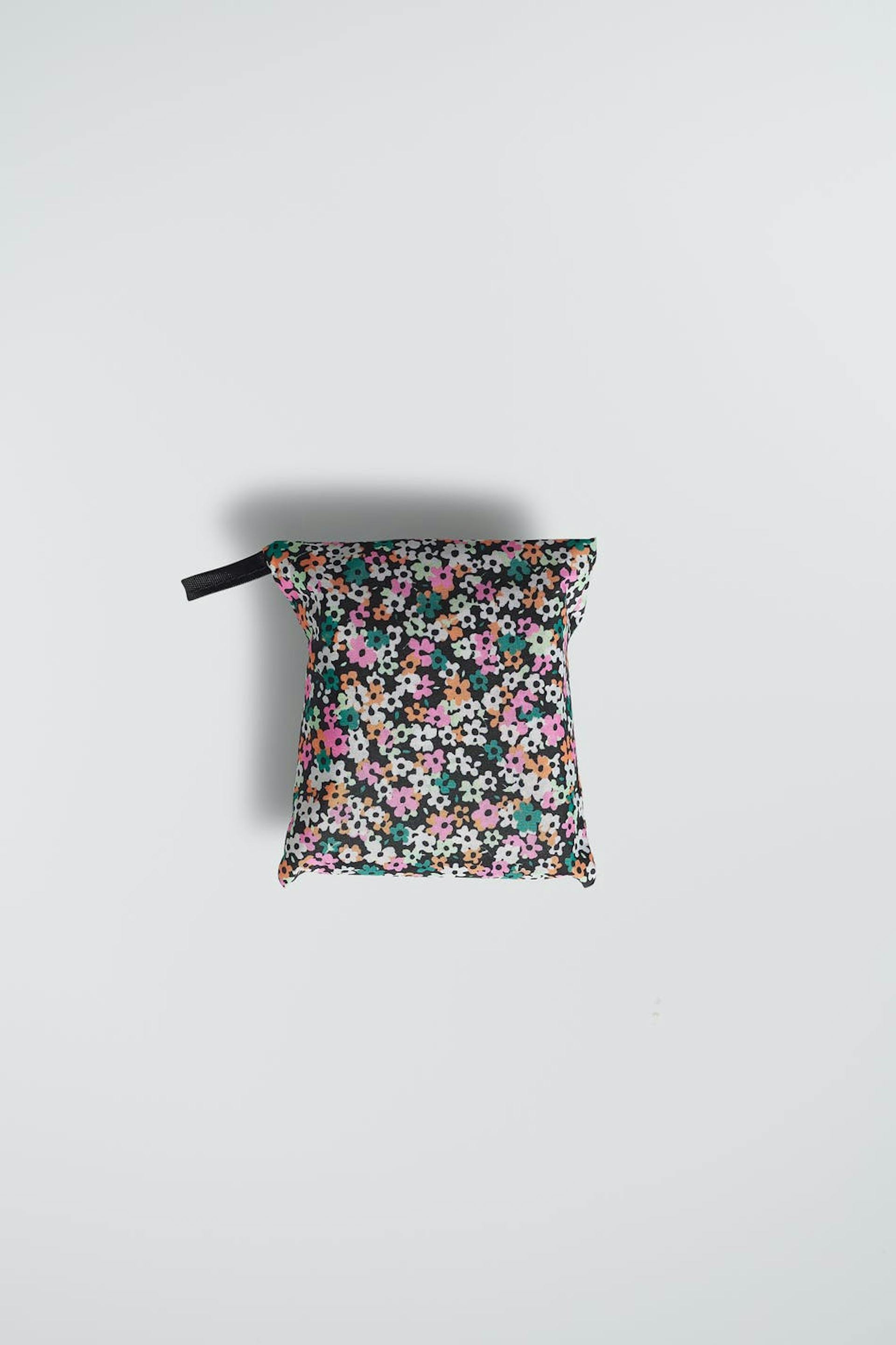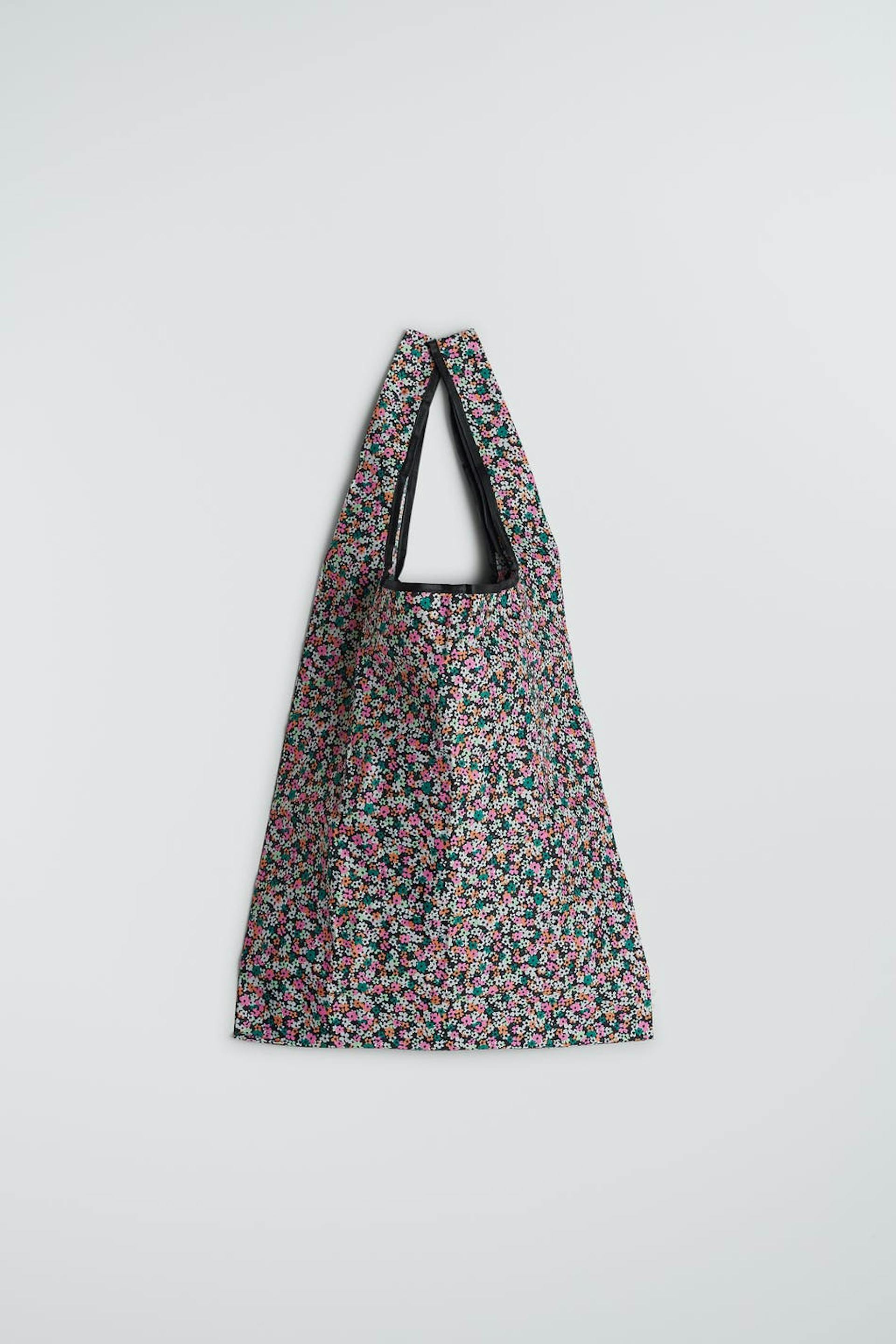 Taske med små, pink, grønne, orange blomster. Tasken er pink og har et shopper design.
