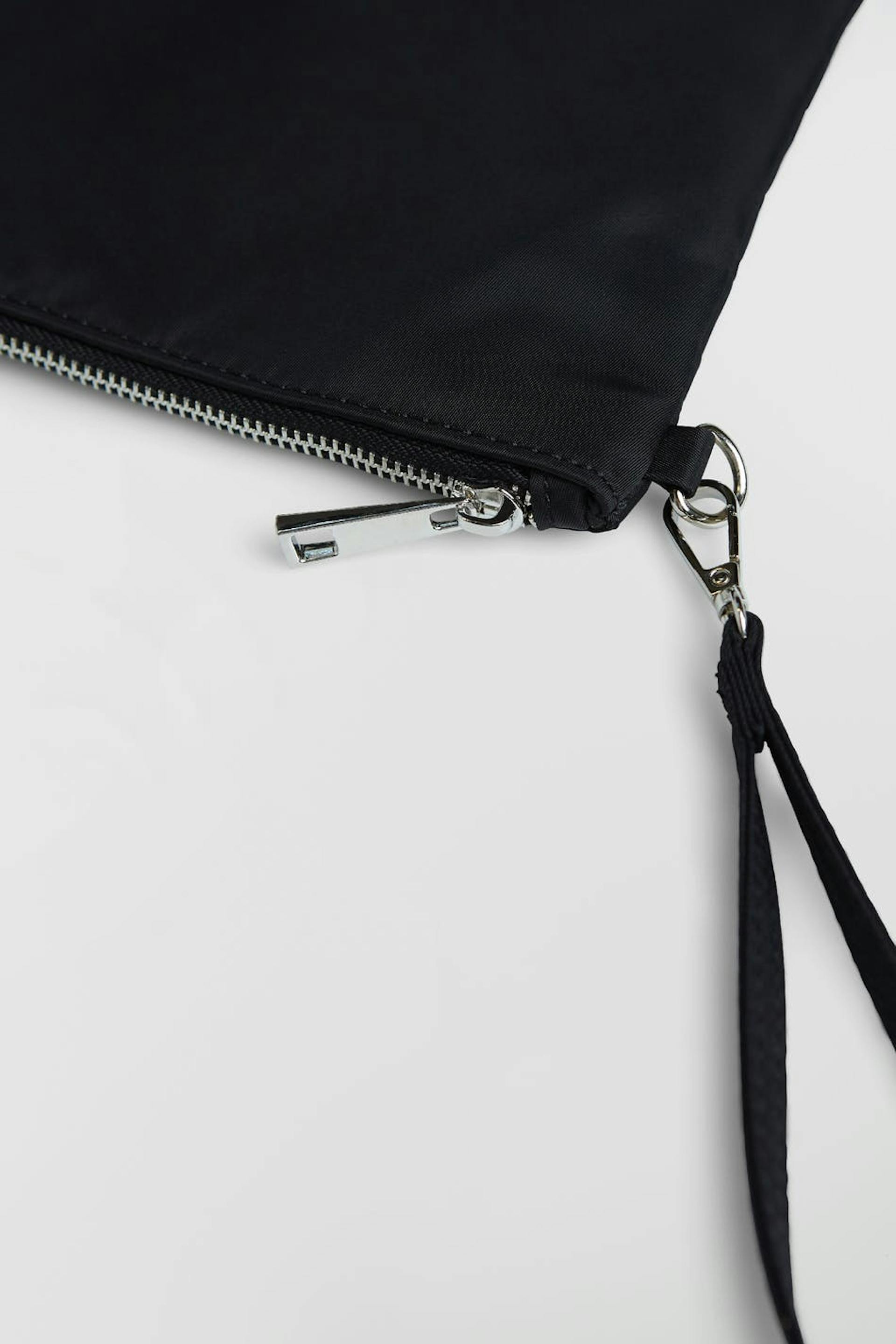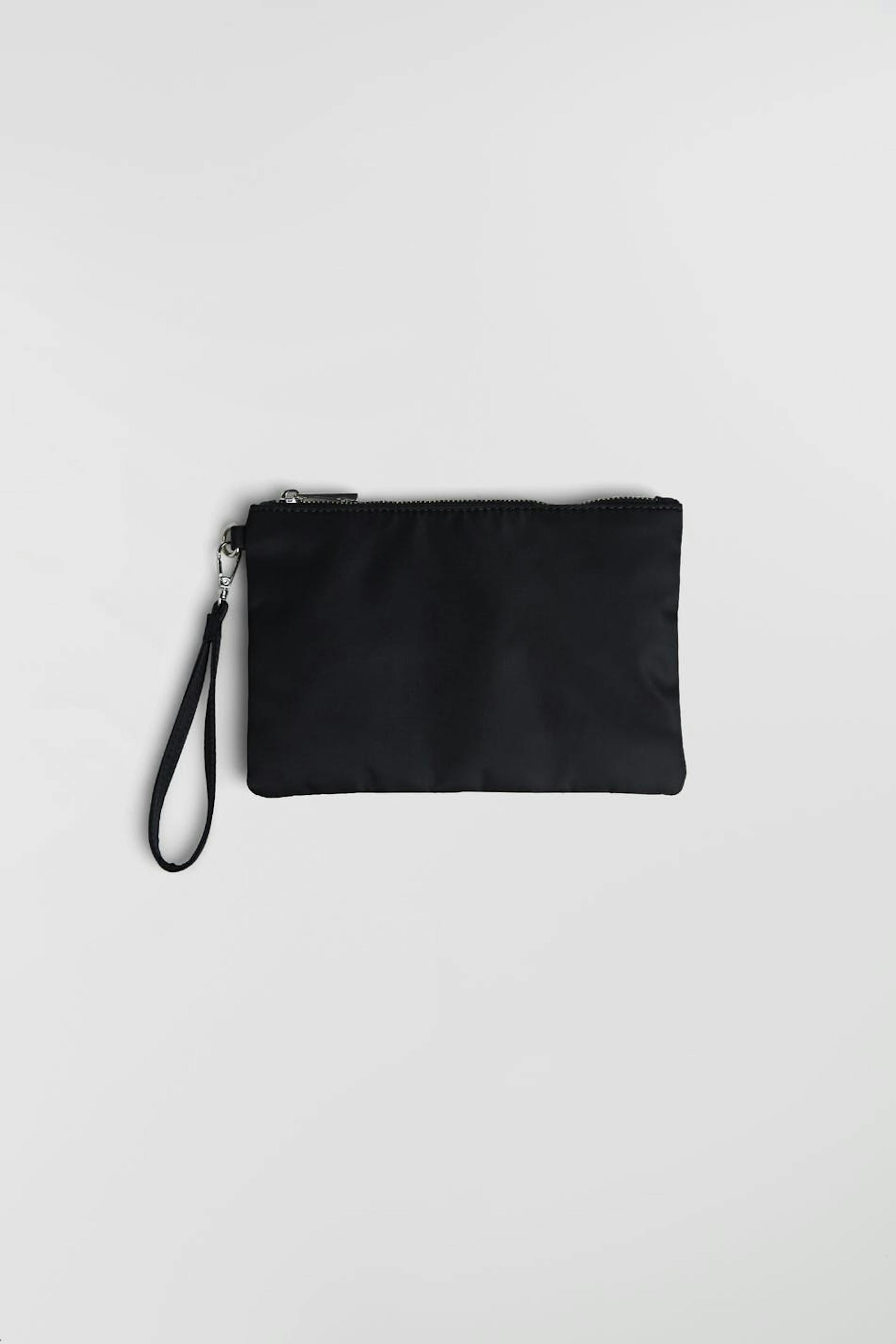 Clutch med en rem på kanten. Clutchen er sort og har en lukning med en lynlås. Den er fremstillet af nylon.