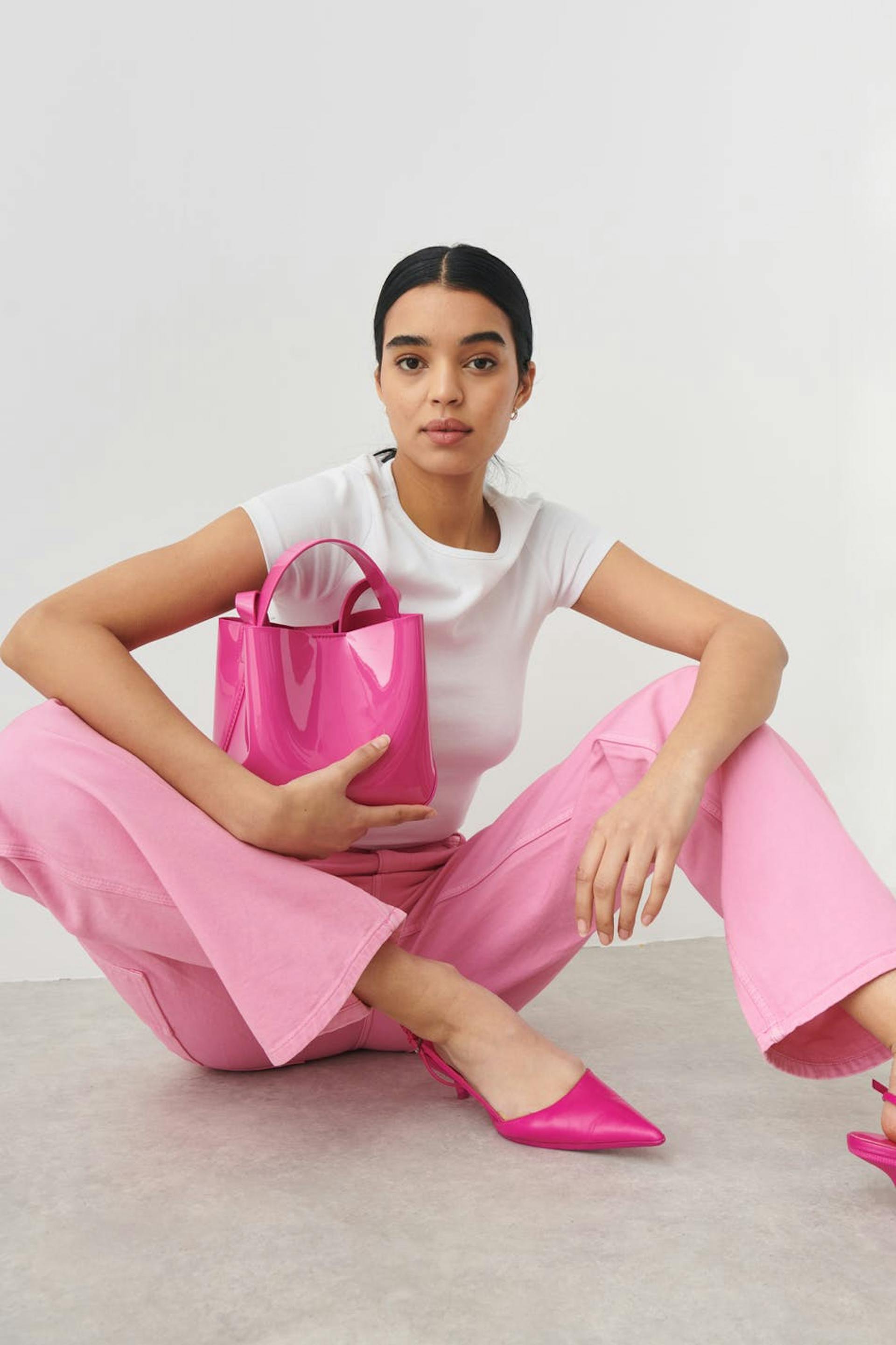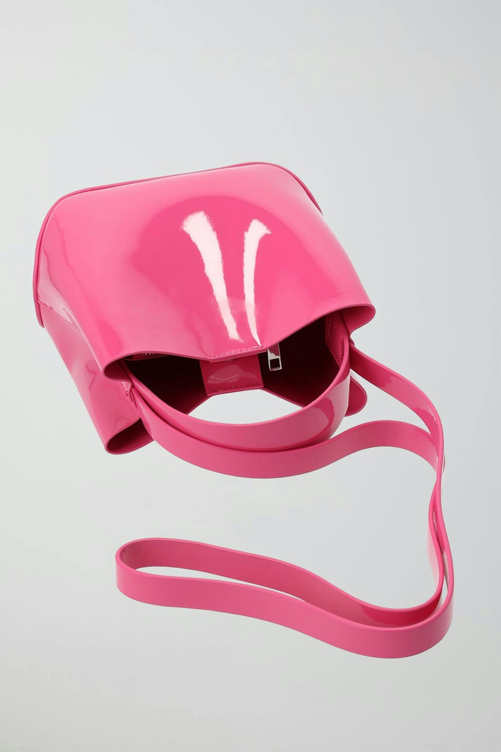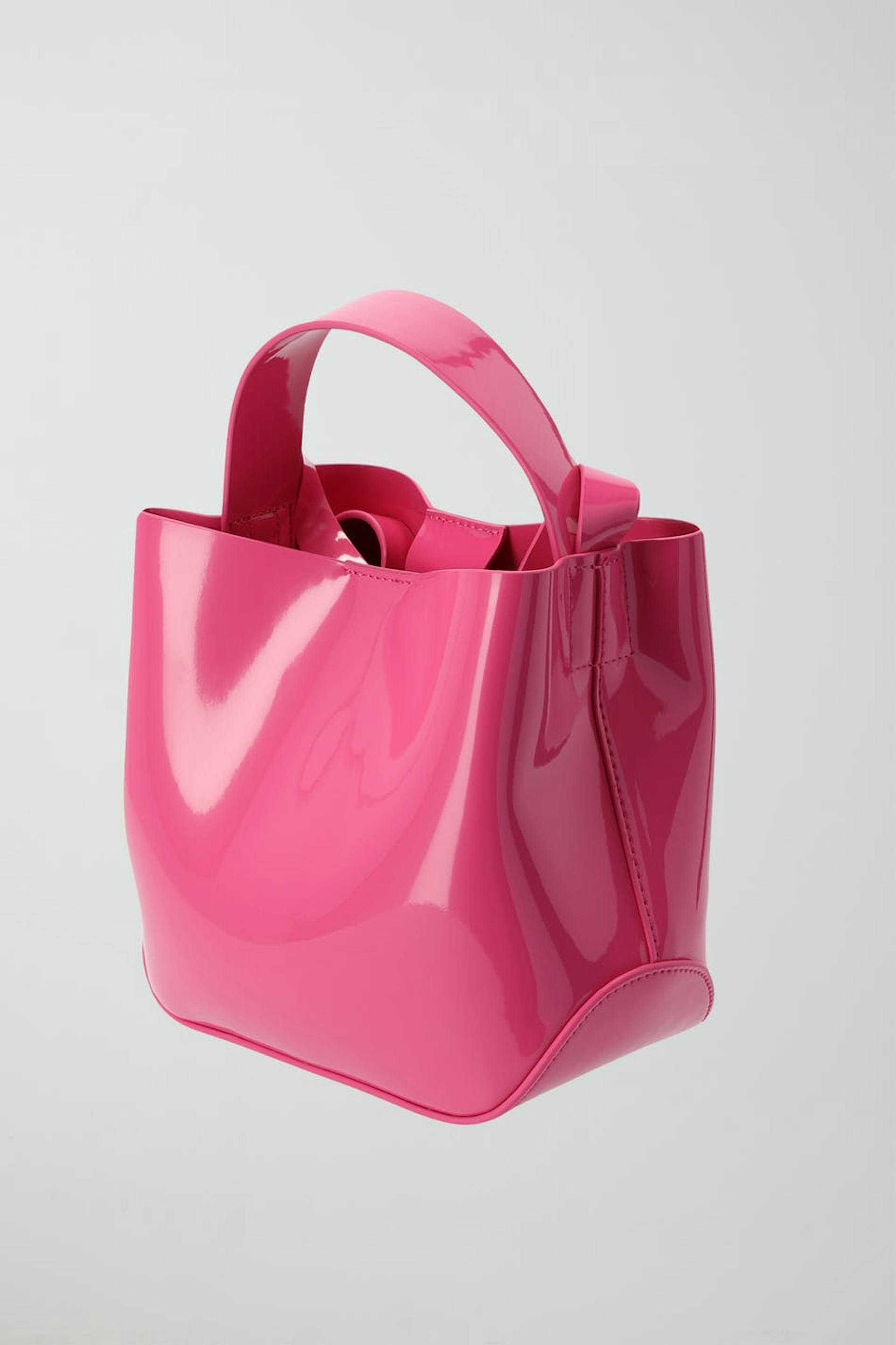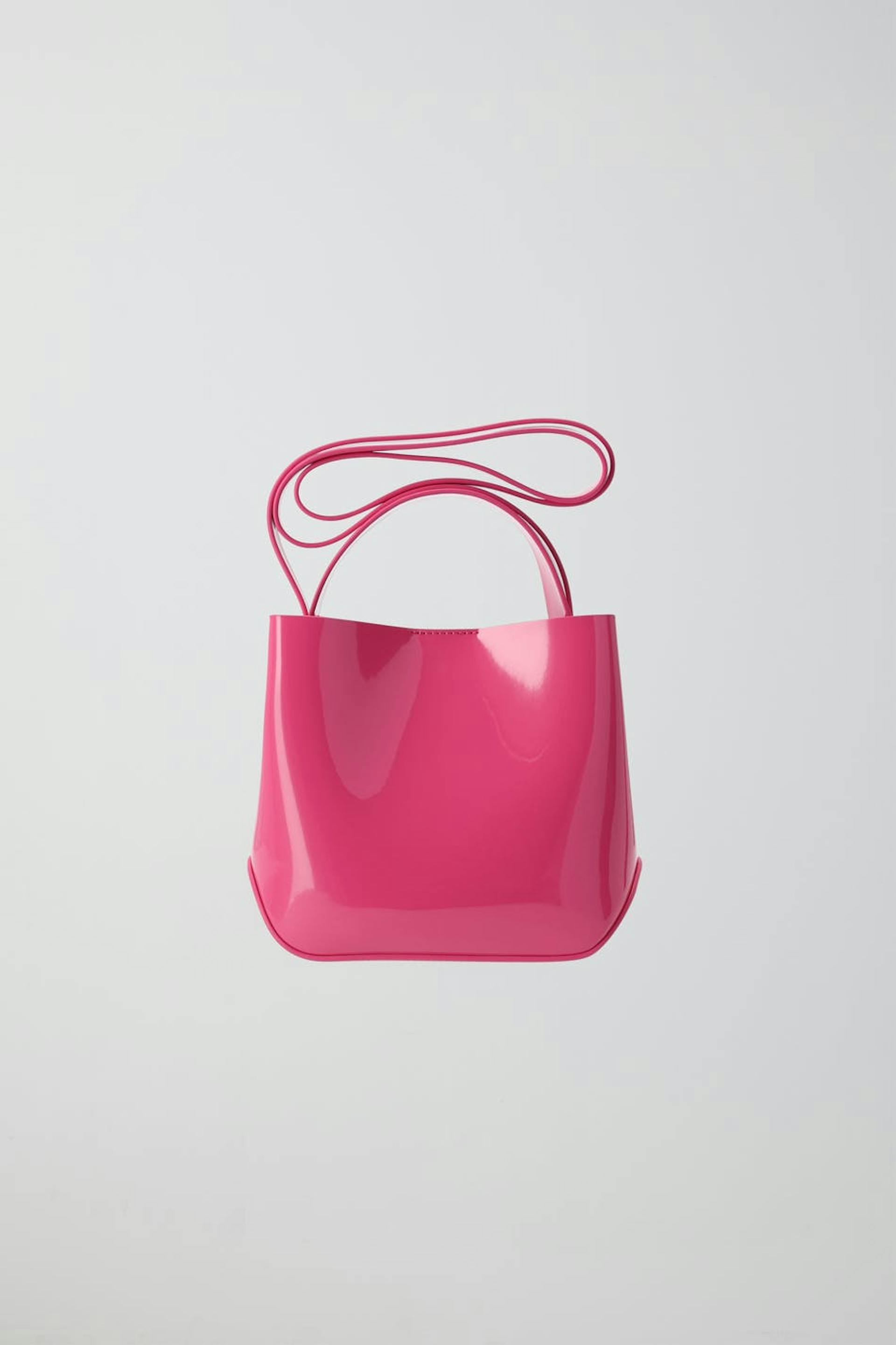 Lille taske i PU med lang skulderstrop. Tasken er pink og har lukning med magnetisk lukning. Den har et håndtag på toppen og et inderrum med lynlås.