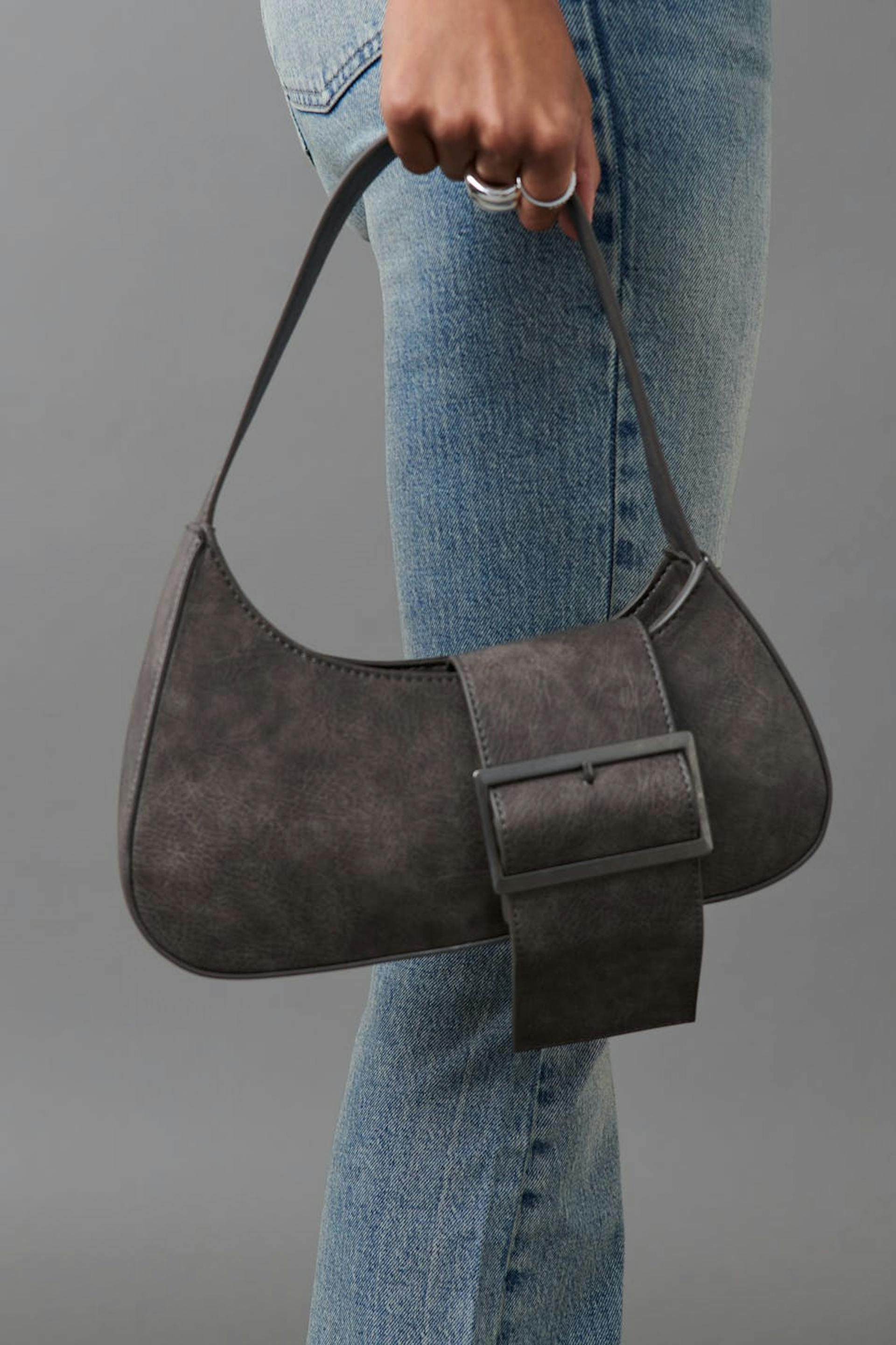 Asymmetrisk taske i vasket PU med et stort metalspænde. Tasken er grå og har lynlåslukning på toppen.