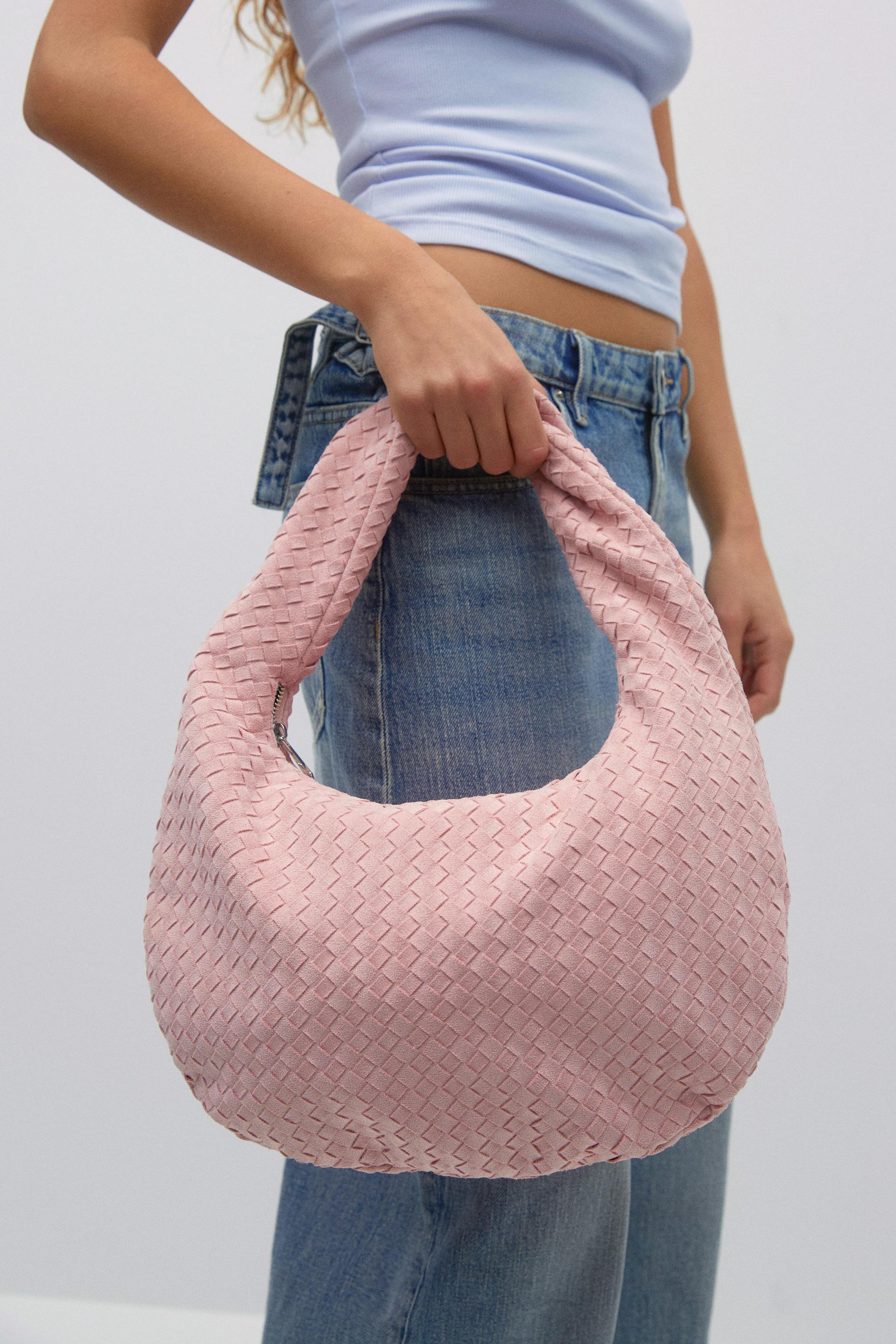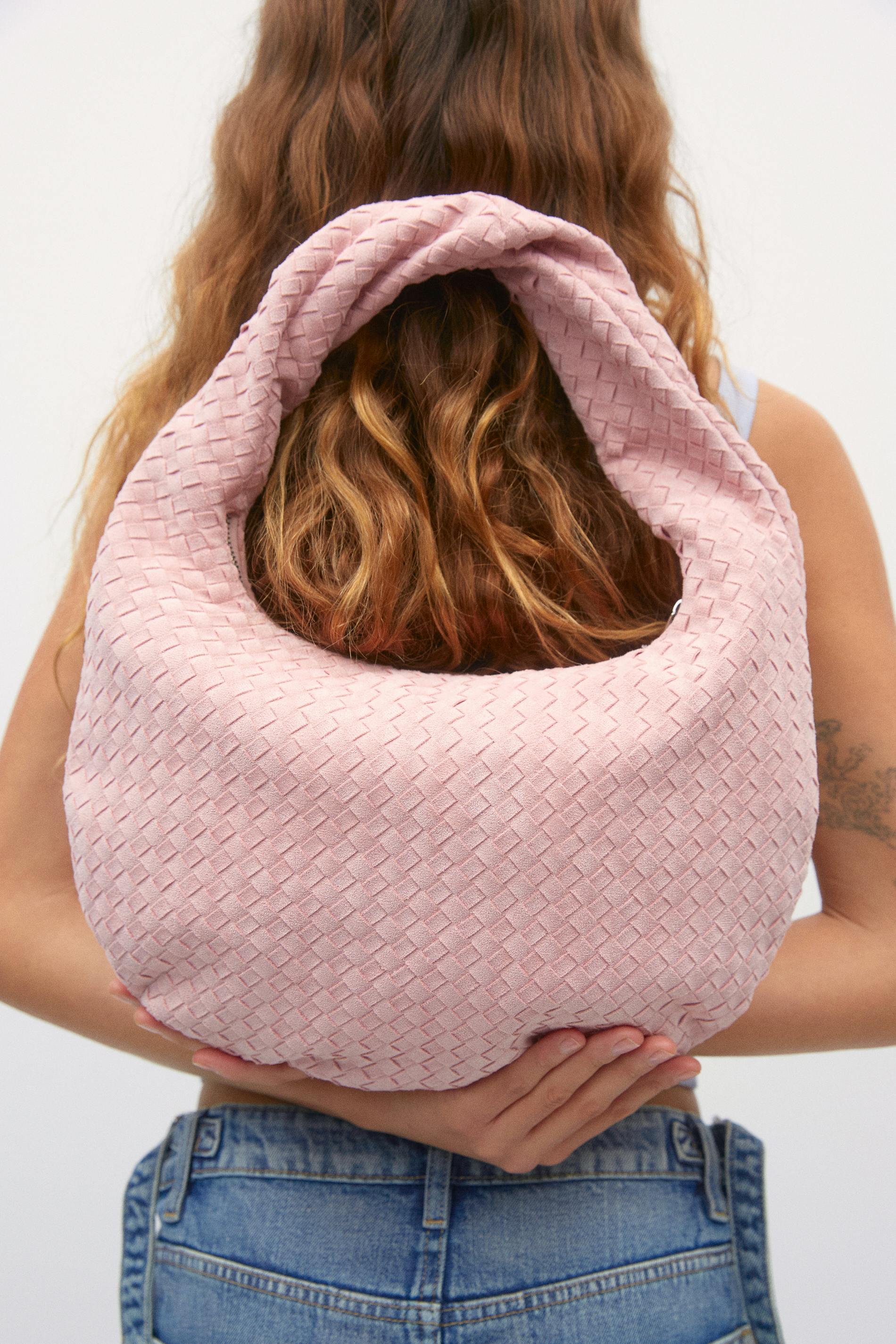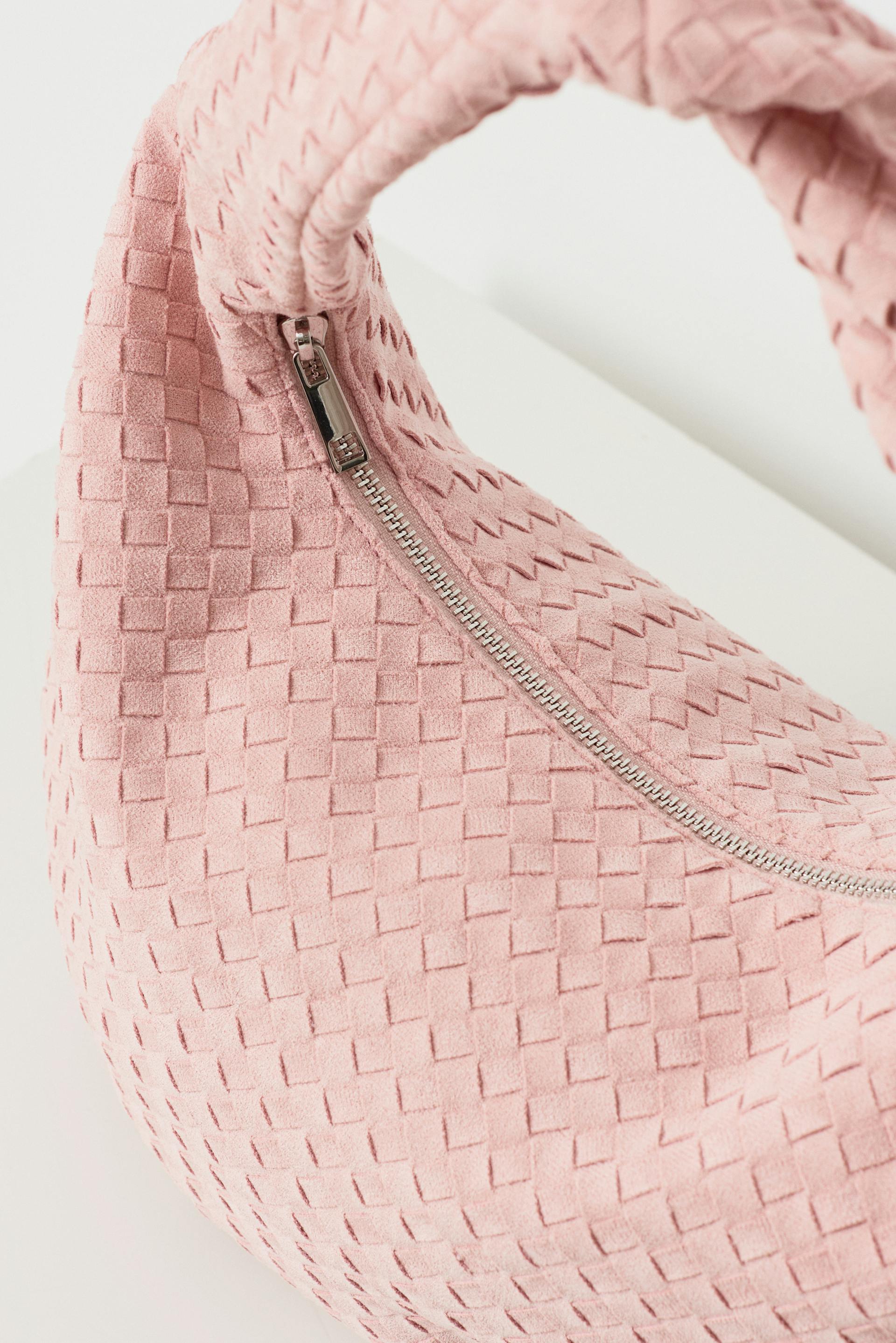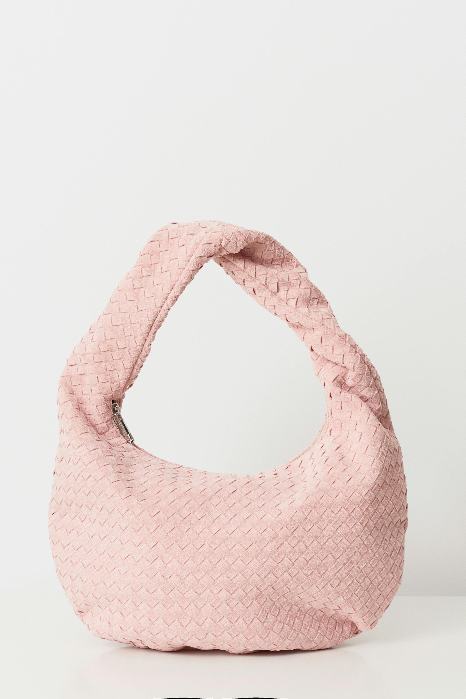 Flettet taske i ruskindsimitation med snoet skulderstrop. Tasken er pink og har lynlåslukning på toppen.