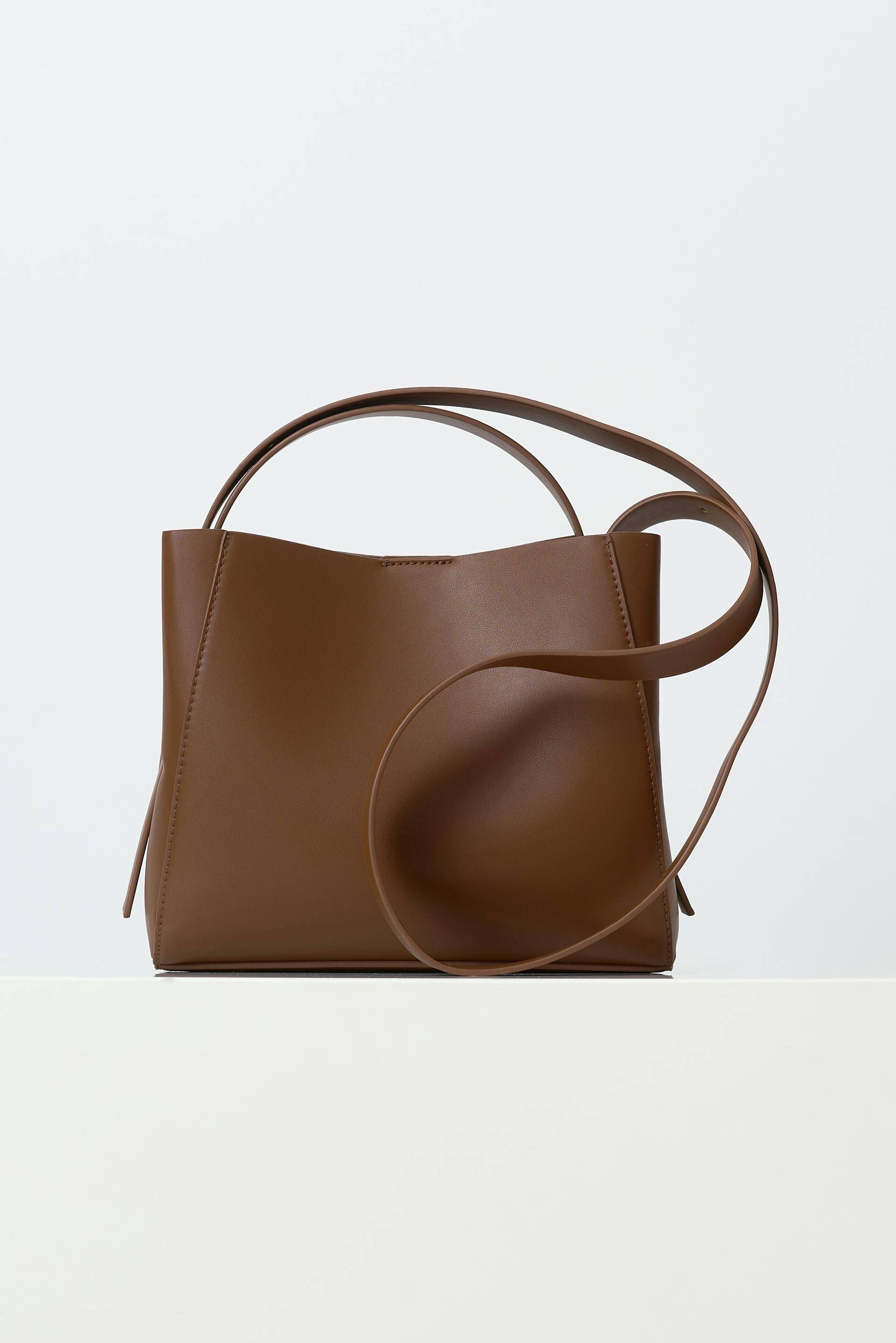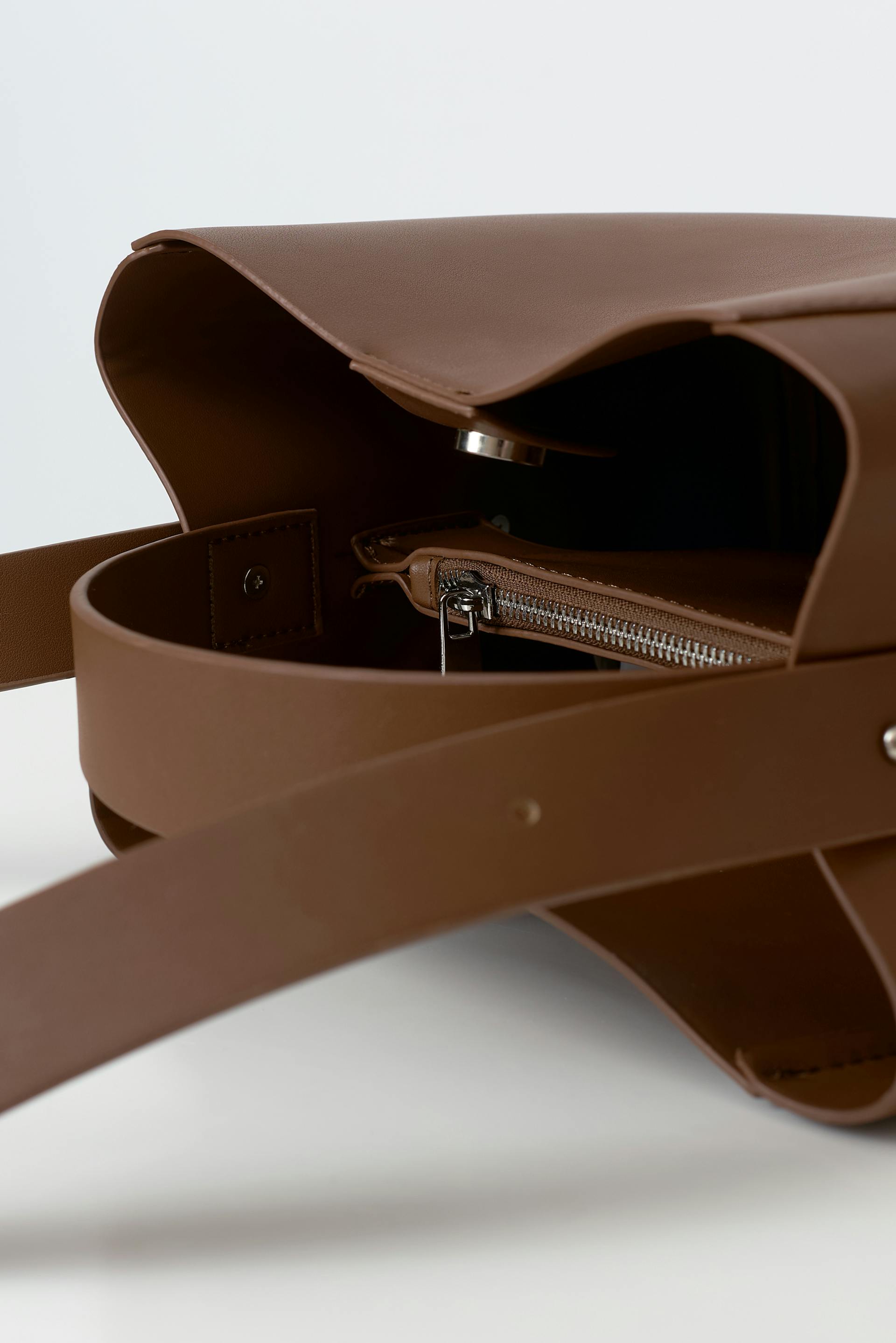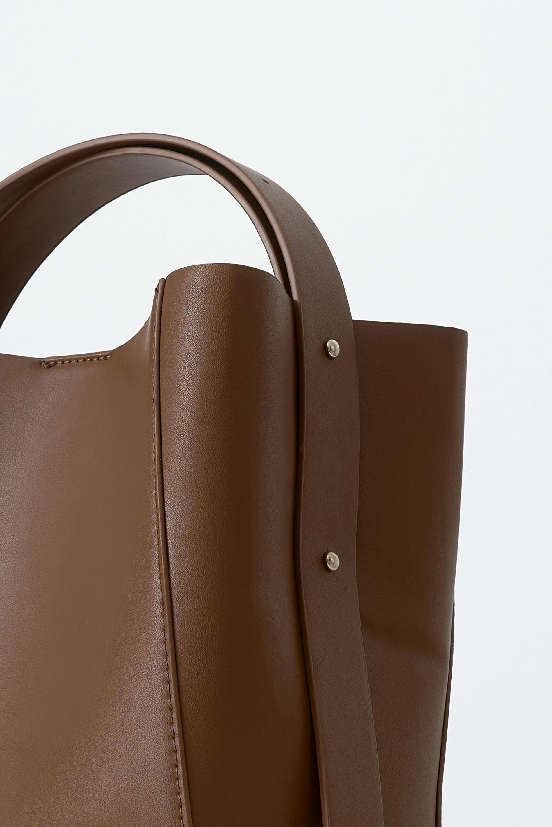 Skuldertaske i imiteret læder med håndtag på toppen. Tasken er brun og har lang skulderstrop. Den har magnetlukning og inderrum med lynlås.