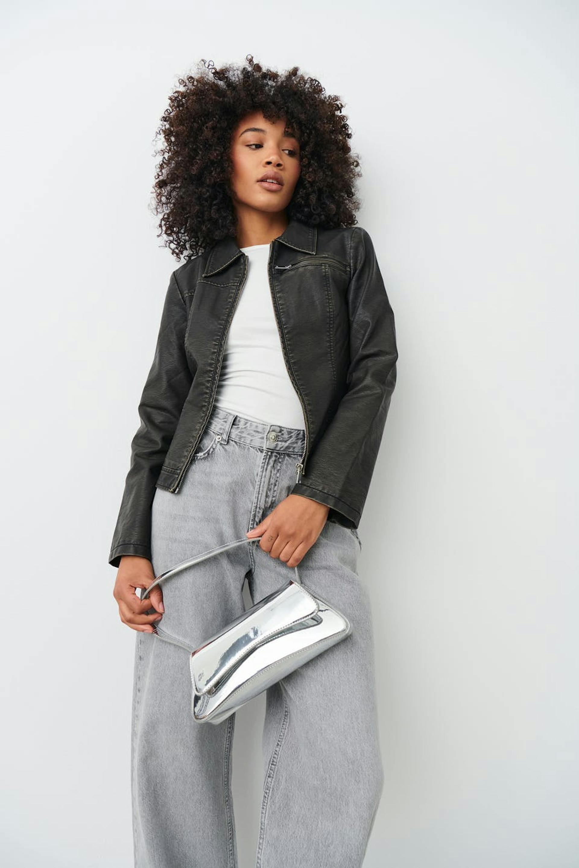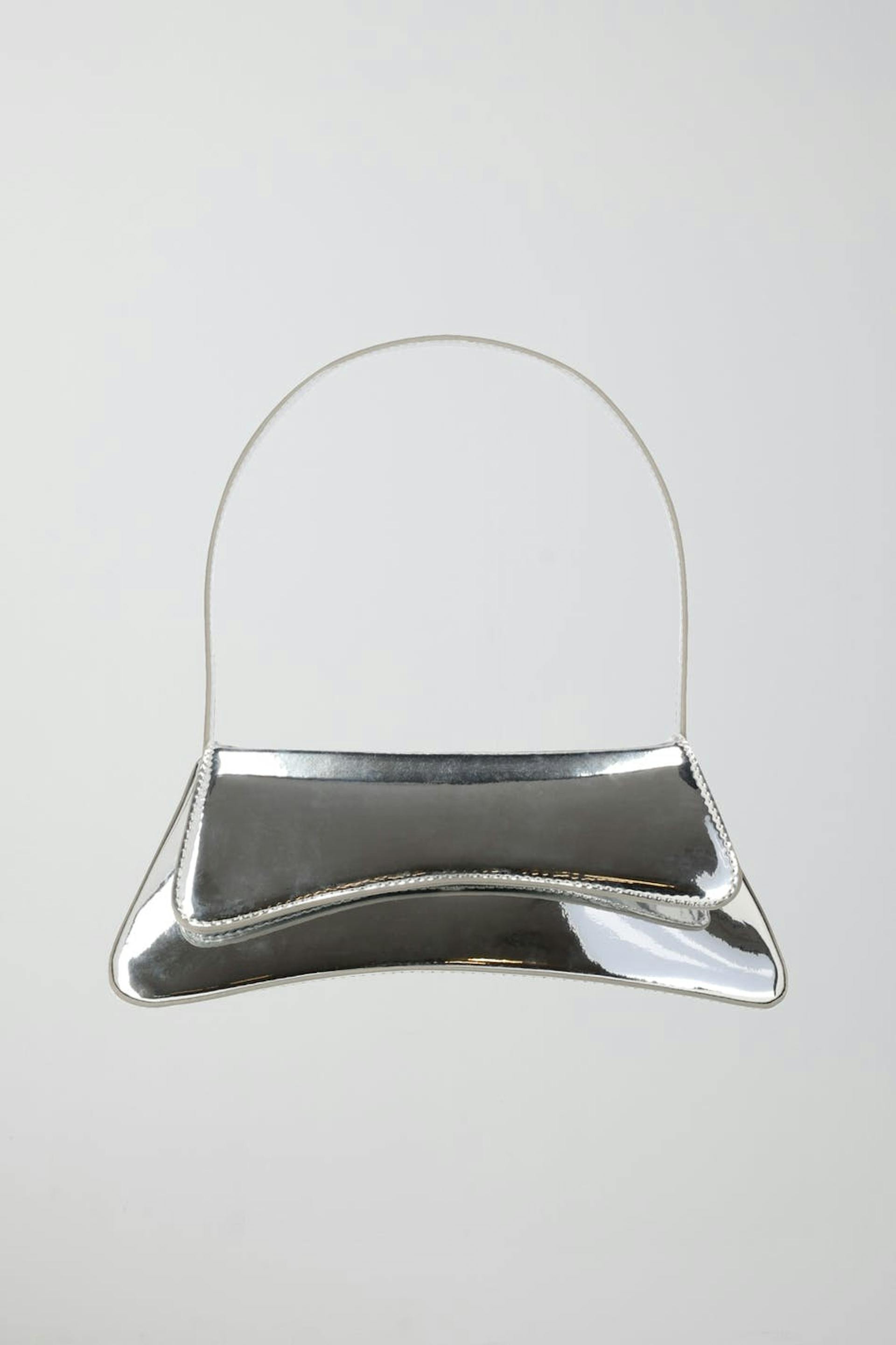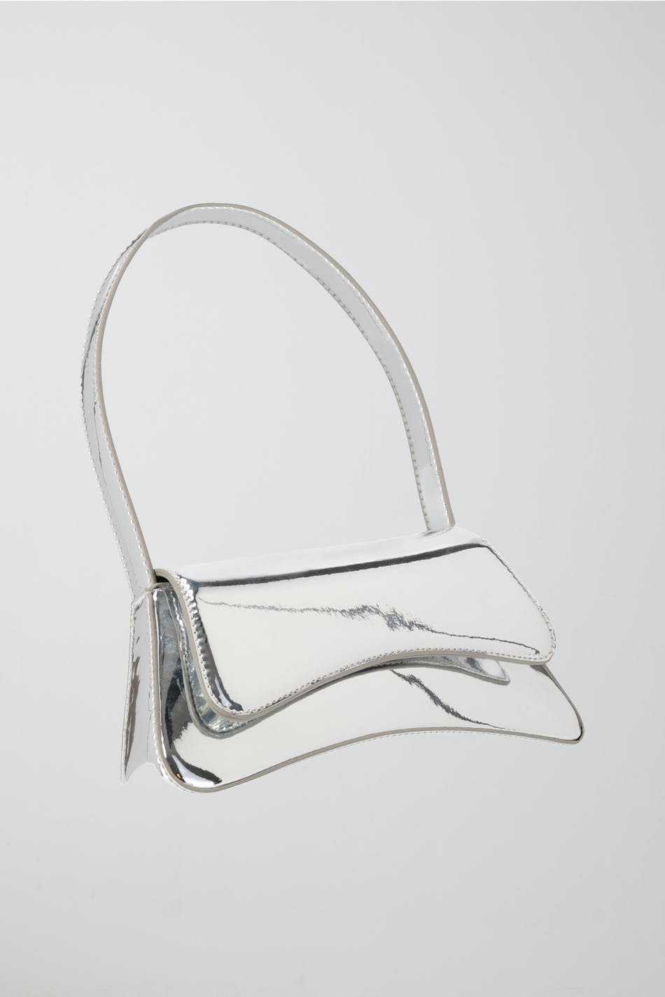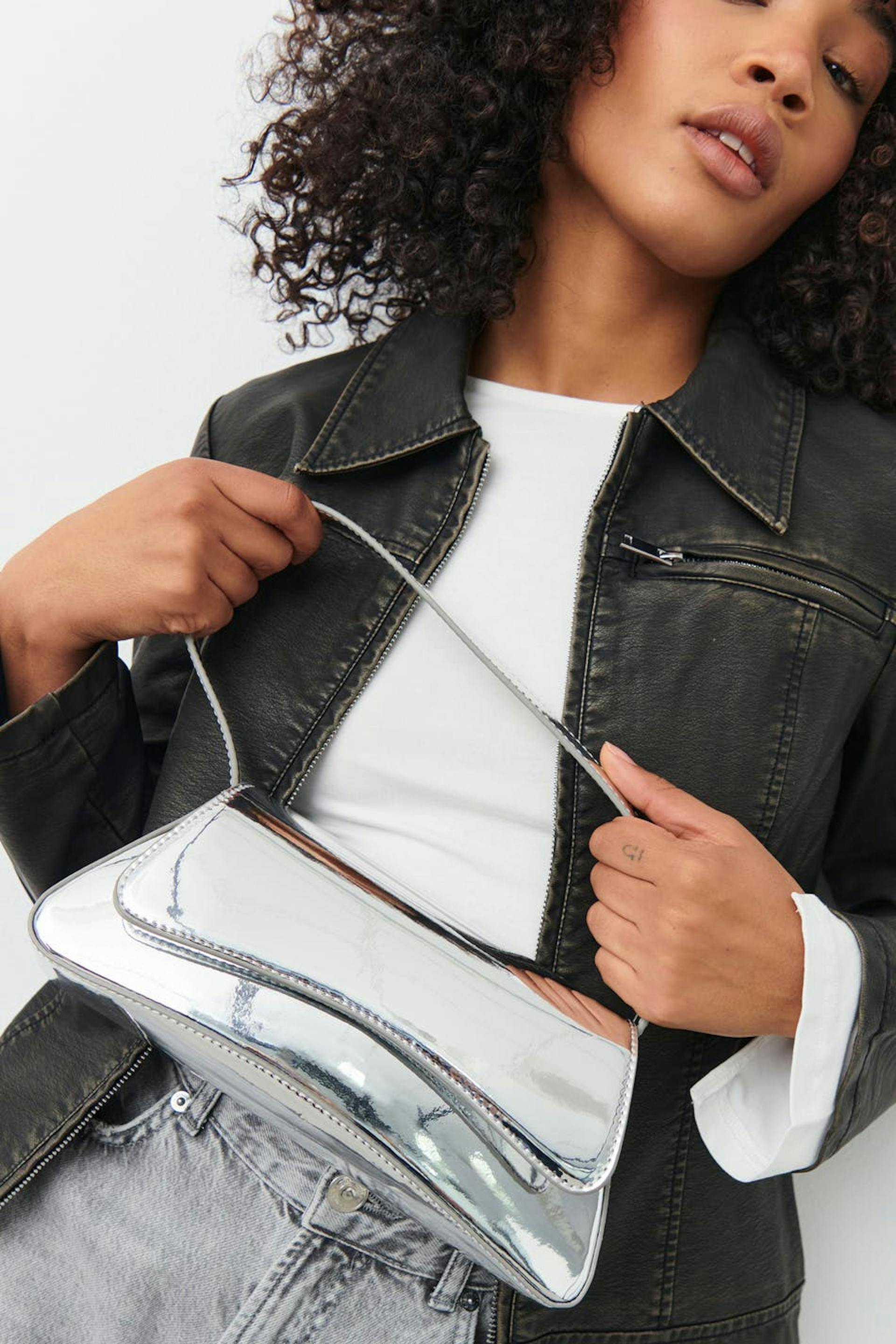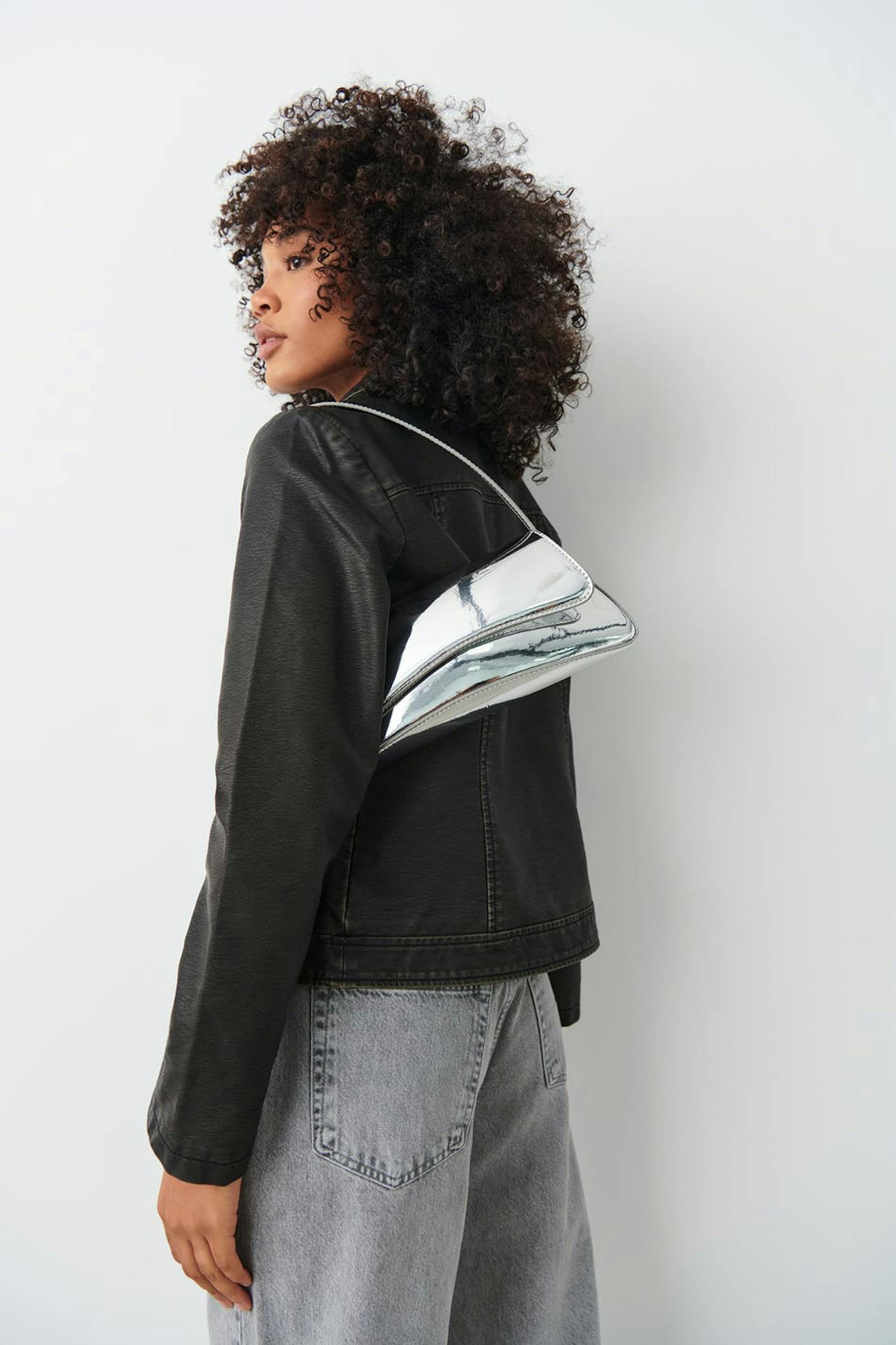 Metallic taske i imiteret læder med låg. Tasken er sølvfarvet og har sporty design. Den har kort skulderstrop og lukning med magnetisk lukning.