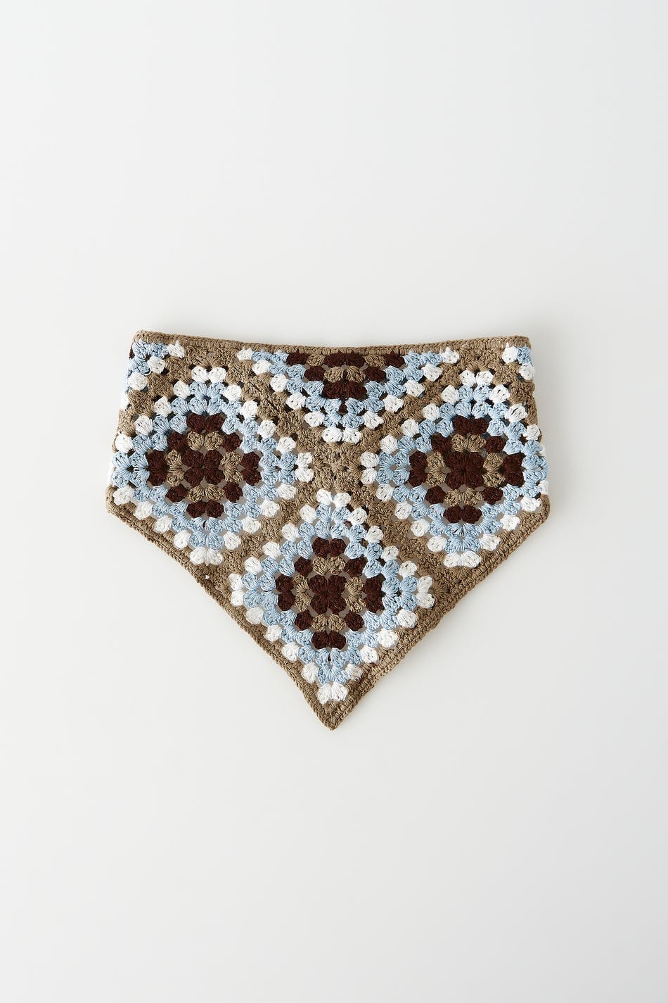 Strikket tørklæde med bindbart bånd bagpå. Tørklædet er blåt og har en spids kant nederst.