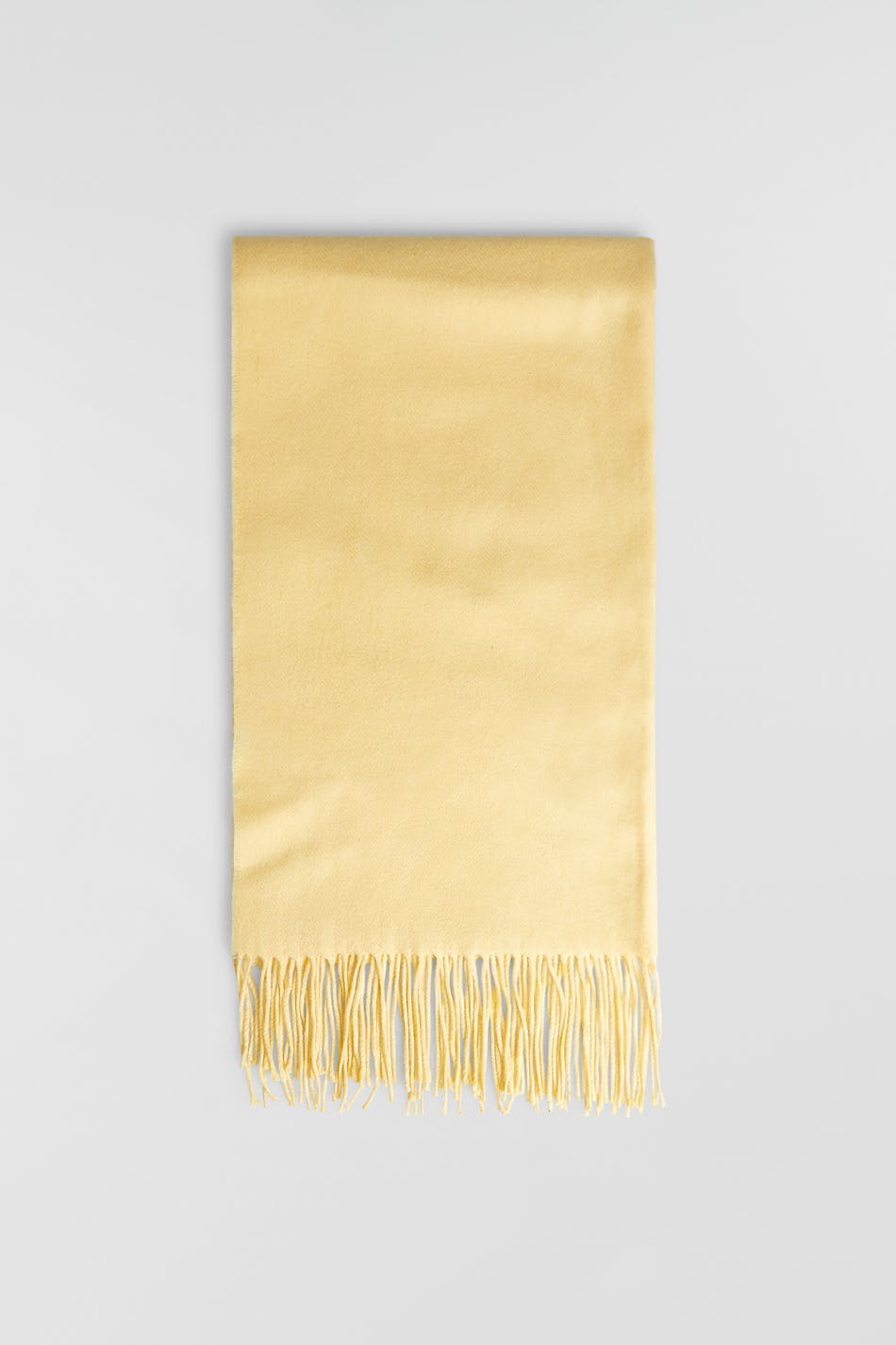 Tørklæde med frynser på de korte sider. Tørklædet er gult.