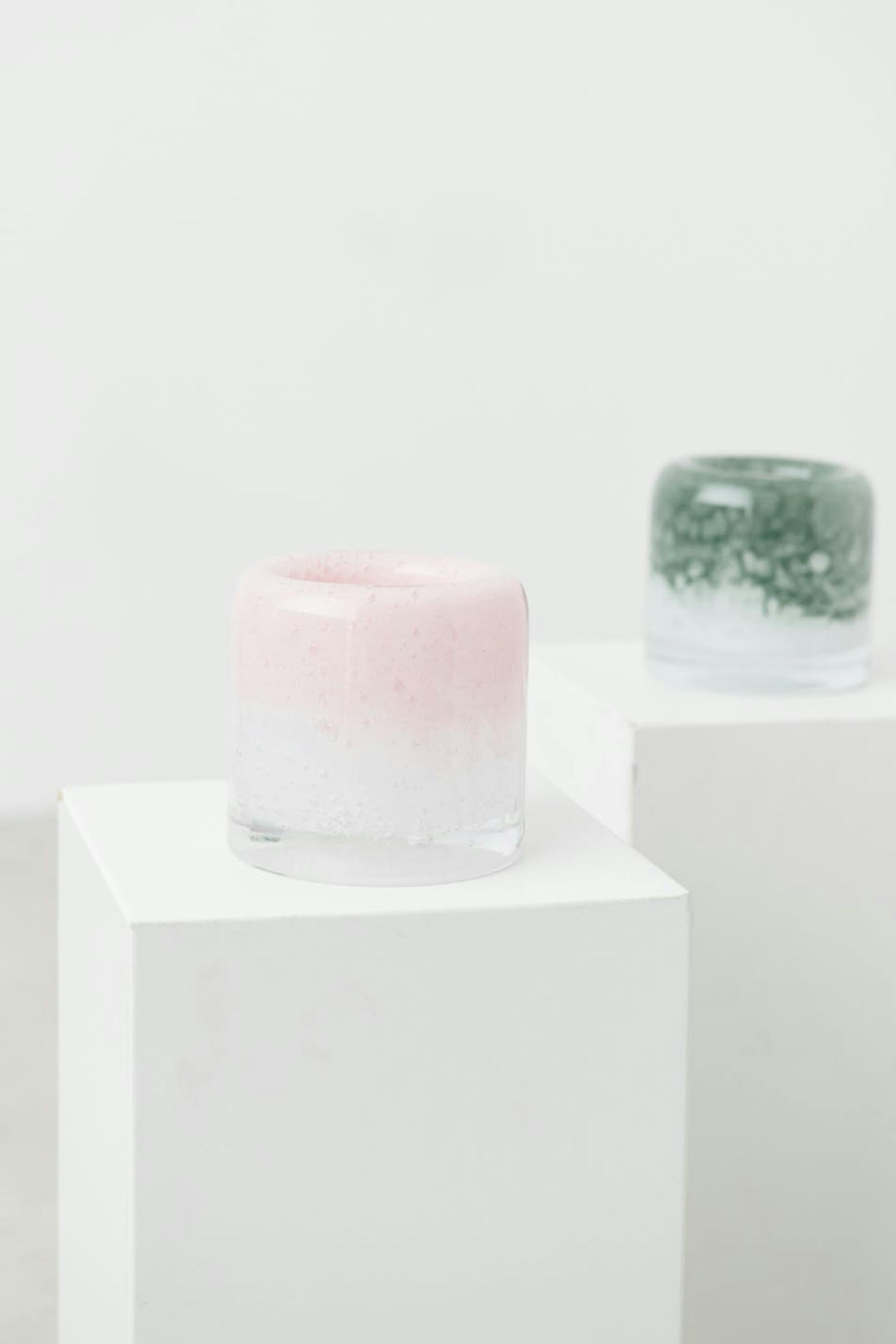 Lyslygte med tonet glas. Lyslygten er pink og har blød, afrundet kant.