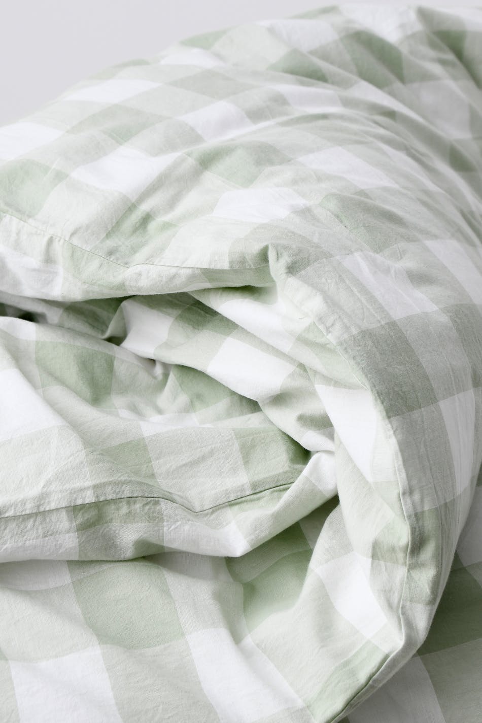 Ternet sengesæt med et blødt materiale i bomuld. Sengesættet er grønt og har et dynebetræk med et matchende pudebetræk.