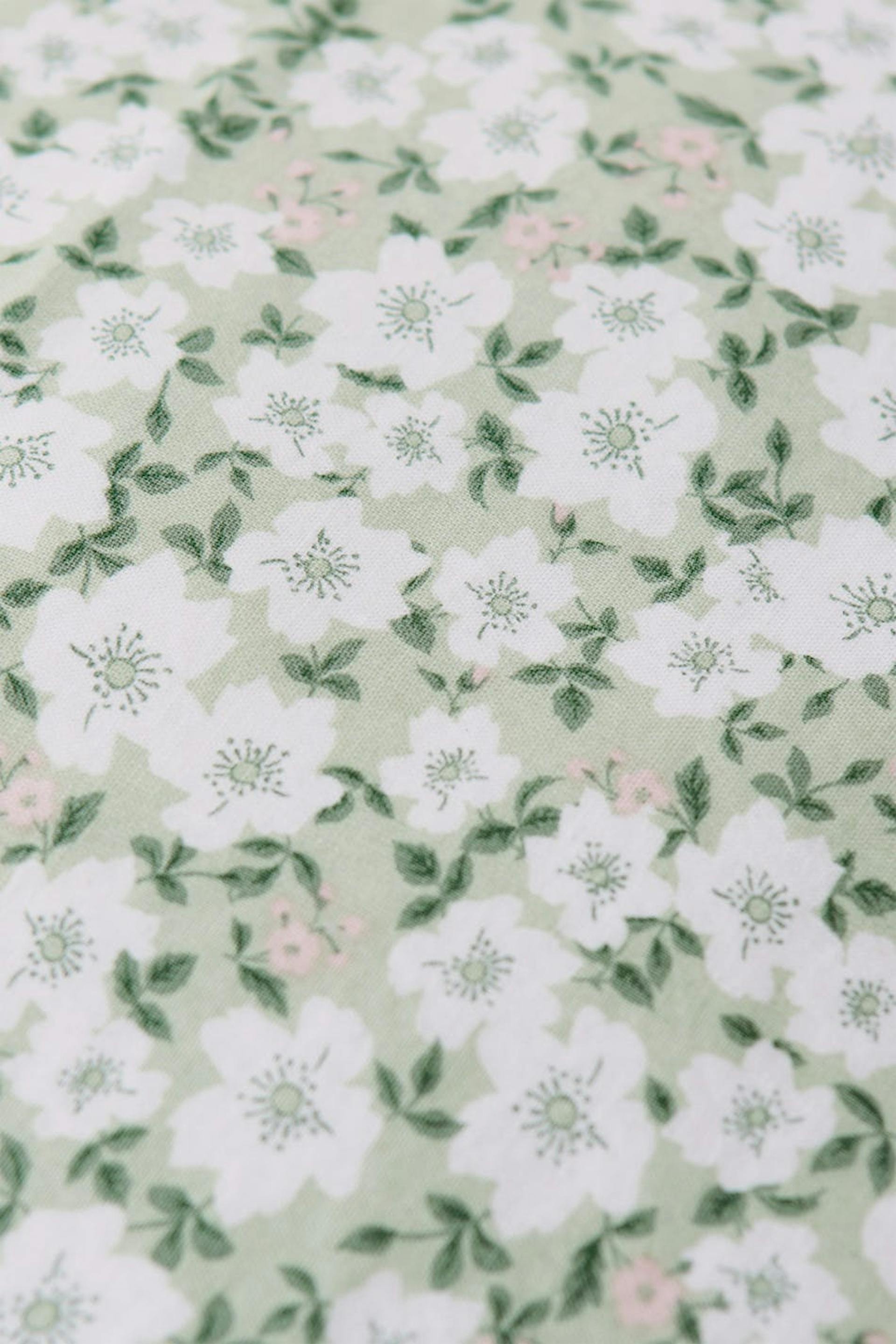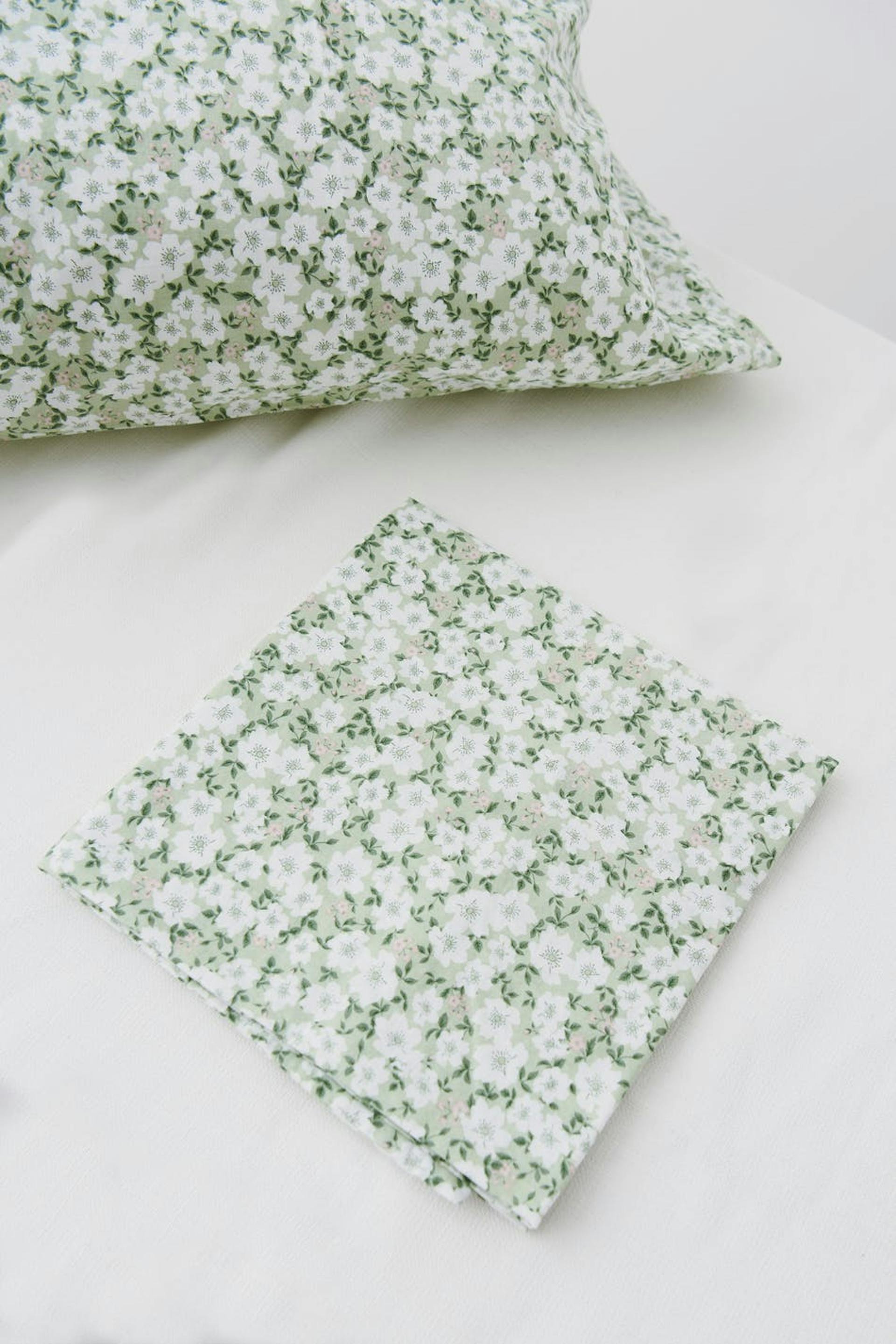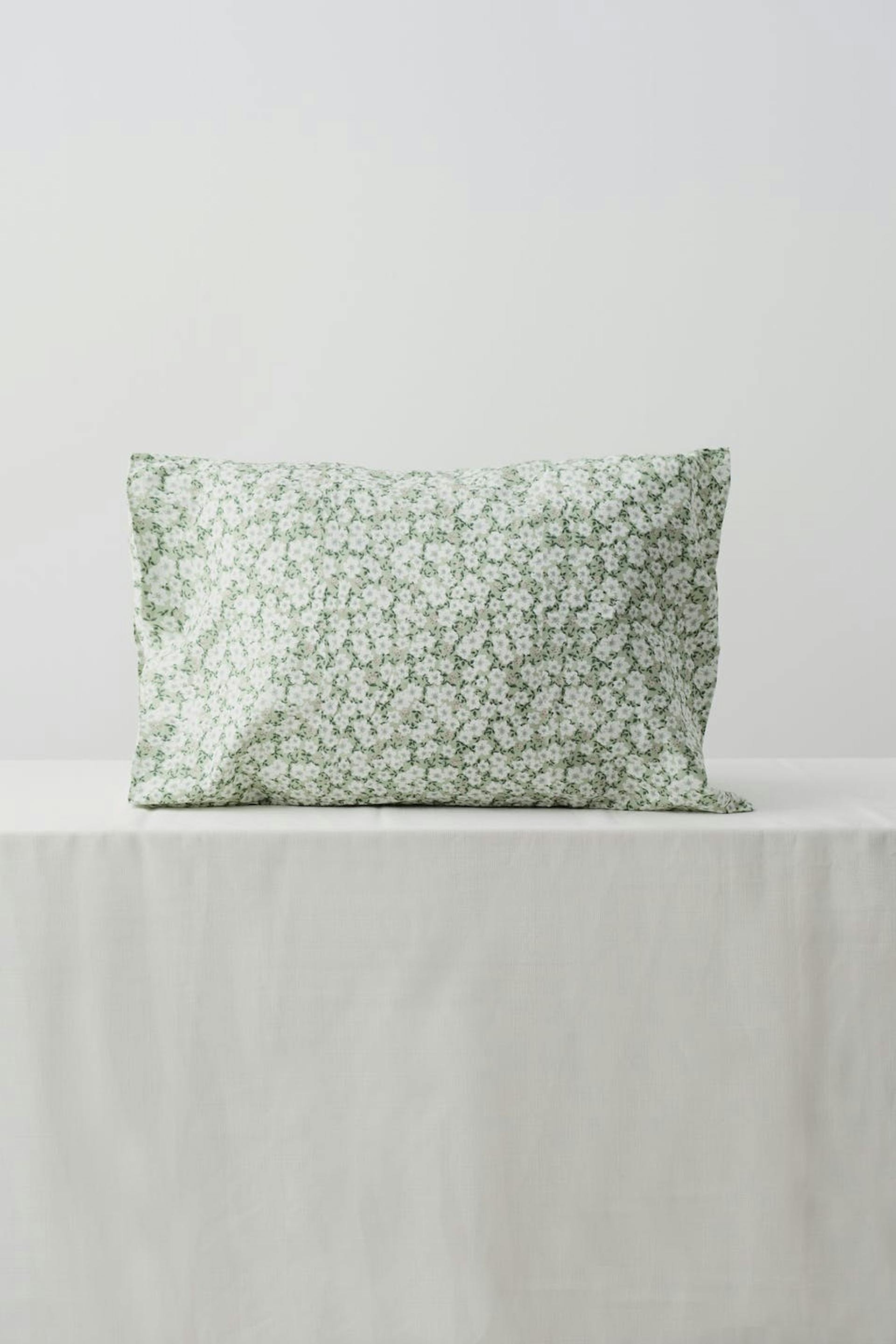 Blomstret pudebetræk fra Gina Home i blød bomuld. Pudebetrækket er grønt.