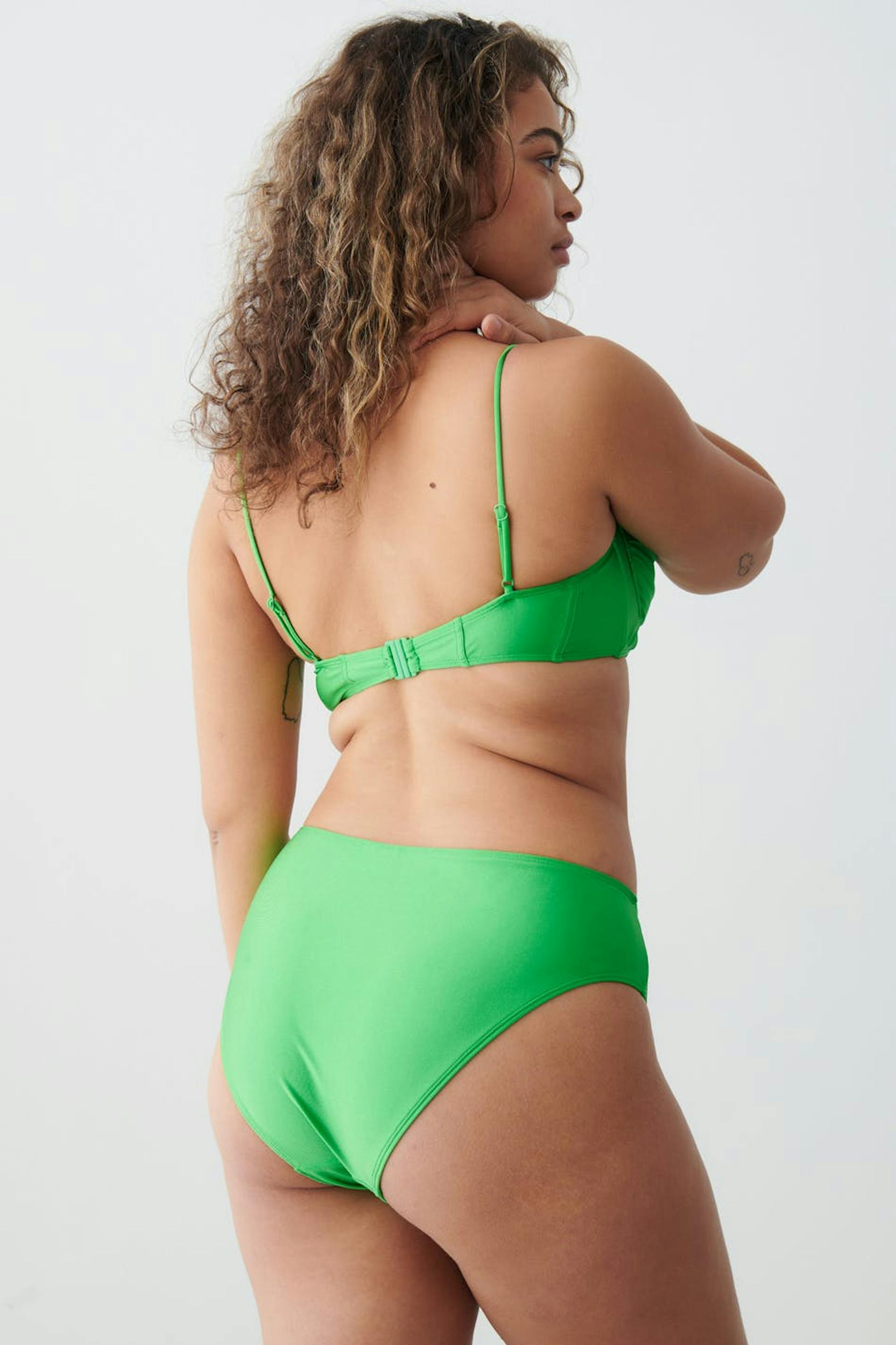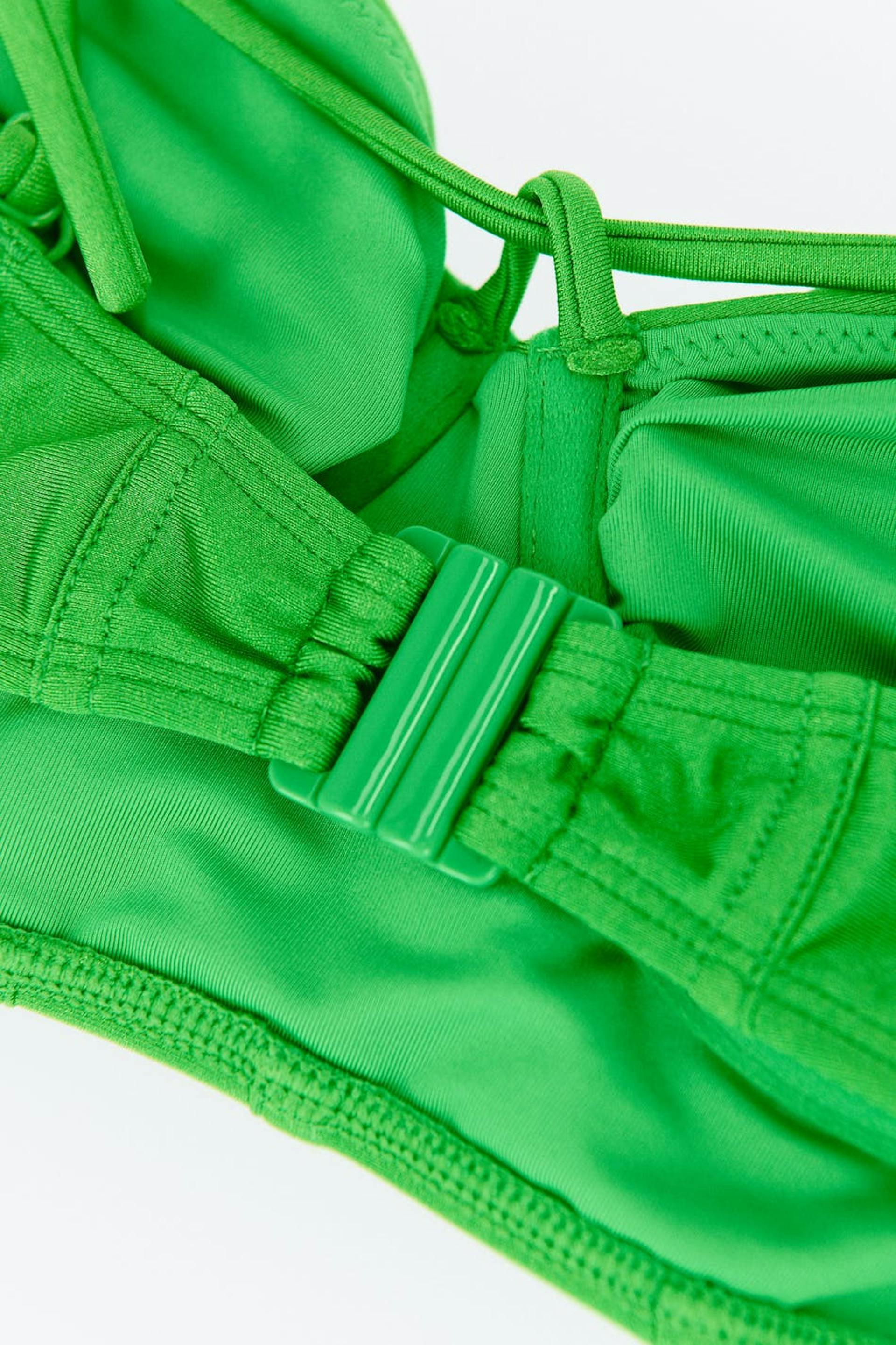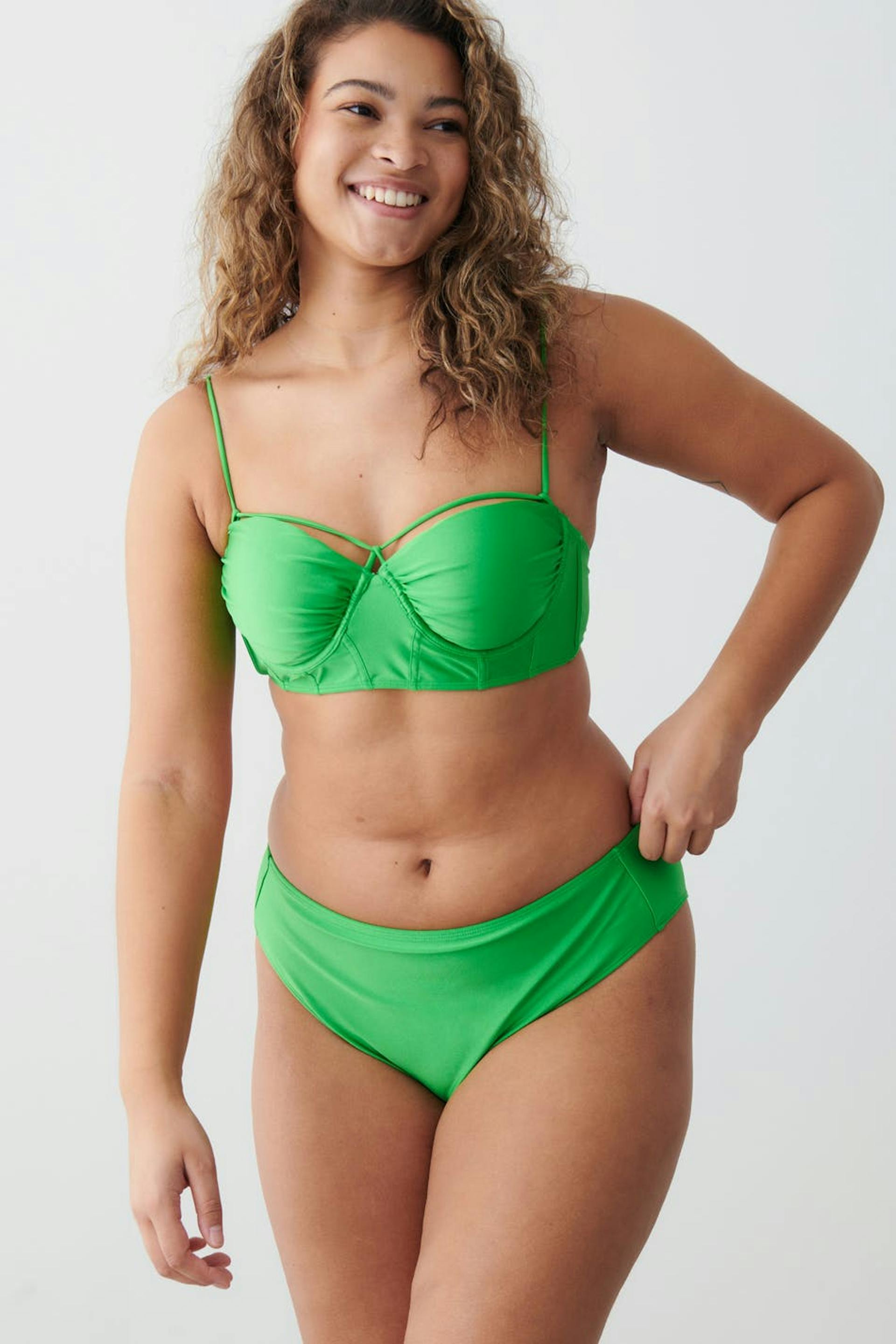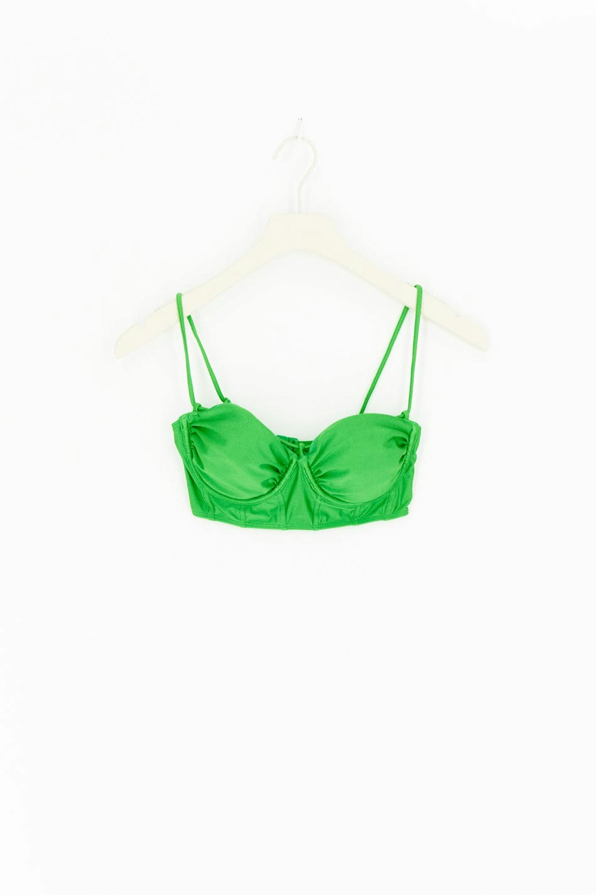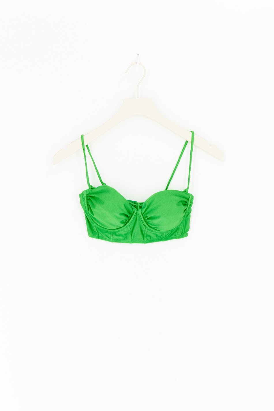 Bikini-BH med justérbare, aftagelige skulderstropper. Bikini-BH'en er grøn og har korsetlignende detalje under brystet. Den har spænde i ryggen og bøjlecups med aftagelig polstring.
